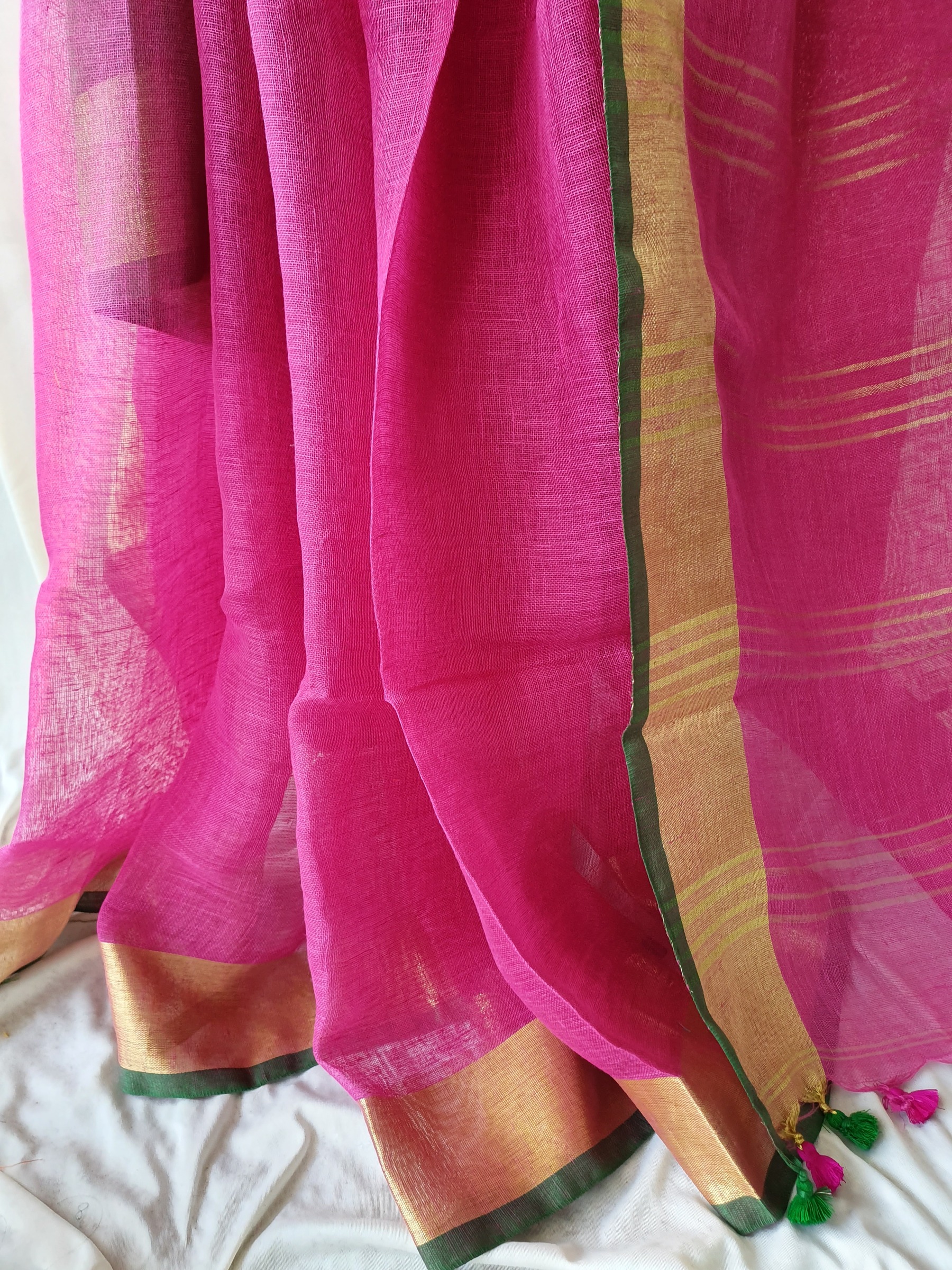 Linen cotton saree with gold border and contrast colour blouse material and pompoms on pallu.