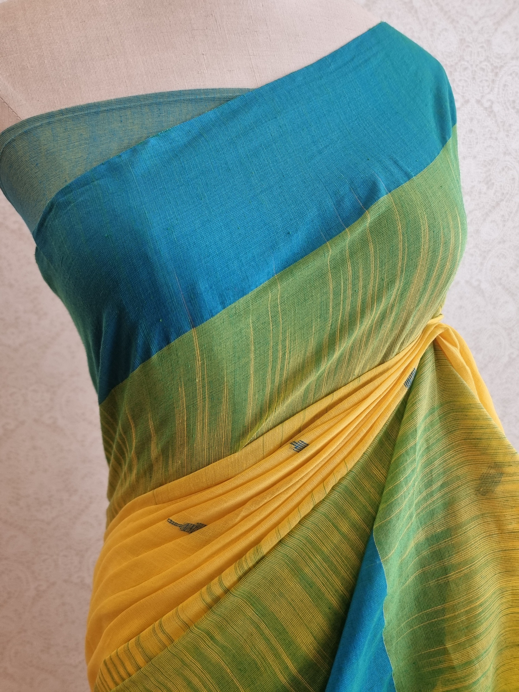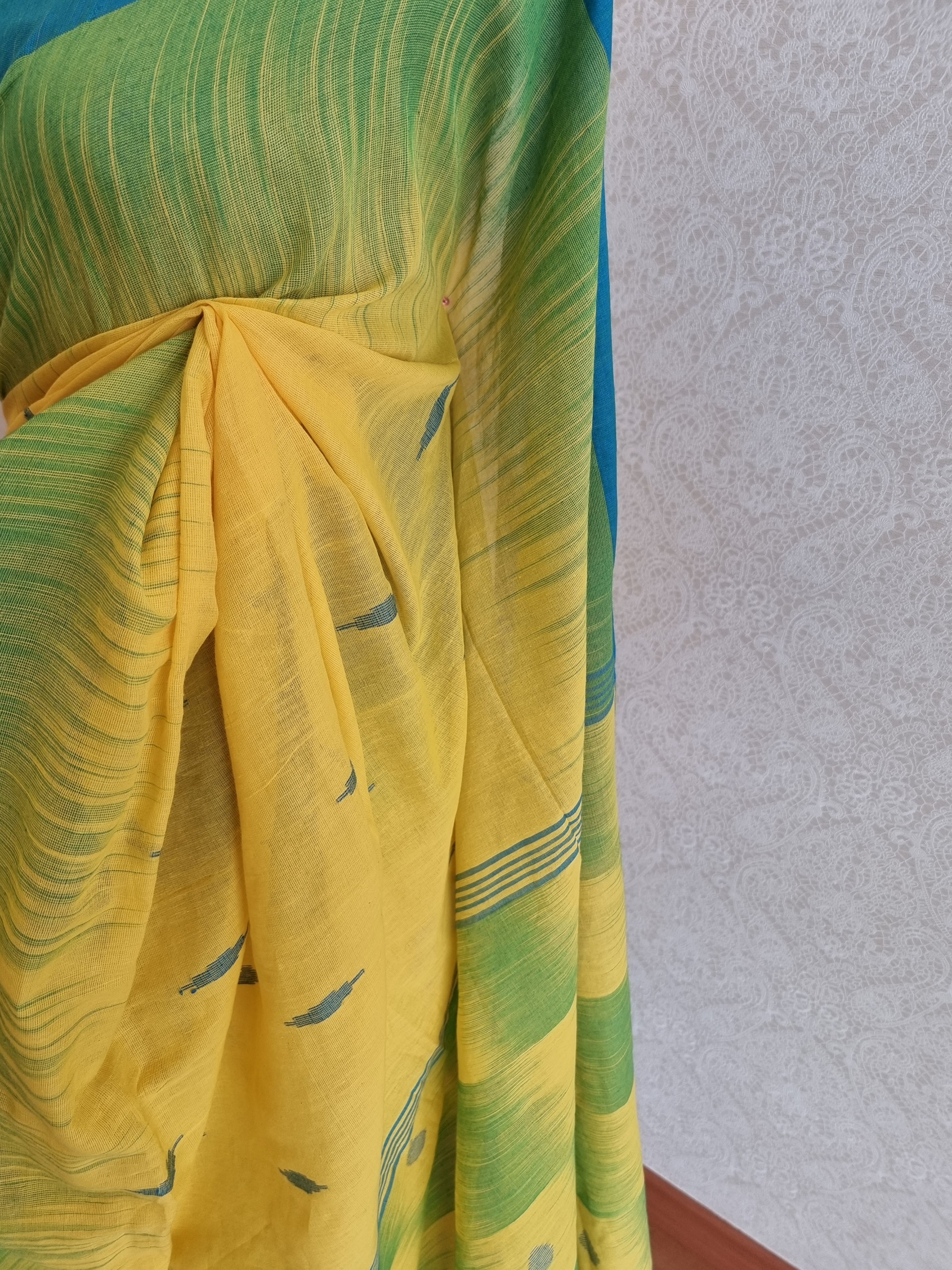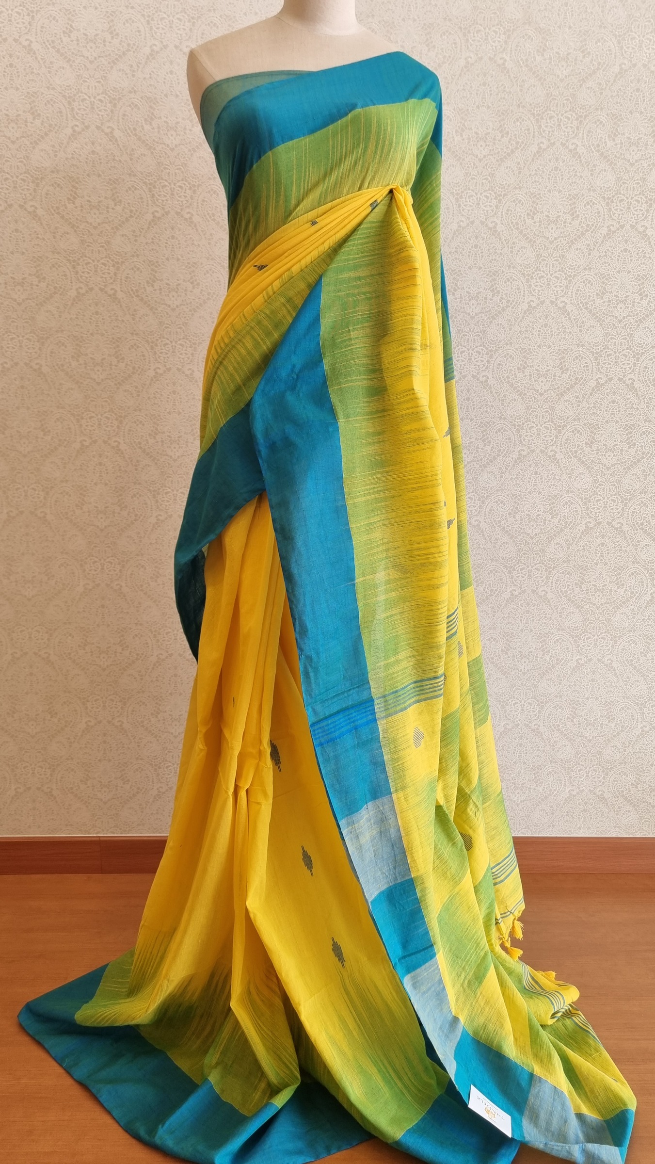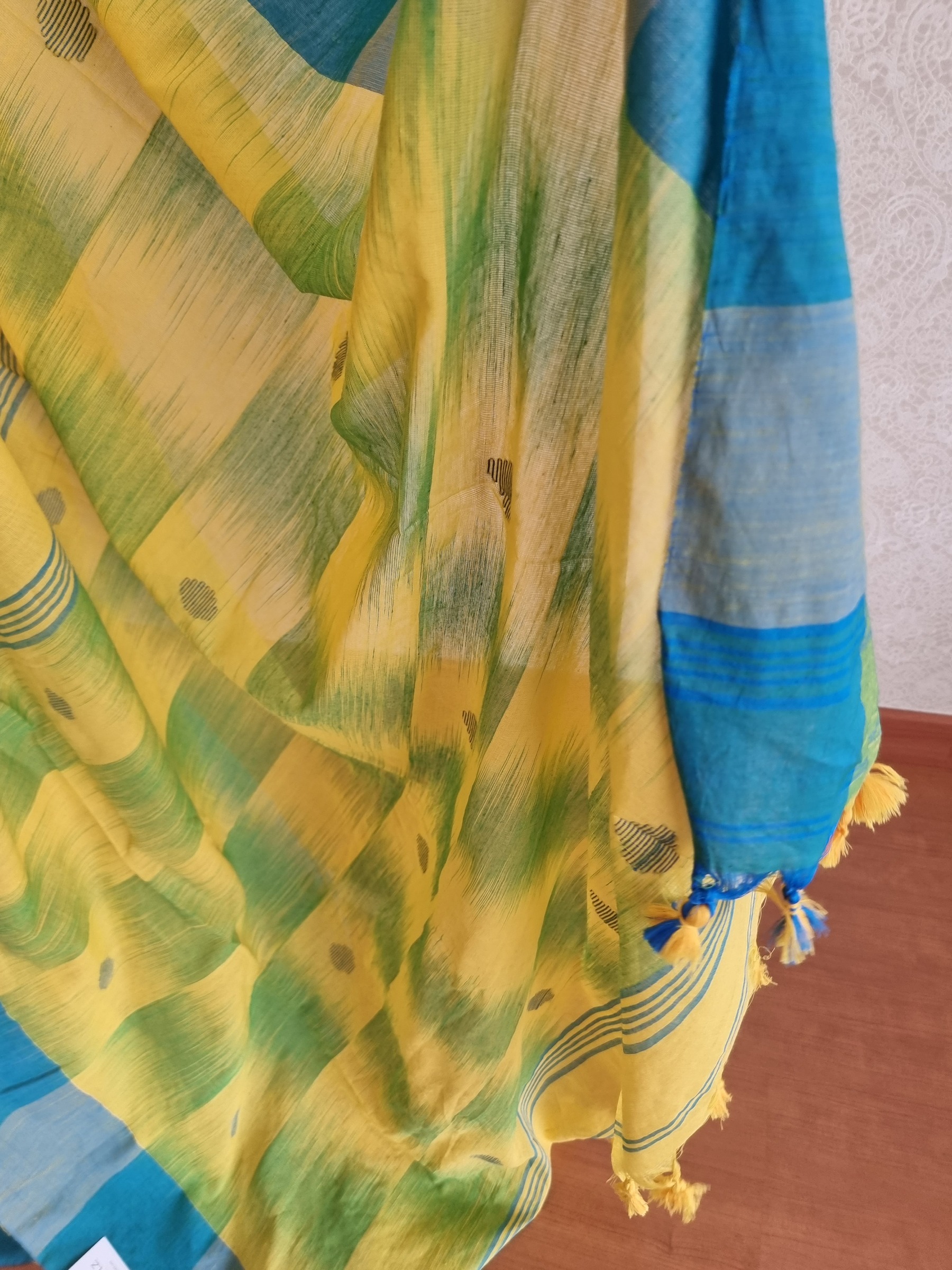 Bengal cotton saree with design on body, contrast colour border and blouse material and pompoms on pallu.