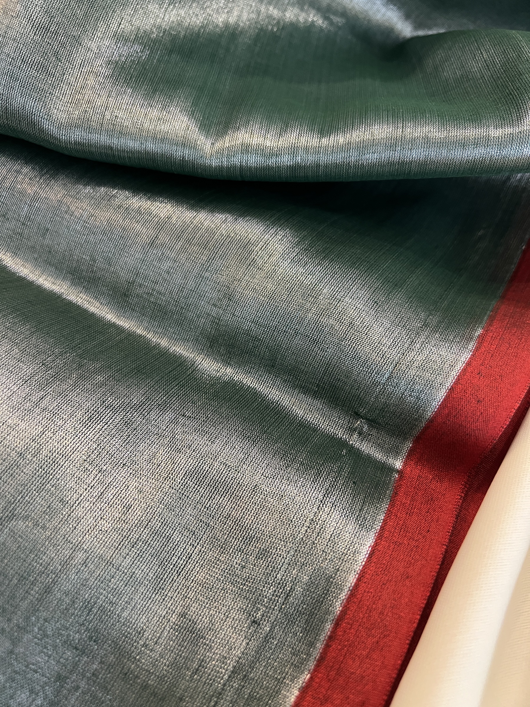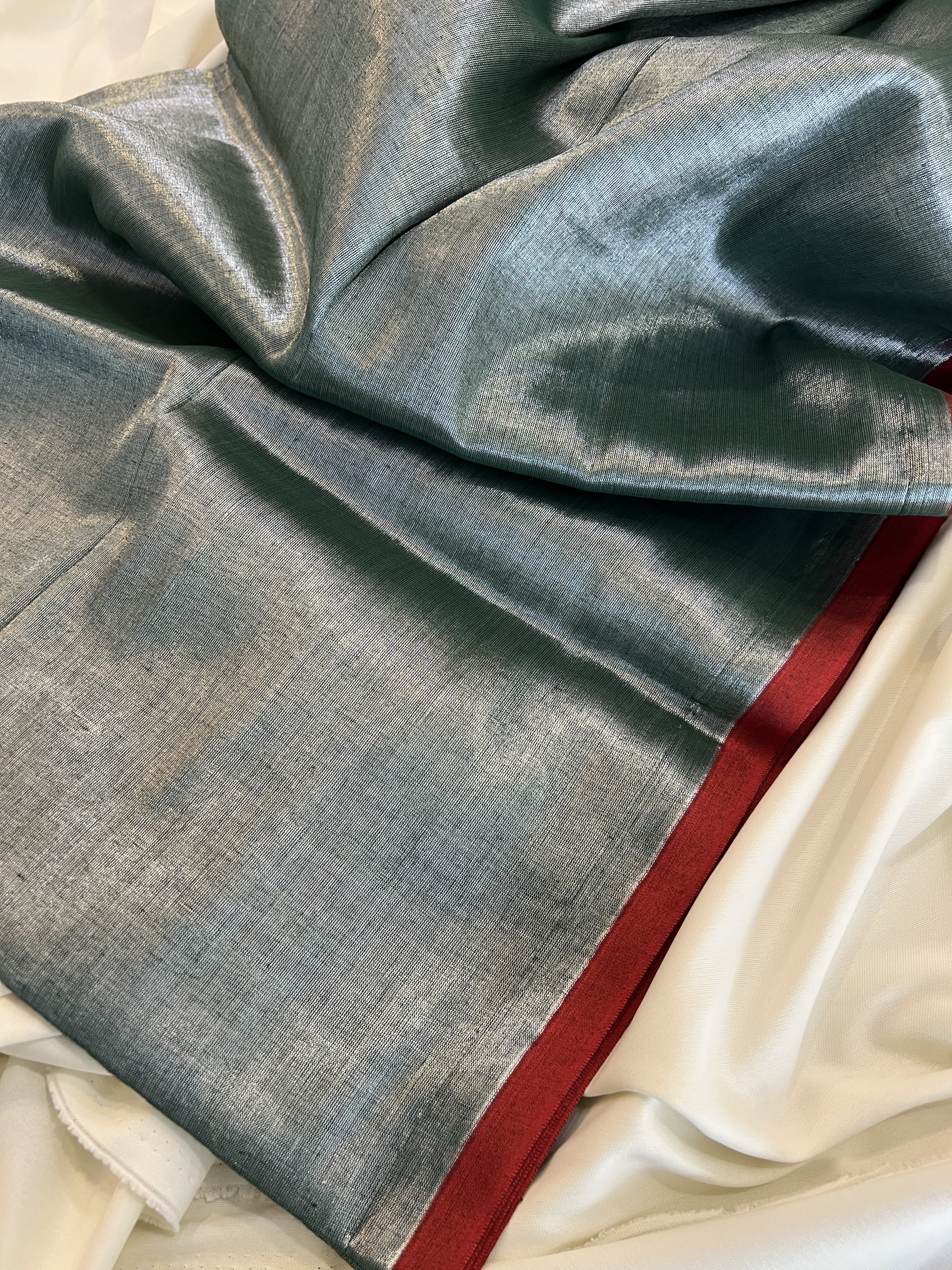 Soft and shimmer tissue cotton saree with contrast colour border and comes with attached running colour blouse material.