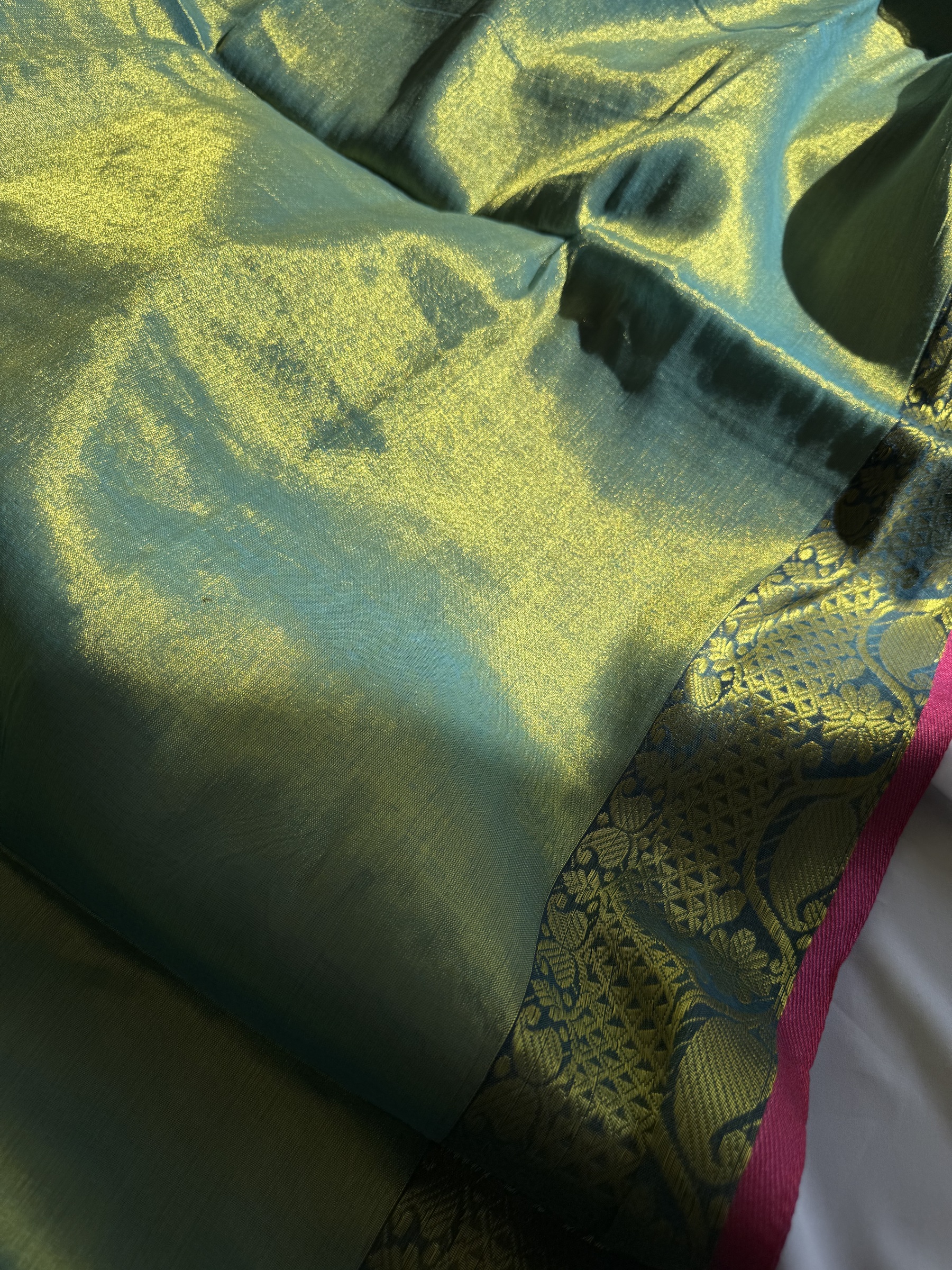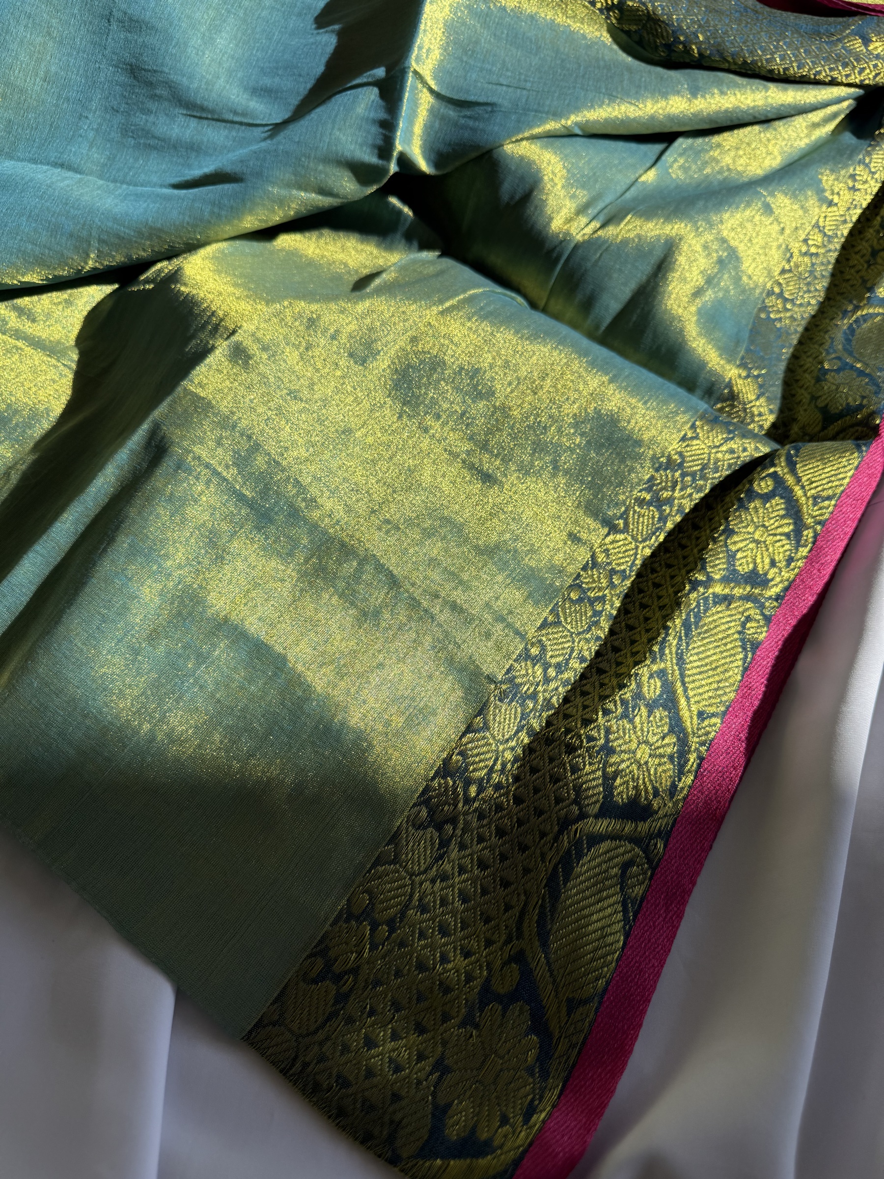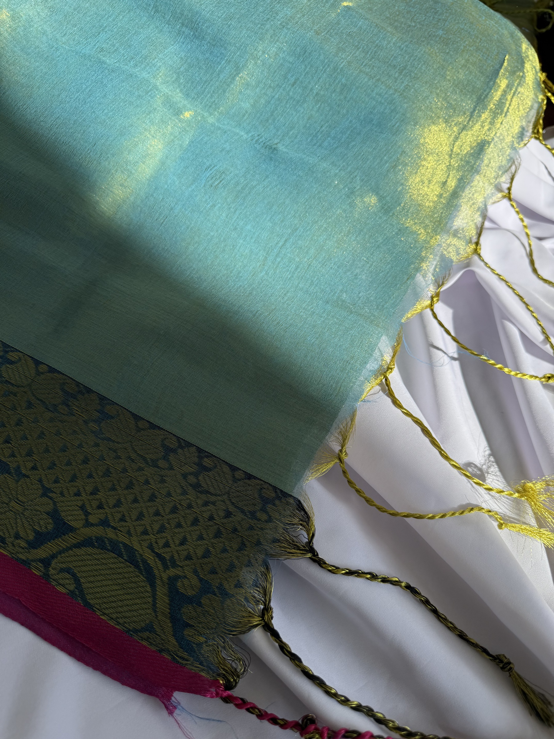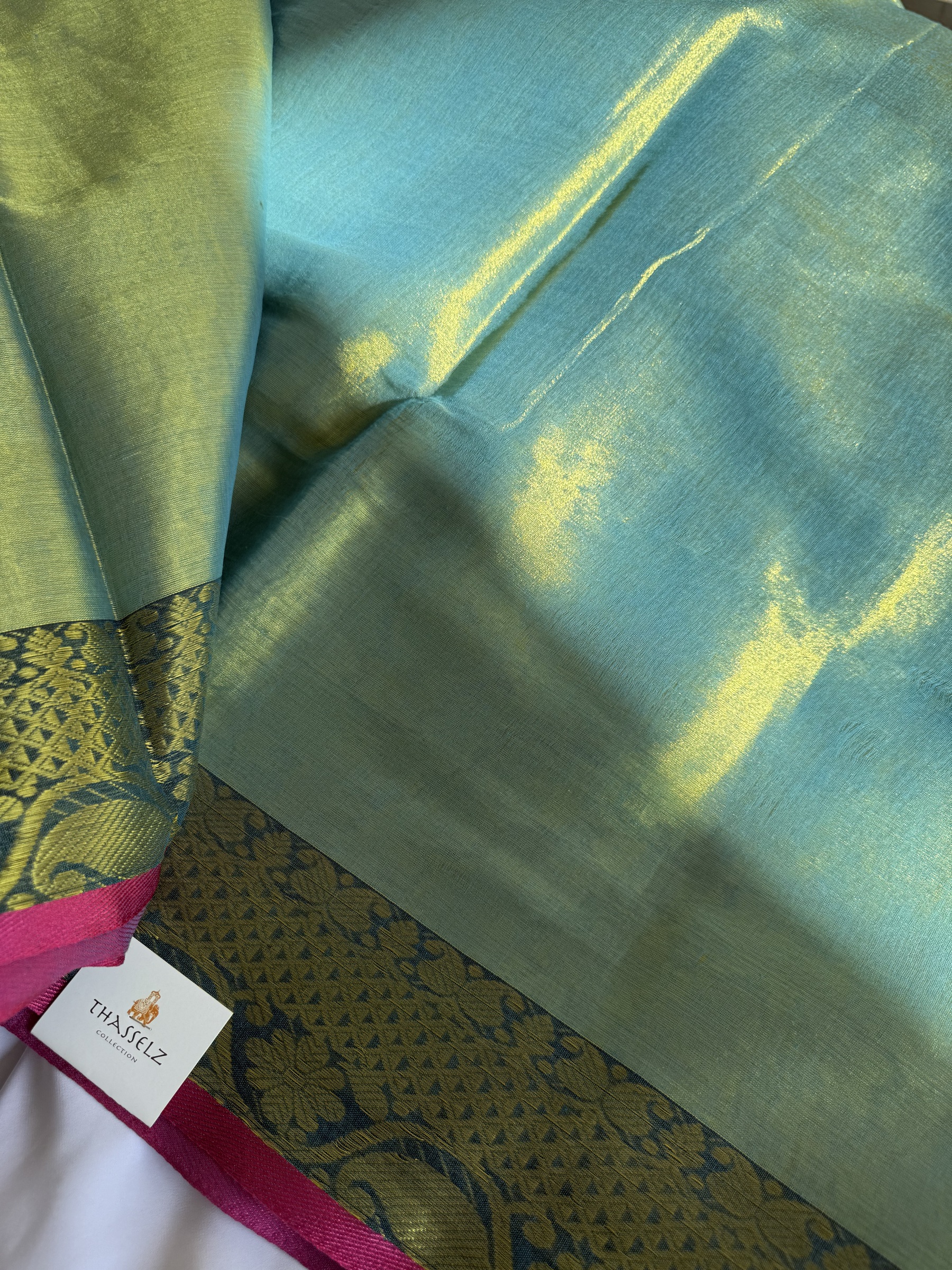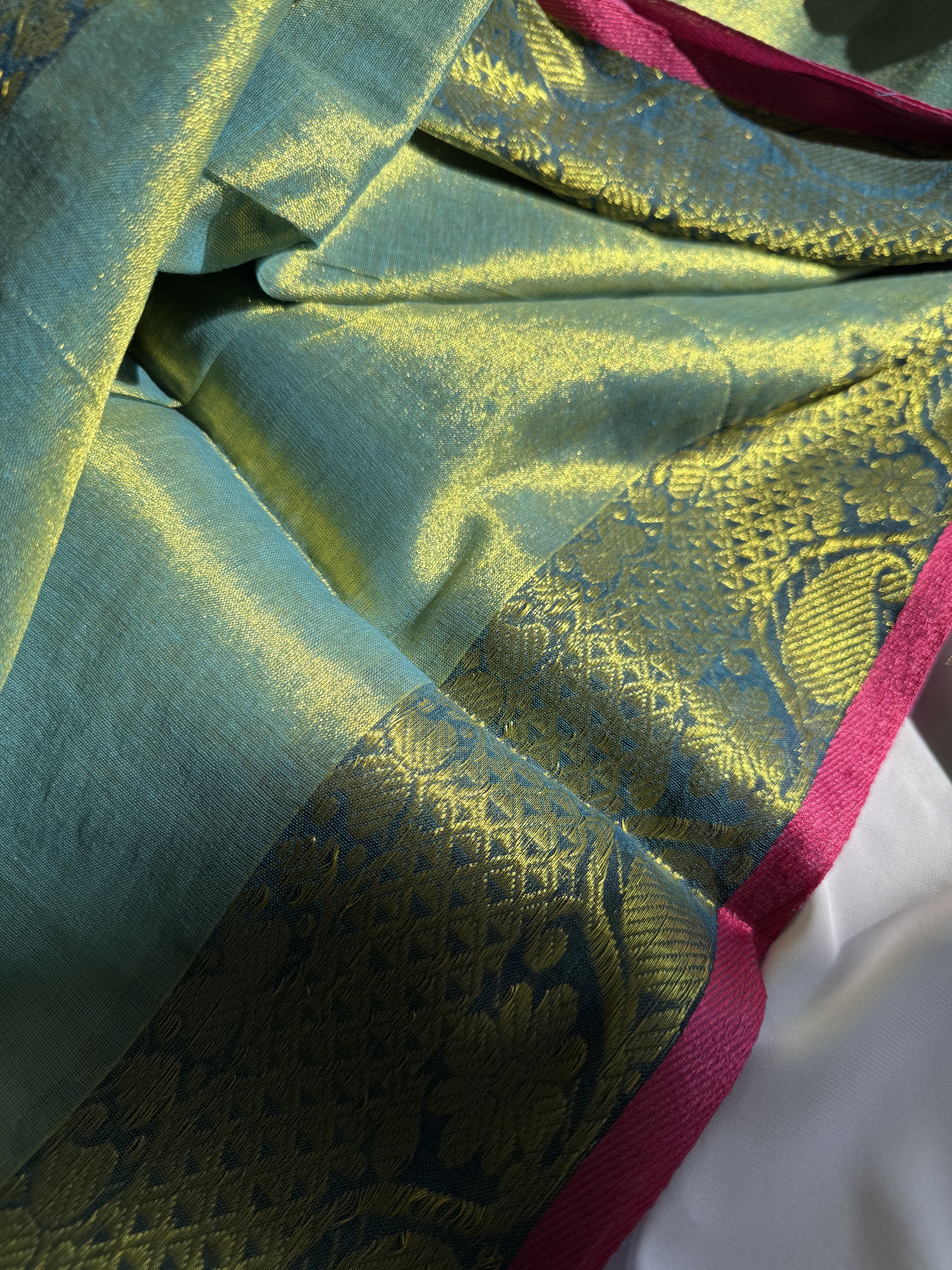Soft and shimmer lighweight tissue cotton saree with contrast border and comes with attached running colour blouse material.