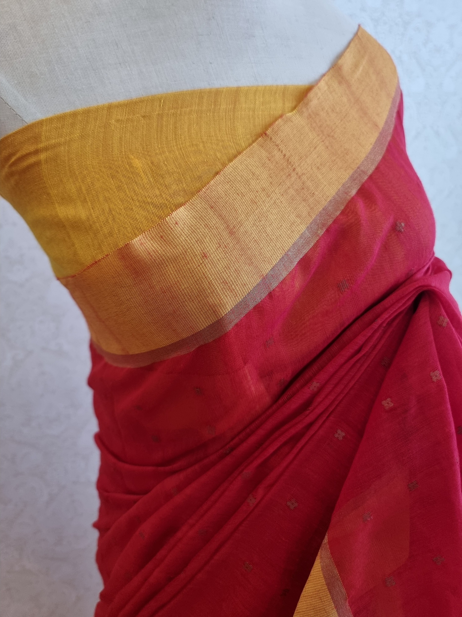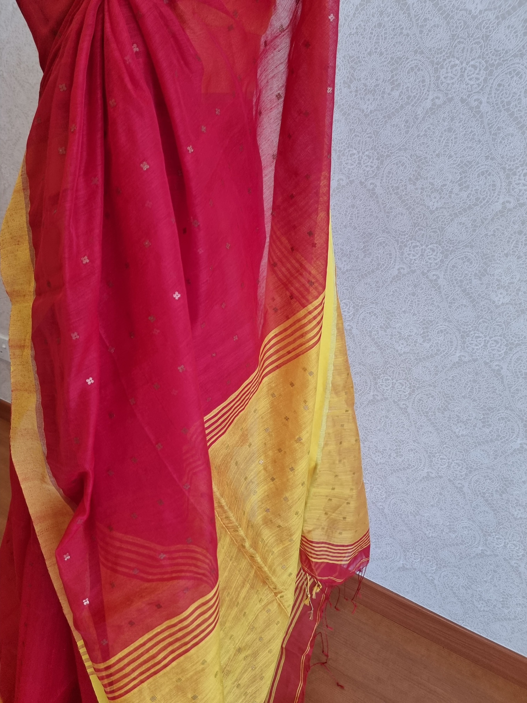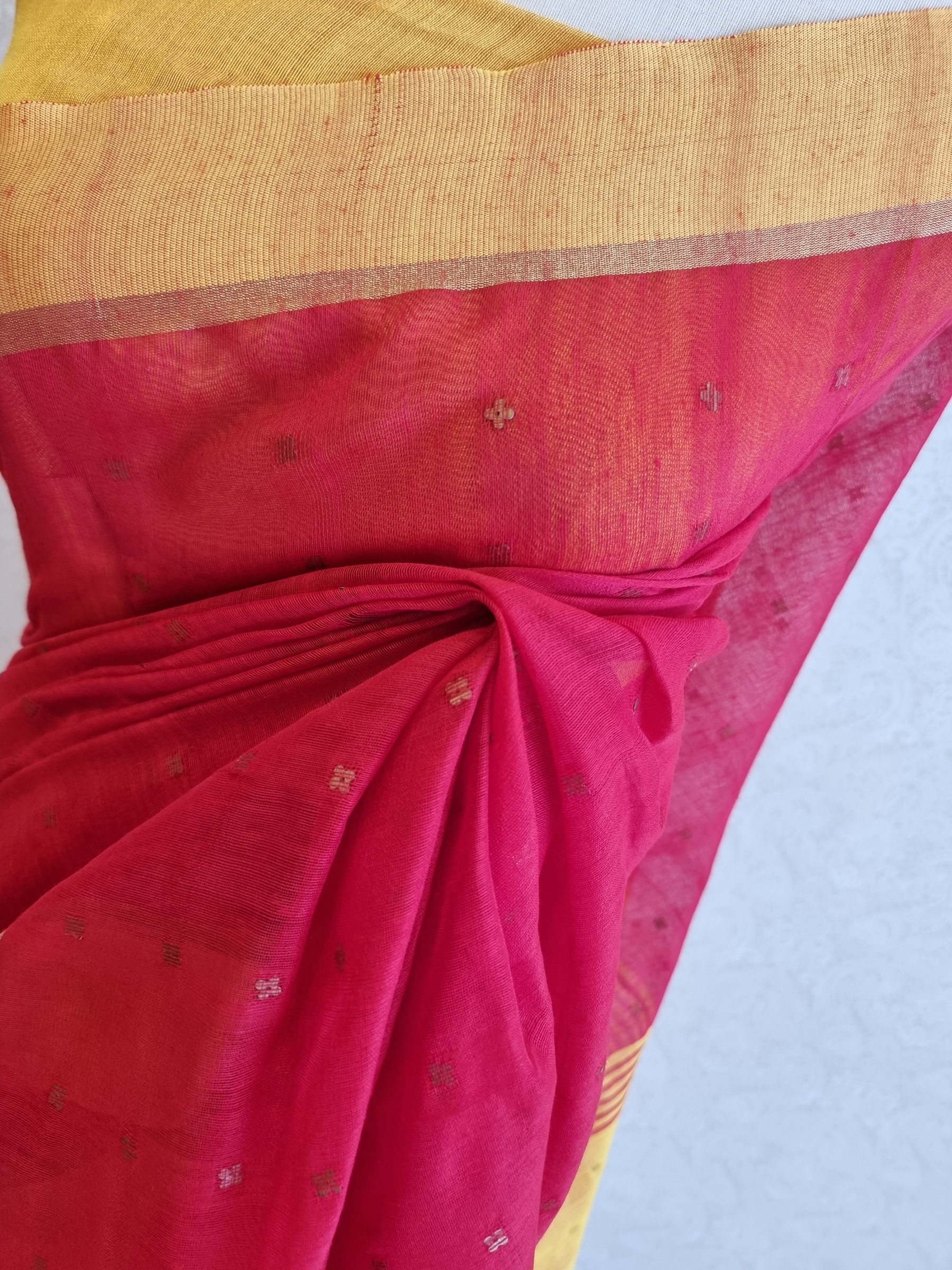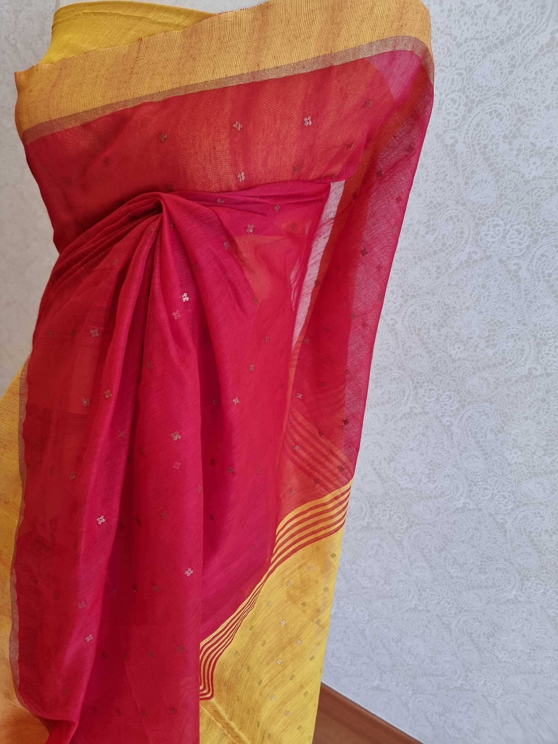 Lighweight and sheer cotton silk mix saree with tiny sequins on body and comes with contrast colour pallu and blouse material.
