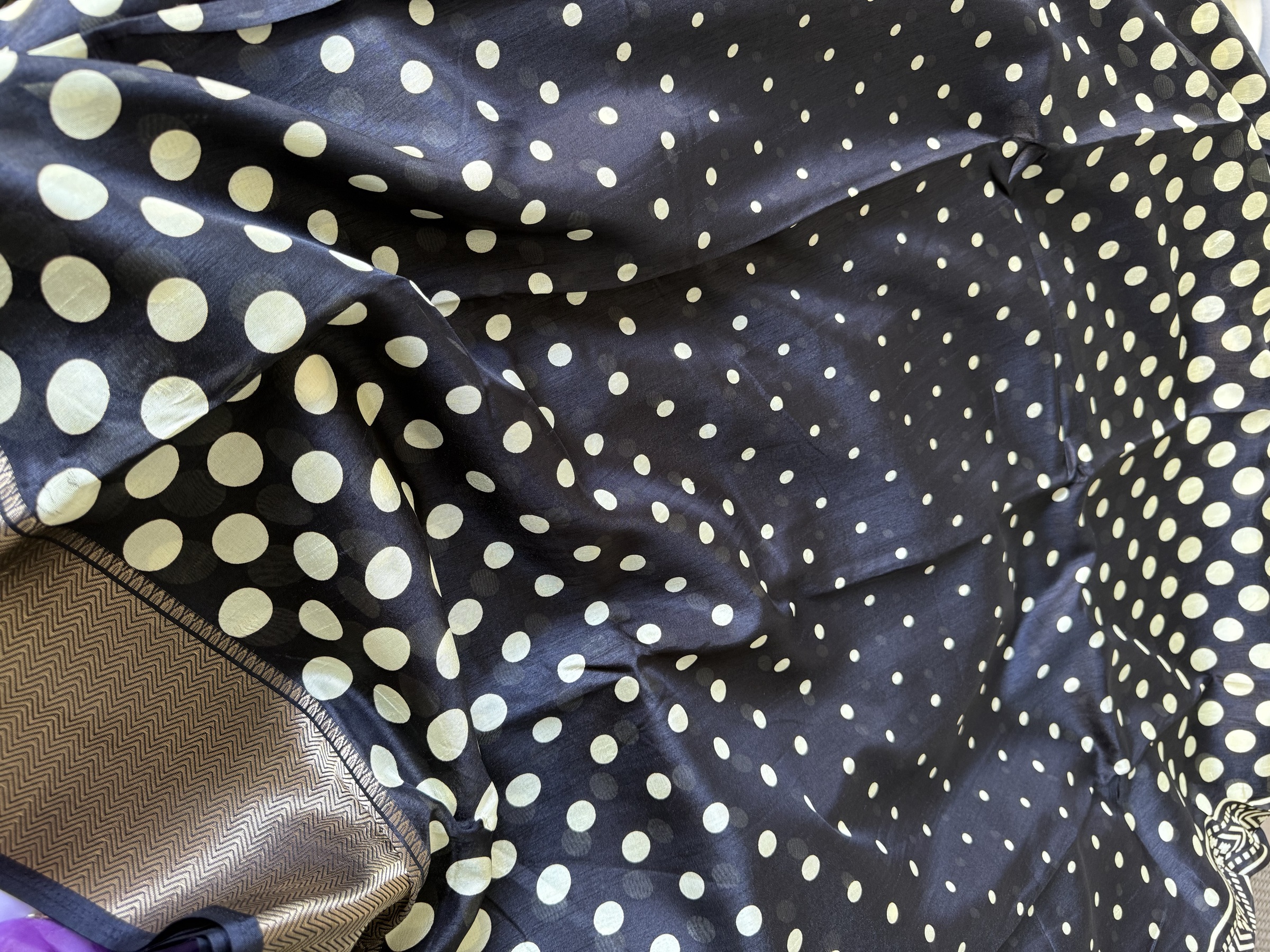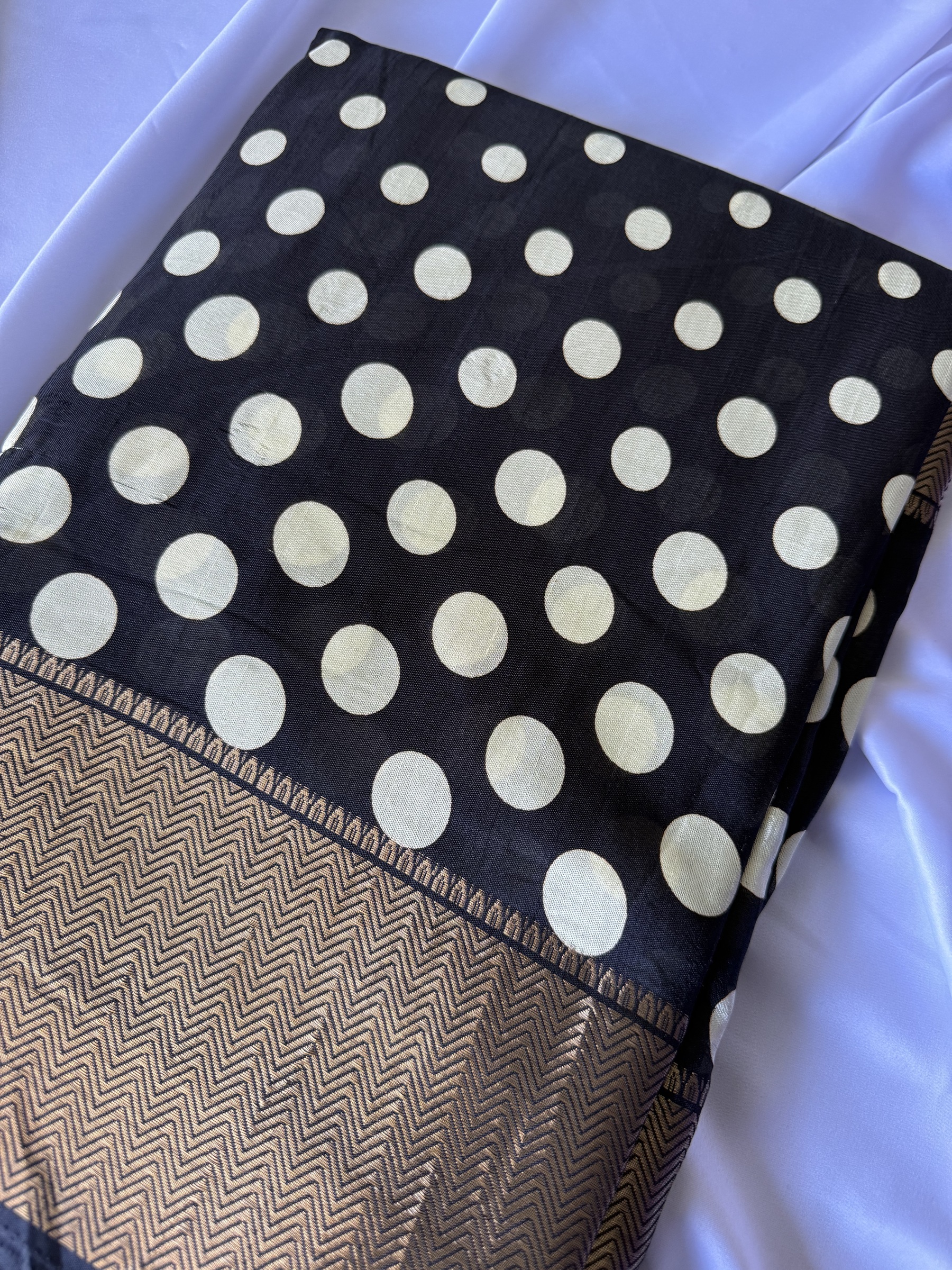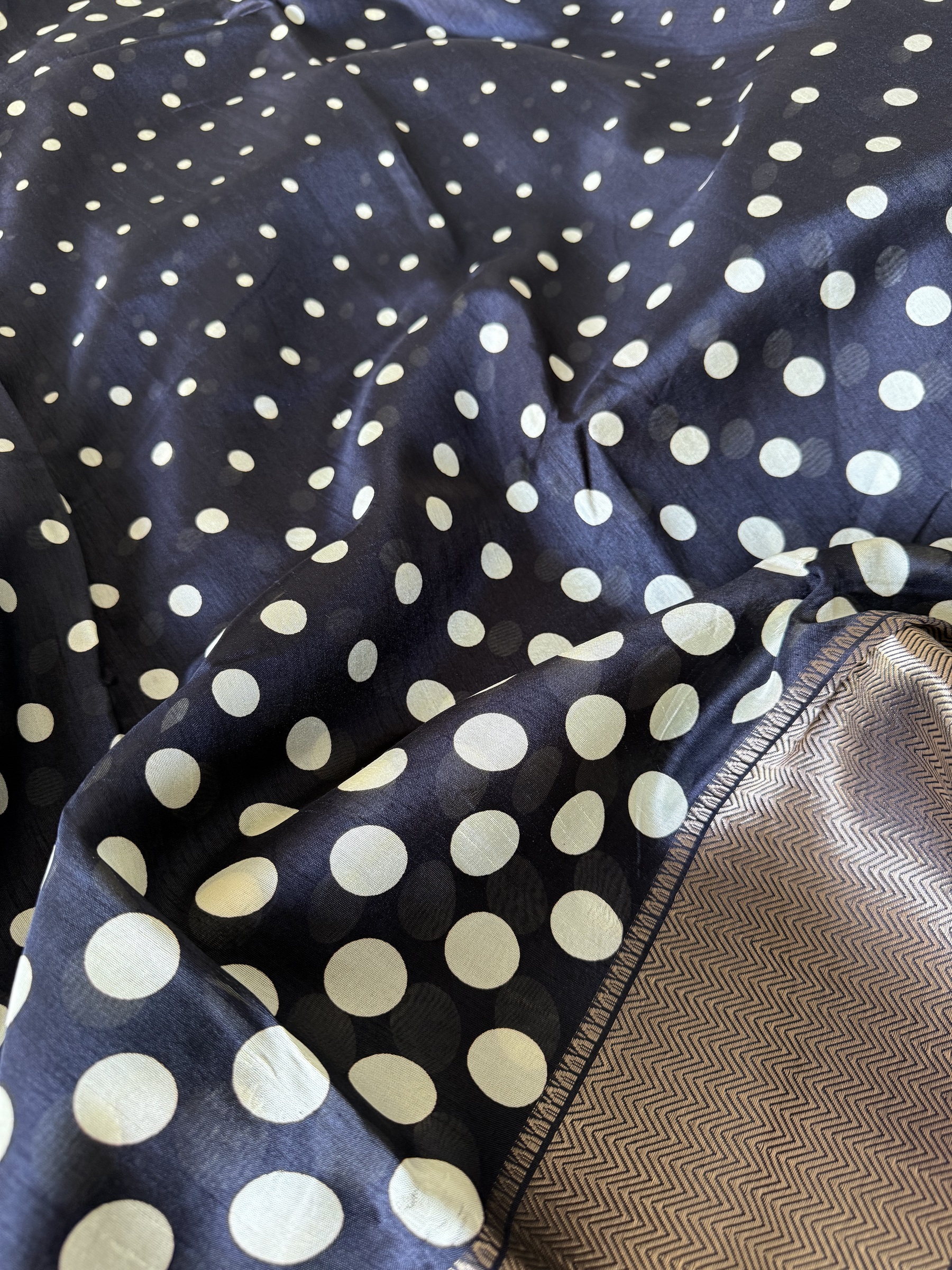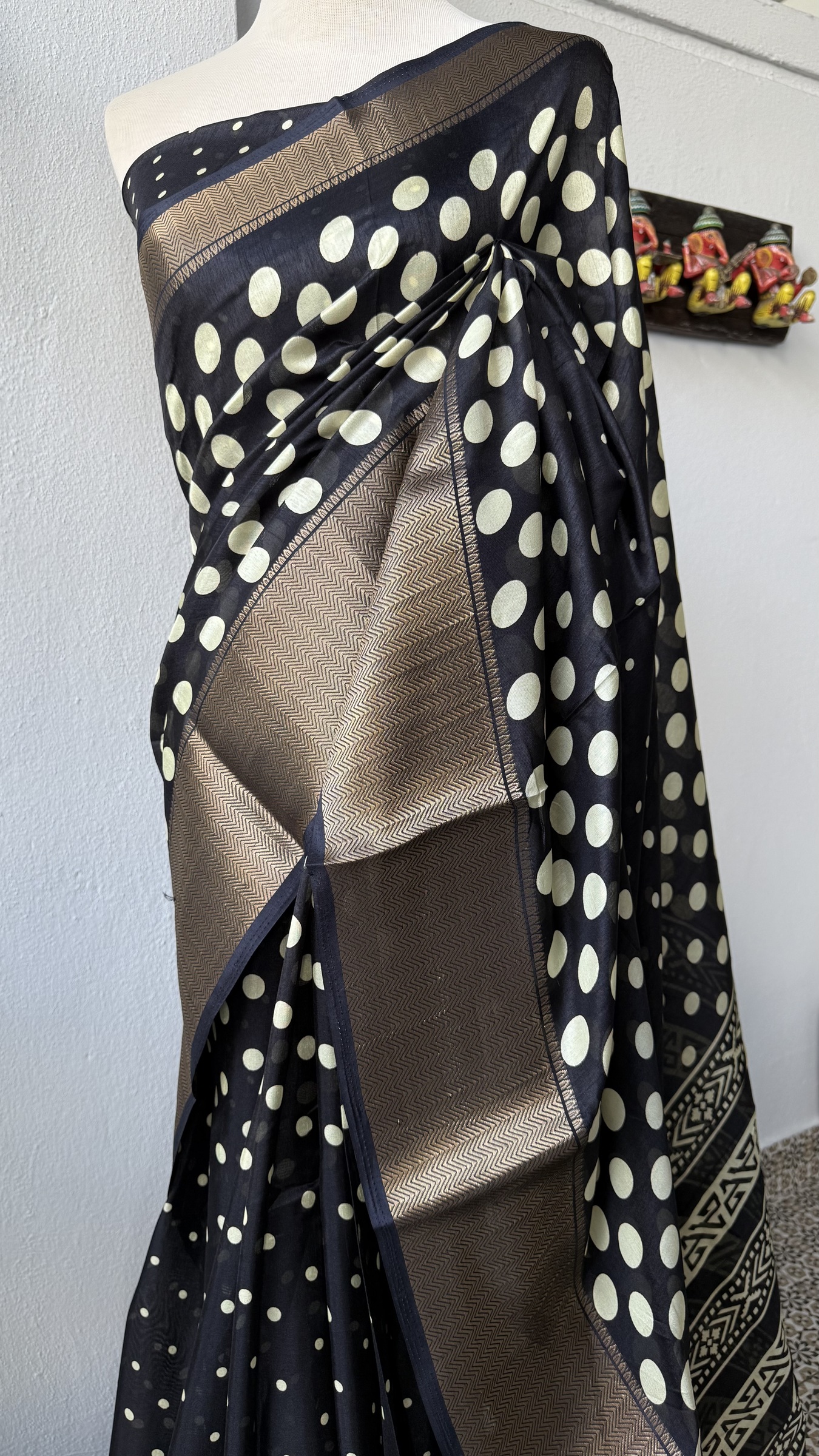 Synthetic mix soft and easy to drape Dola Silk polka dots design saree with contrast design pallu and small polka dots design attached blouse material.