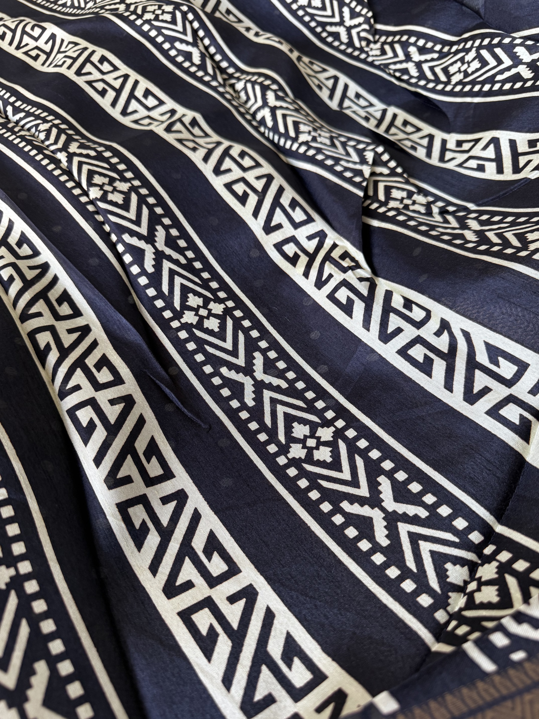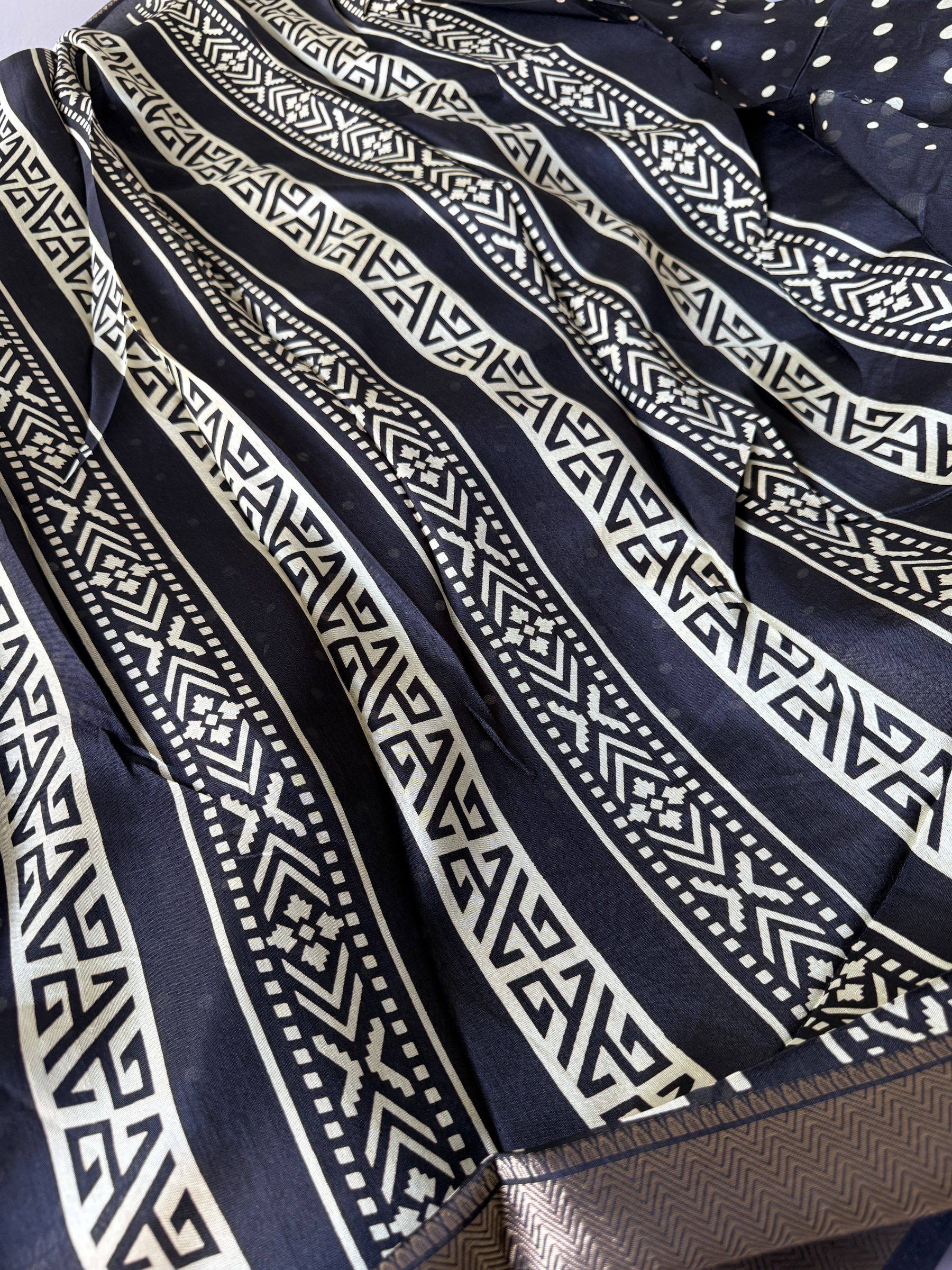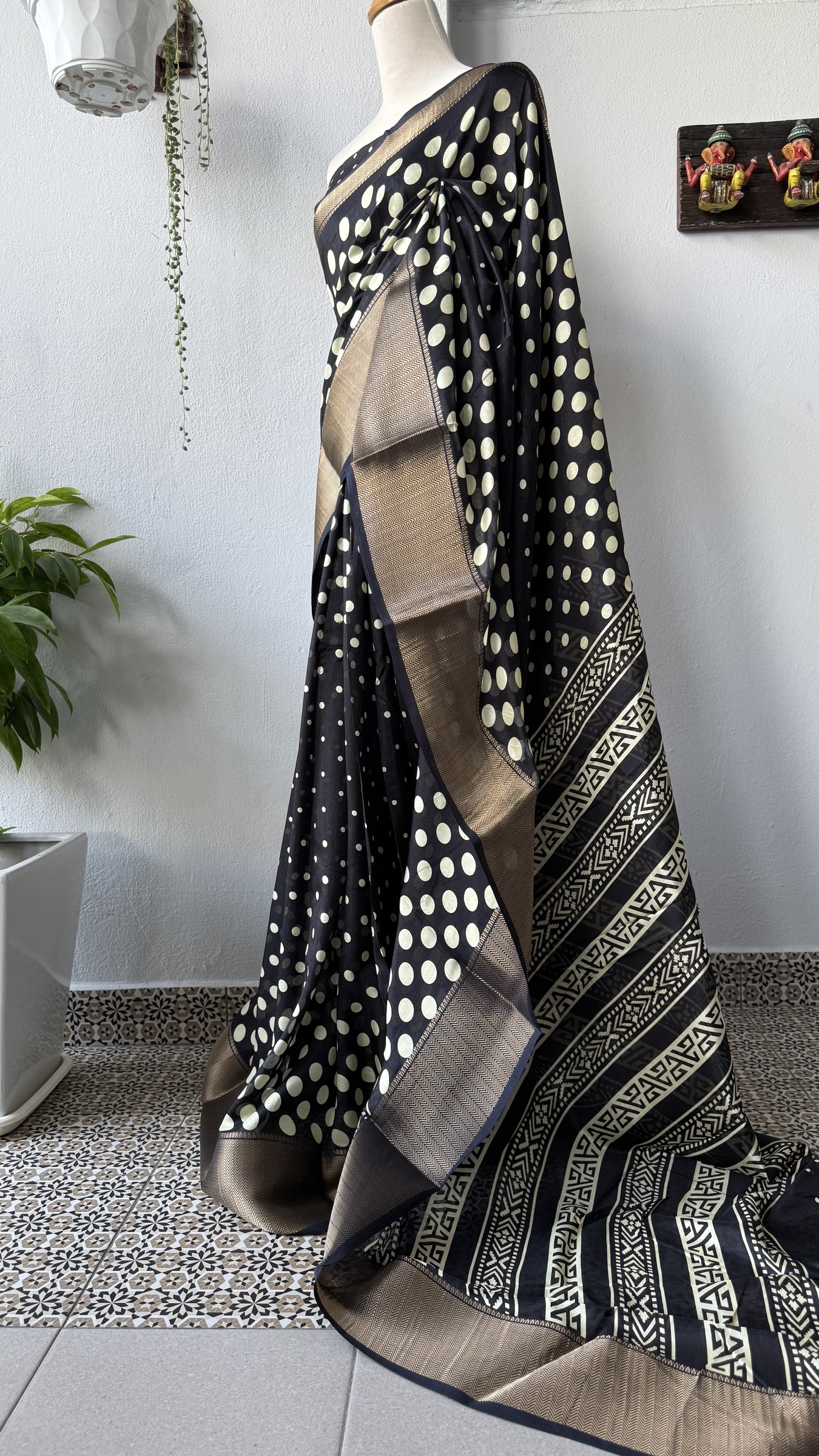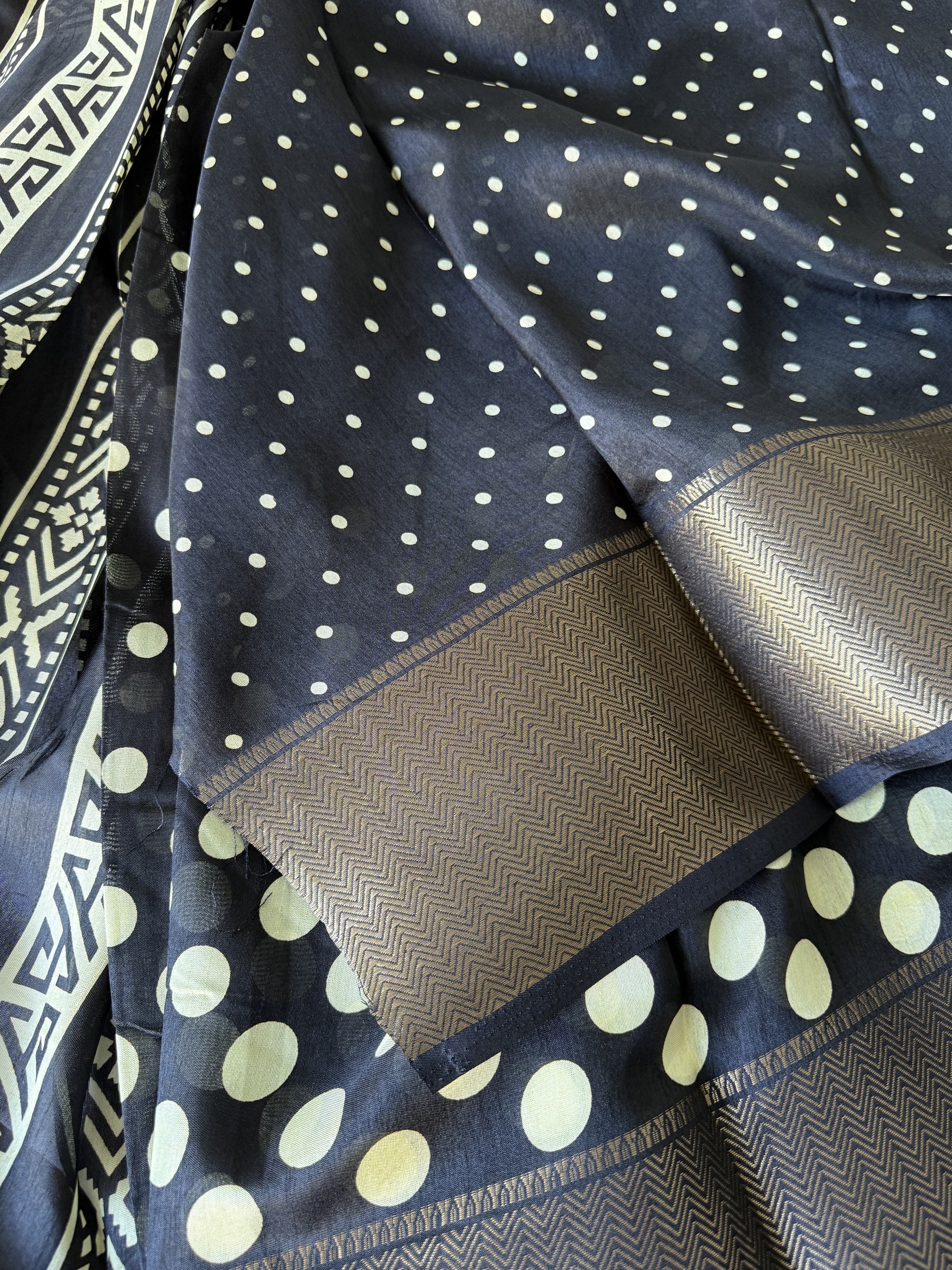 Synthetic mix soft and easy to drape Dola Silk polka dots design saree with contrast design pallu and small polka dots design attached blouse material.
