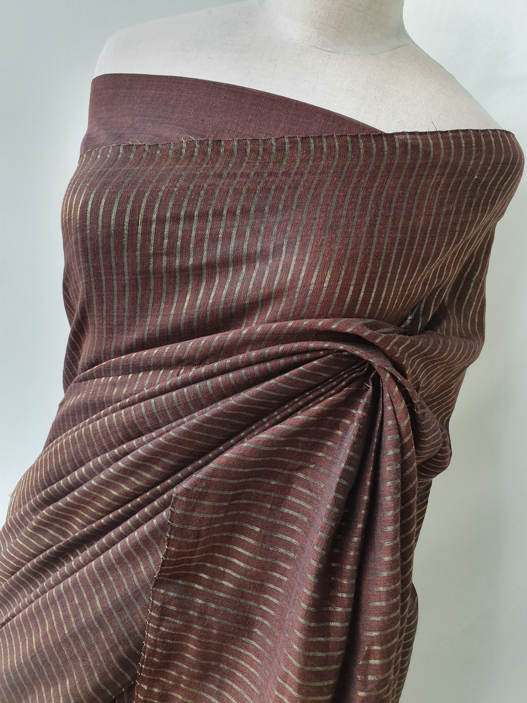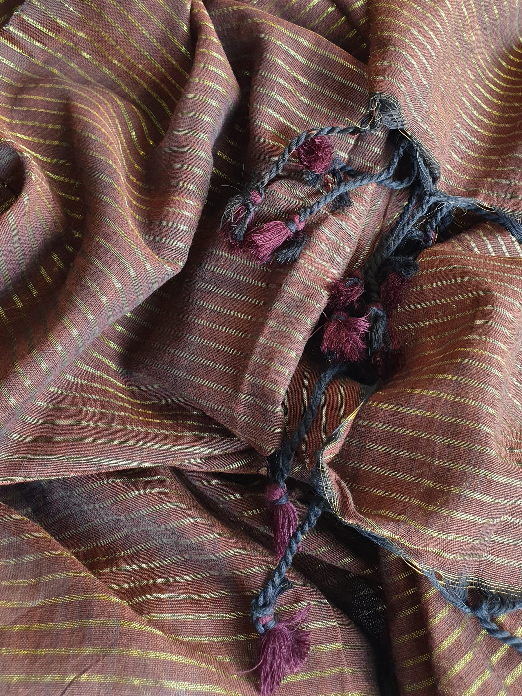 Mulmul cotton saree with gold threads vertical lines on full body and comes with attached plain colour blouse material.