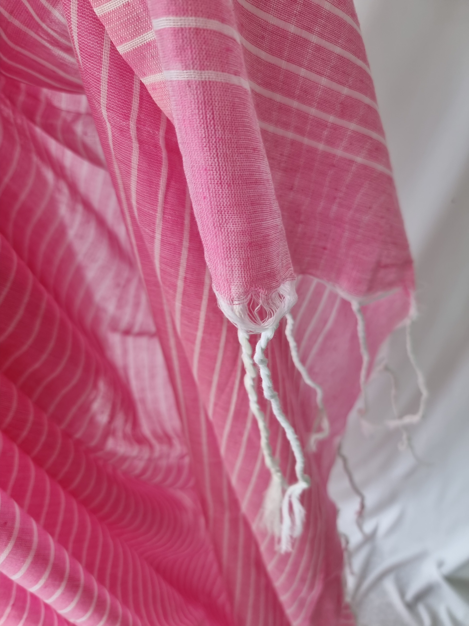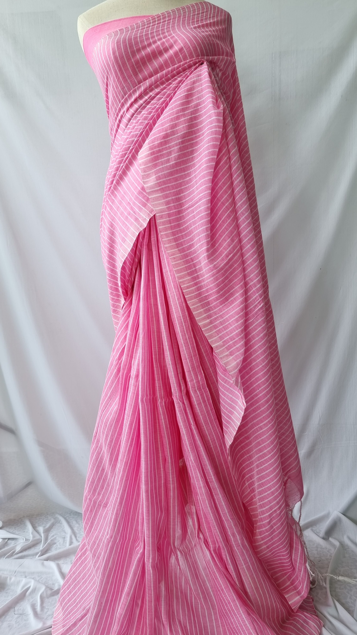 Mulmul cotton saree with white threads vertical lines on full body and comes with attached plain colour blouse material.