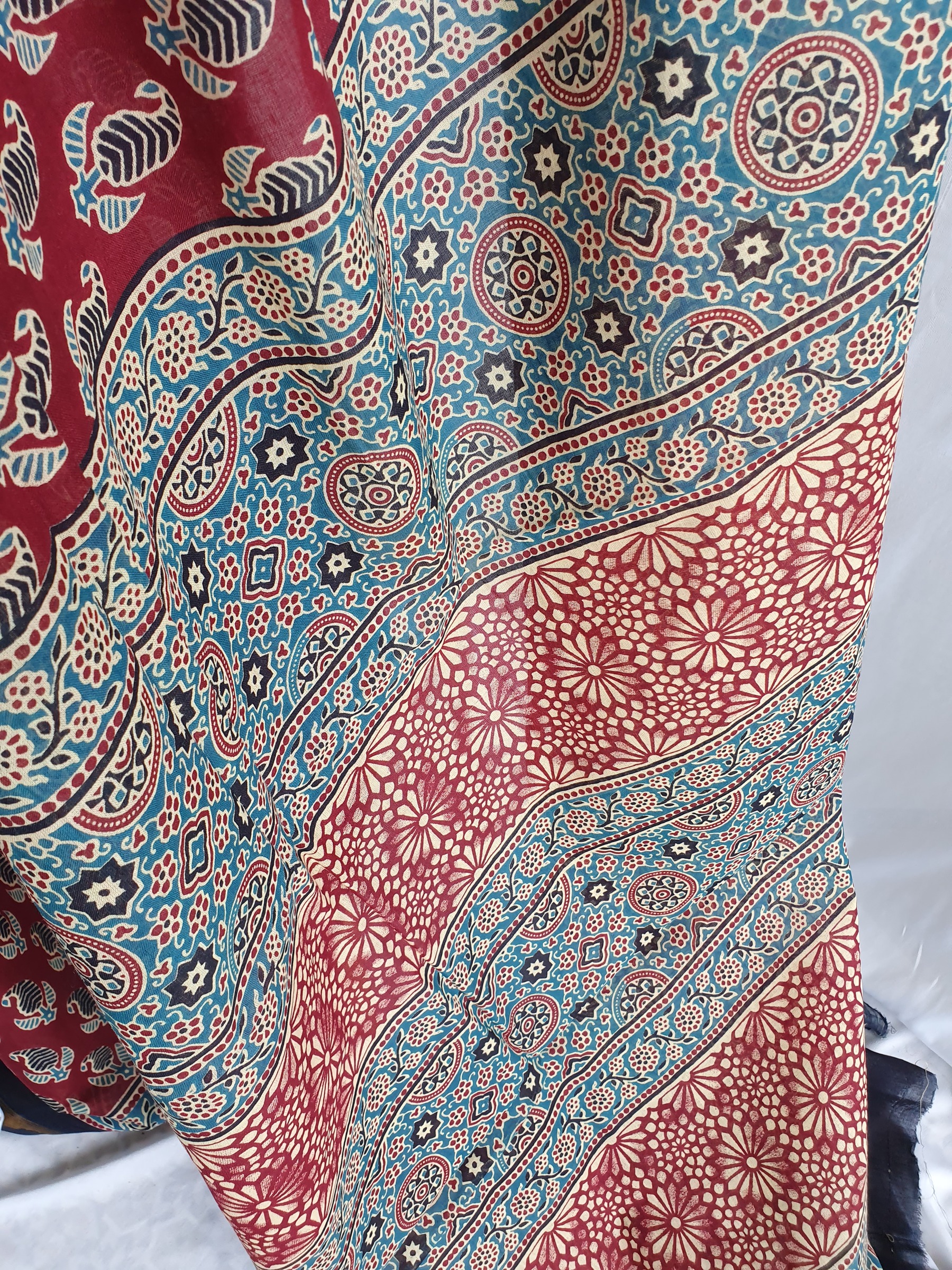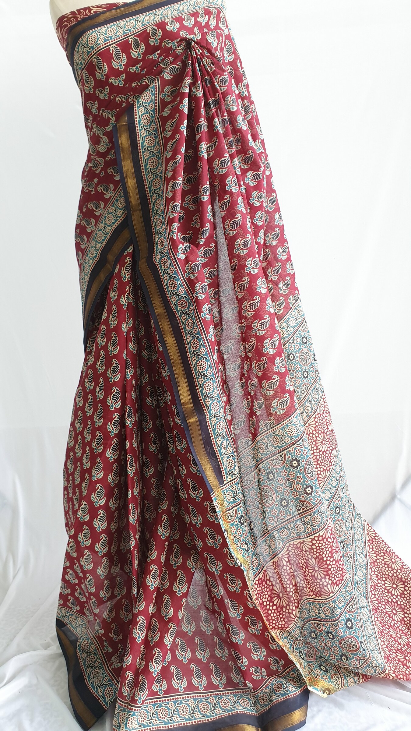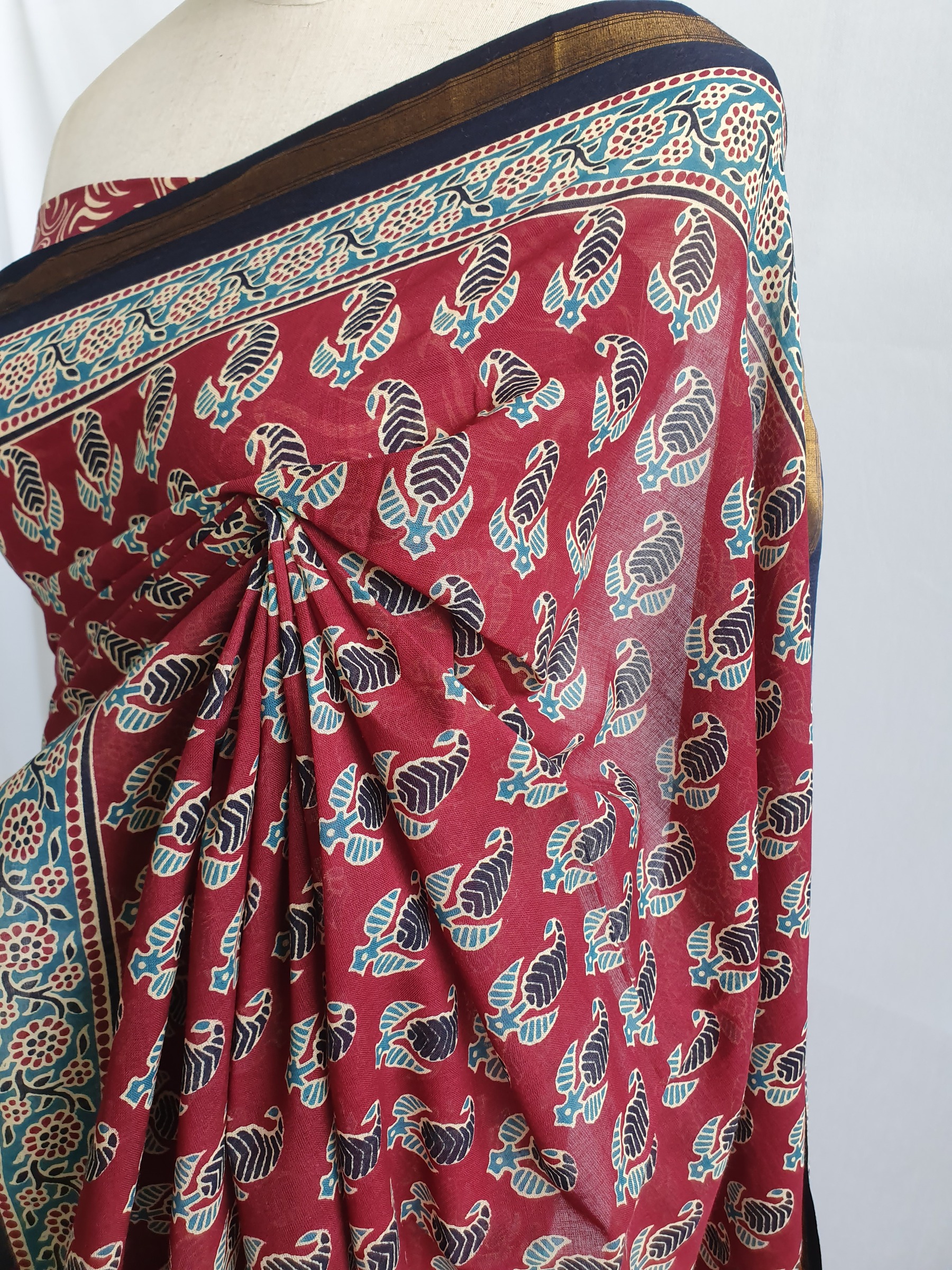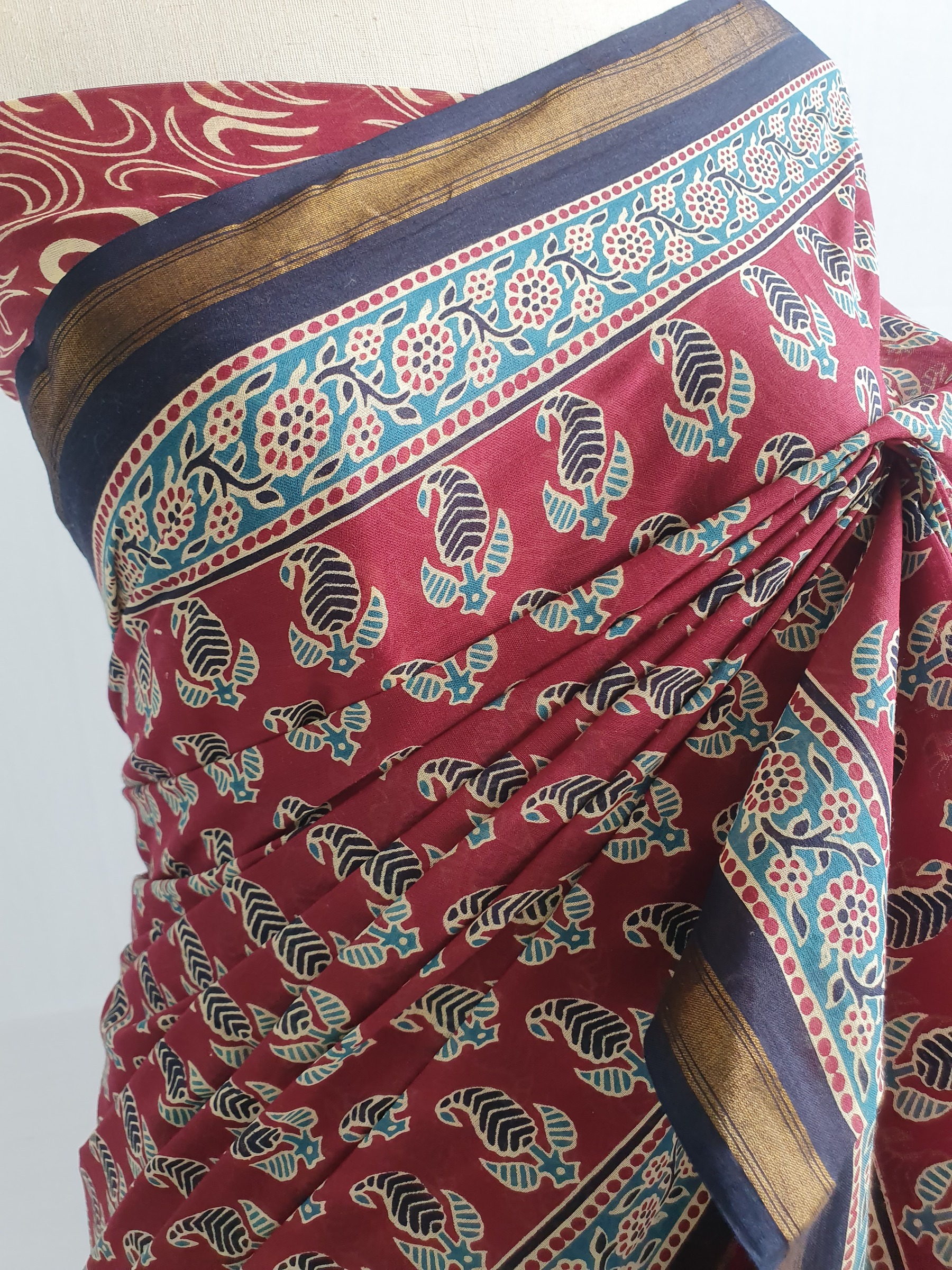 Bagru design inspired mixed cotton saree with thin gold border and attached contrast design blouse material.