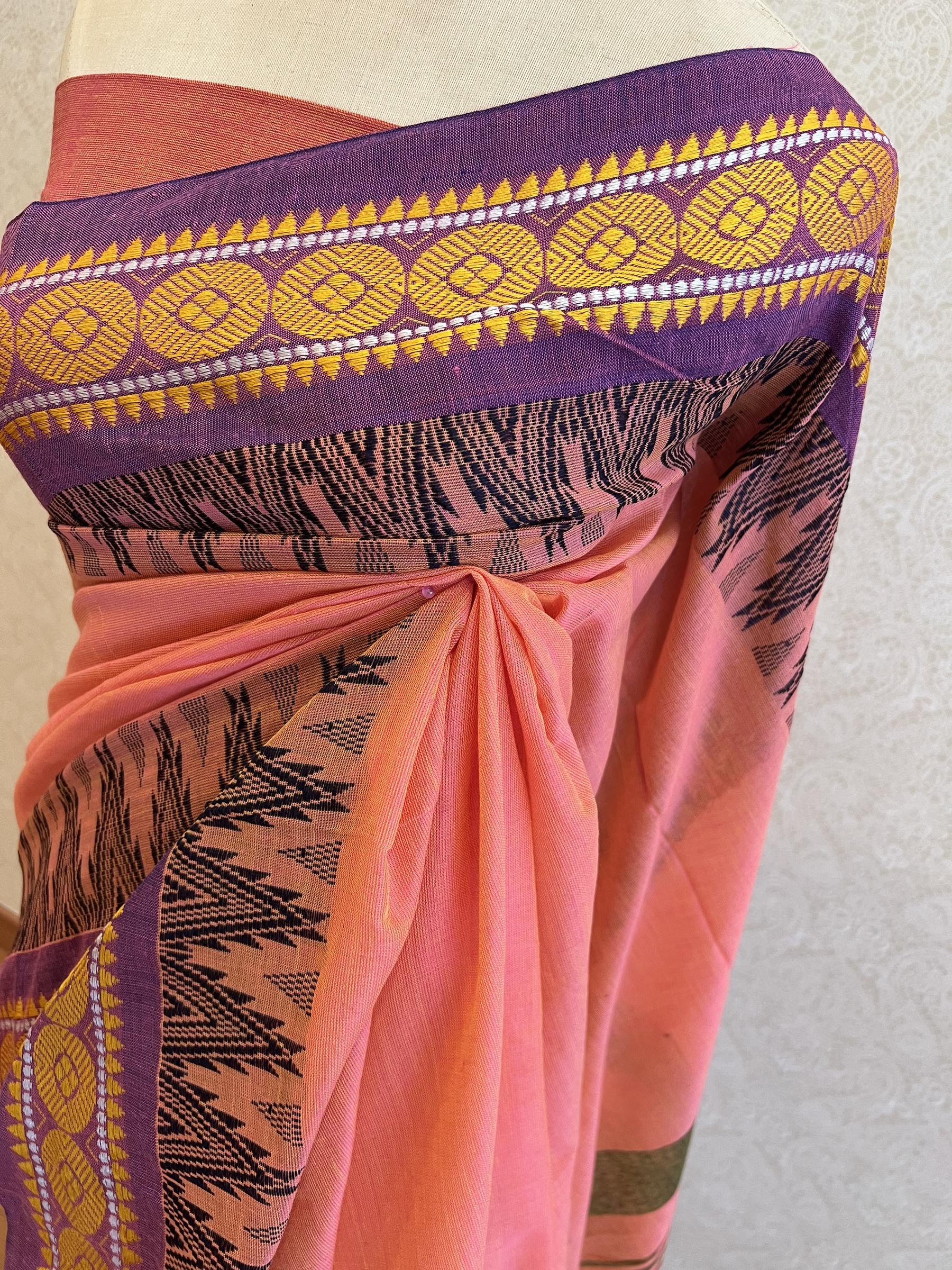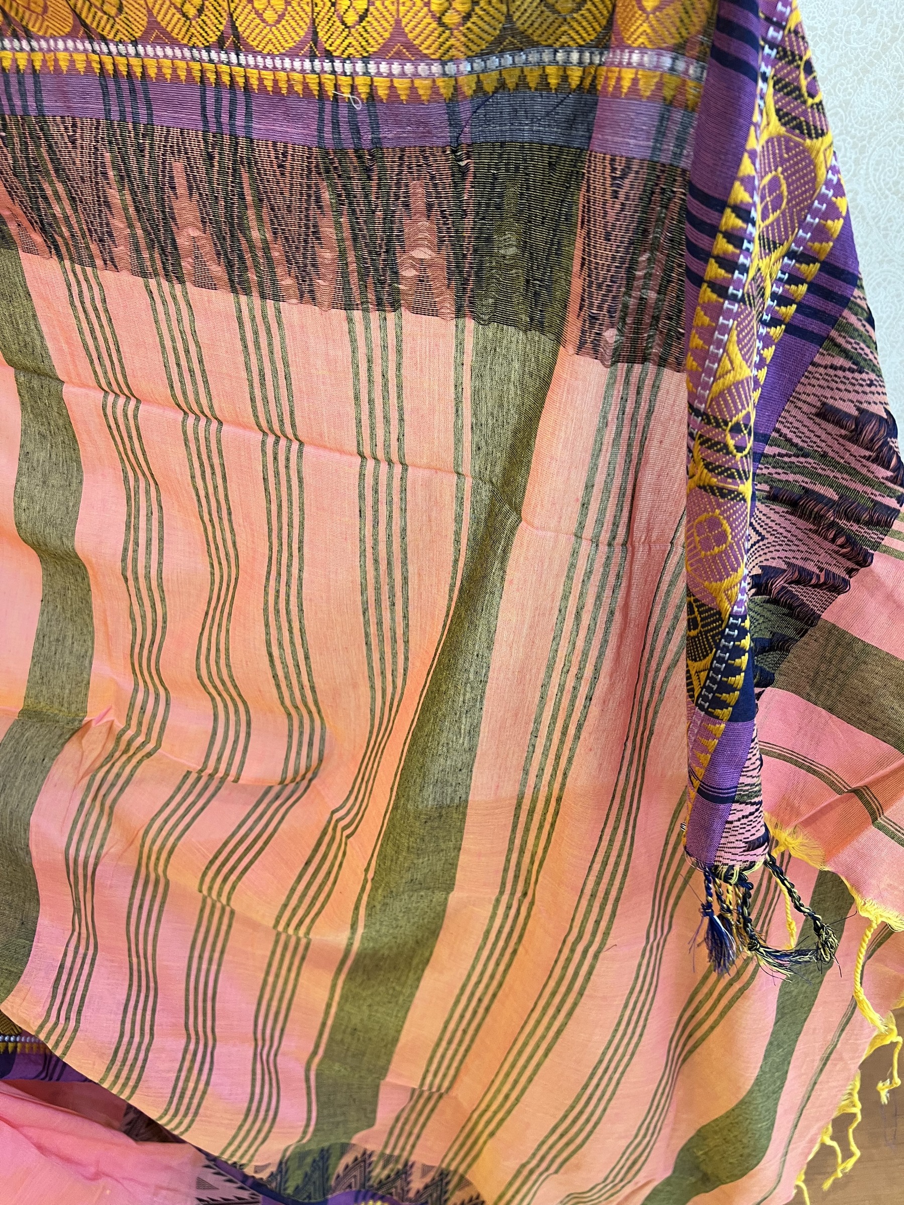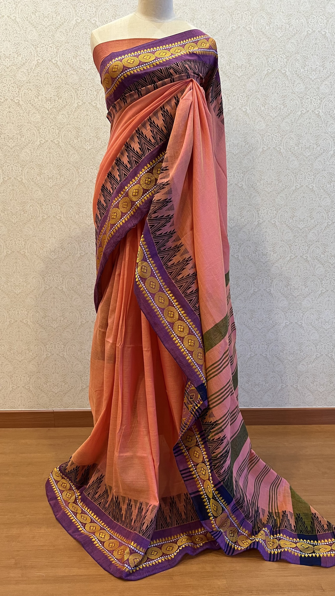 Soft cotton saree from Bengal with colour thread woven border and attached running colour blouse material.