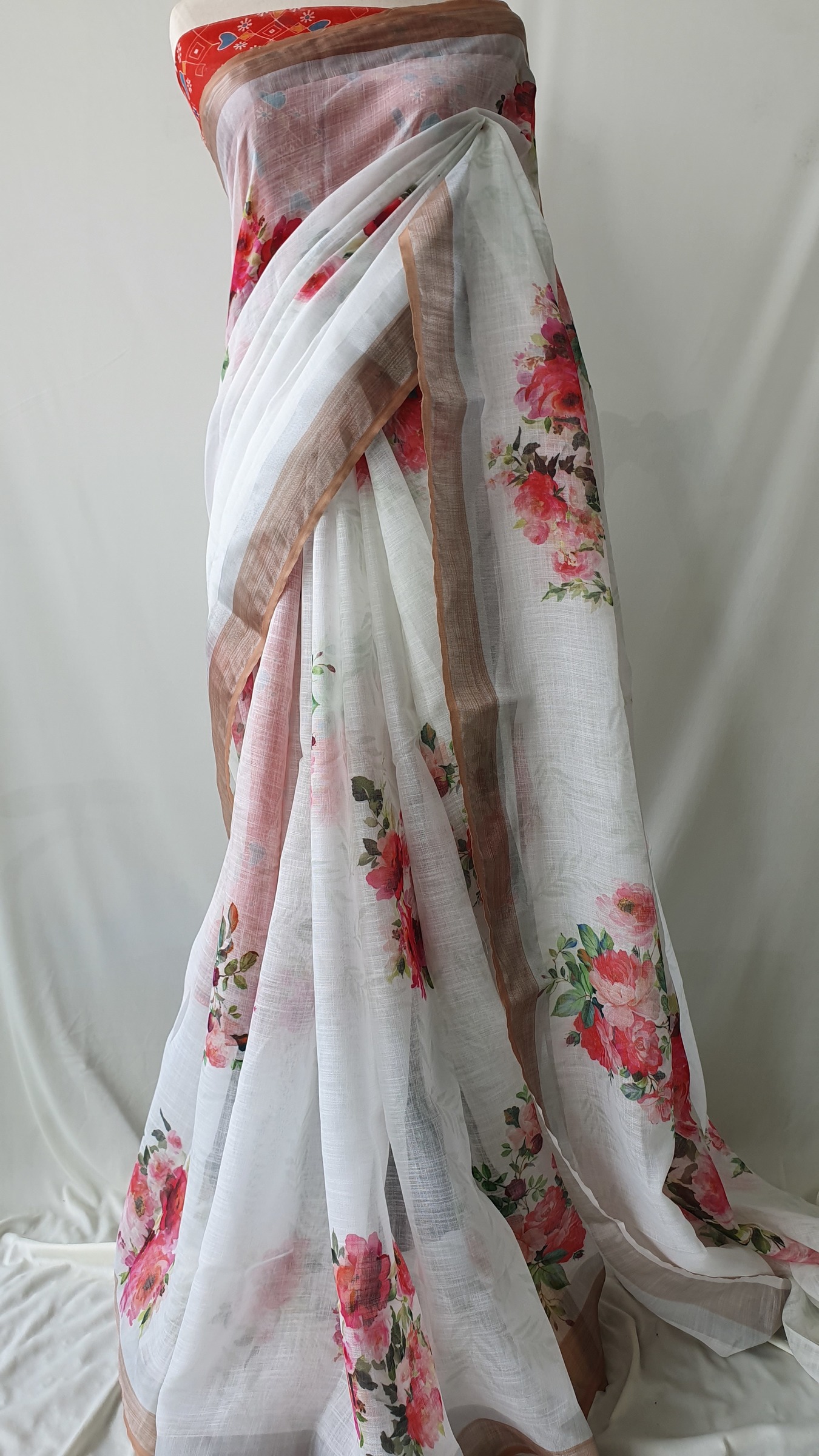 Mixed cotton saree with digital floral prints and attached contrast design blouse material.