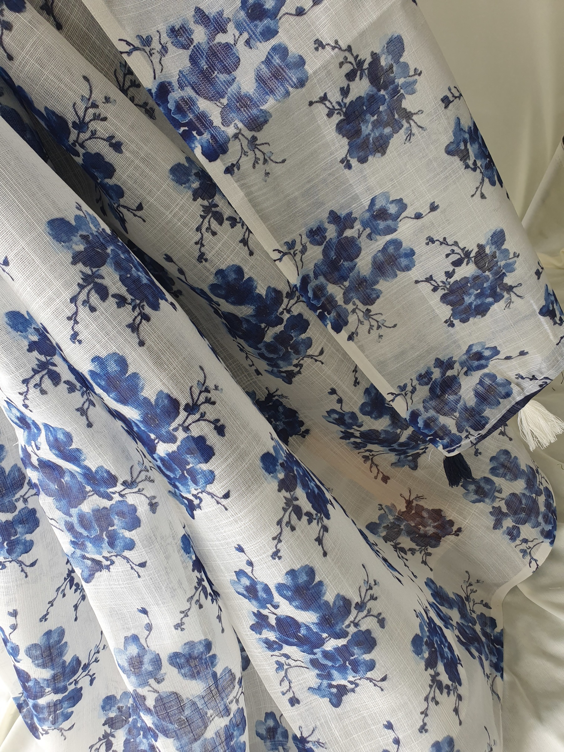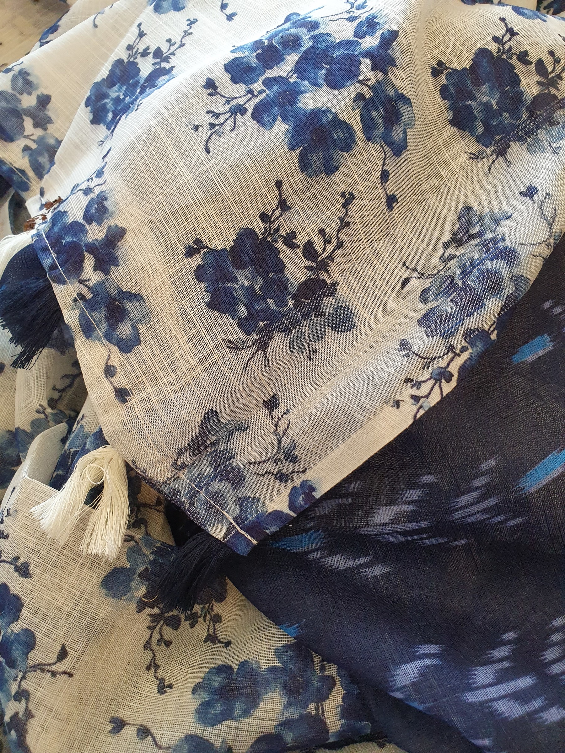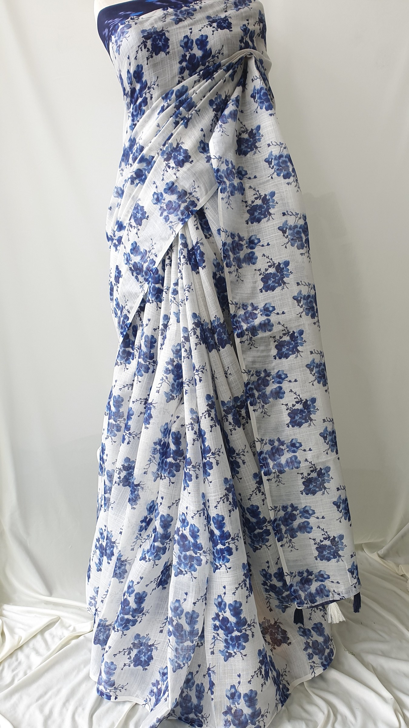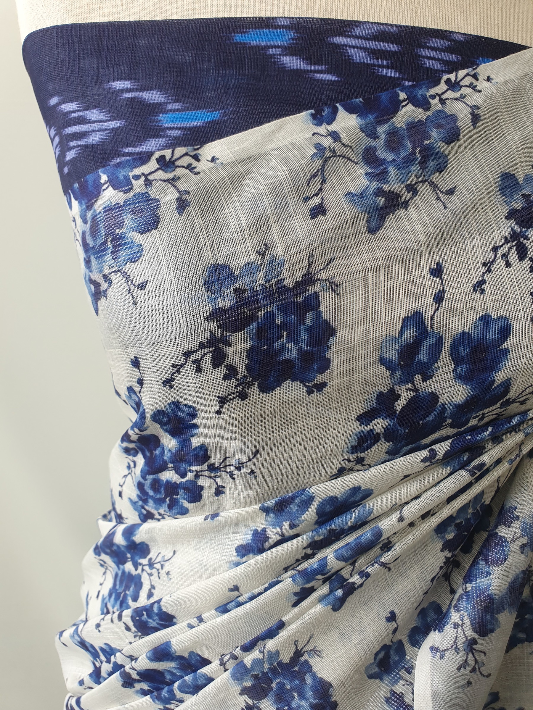 Linen mix cotton saree with digital floral prints and attached ikkat inspired design blouse material.