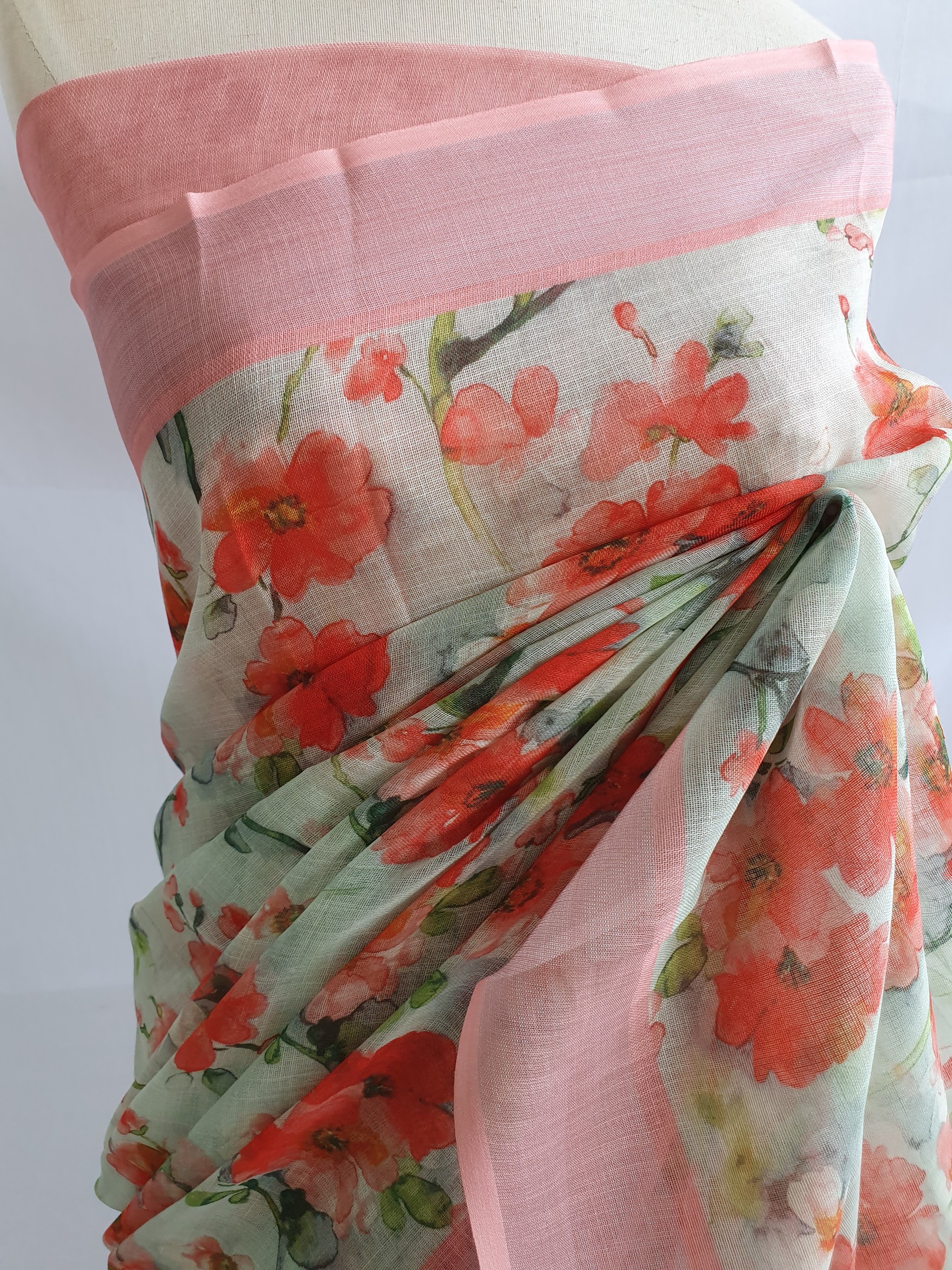 Mixed cotton saree with digital floral prints and attached contrast design blouse material.