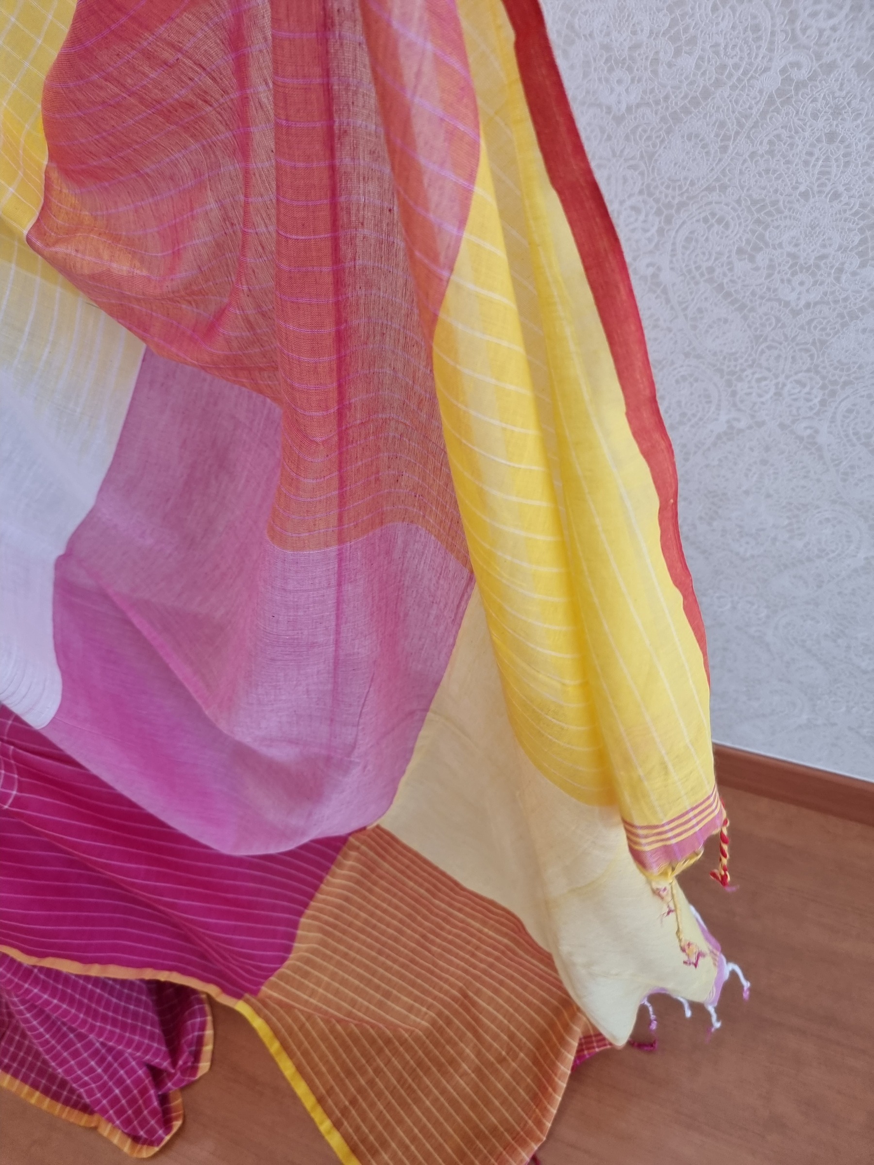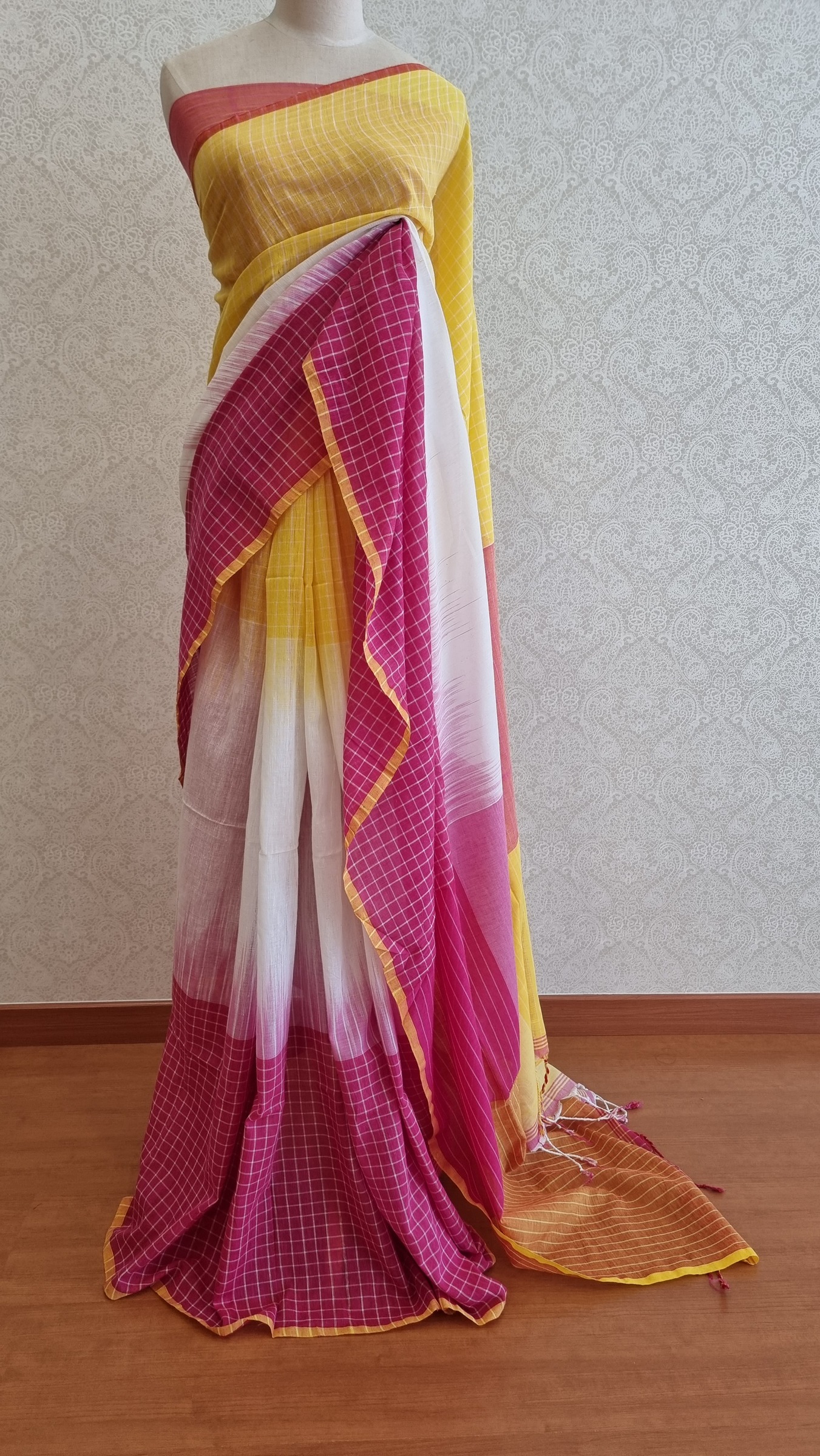Soft cotton saree from Bengal with double colour checked broad borders and comes with contrast colour plain blouse material.