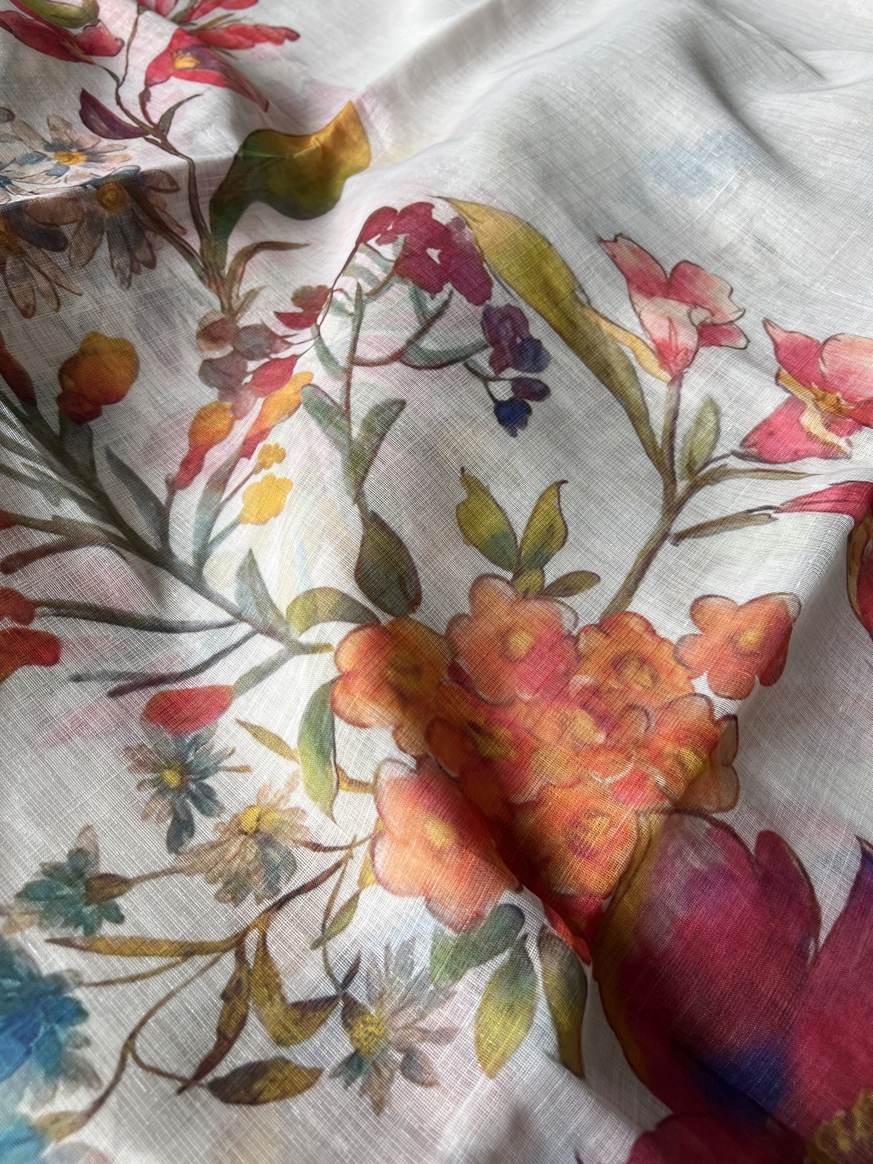 Synthetic linen cotton saree with digital floral prints and attached contrast design blouse material (refer last picture for blouse).