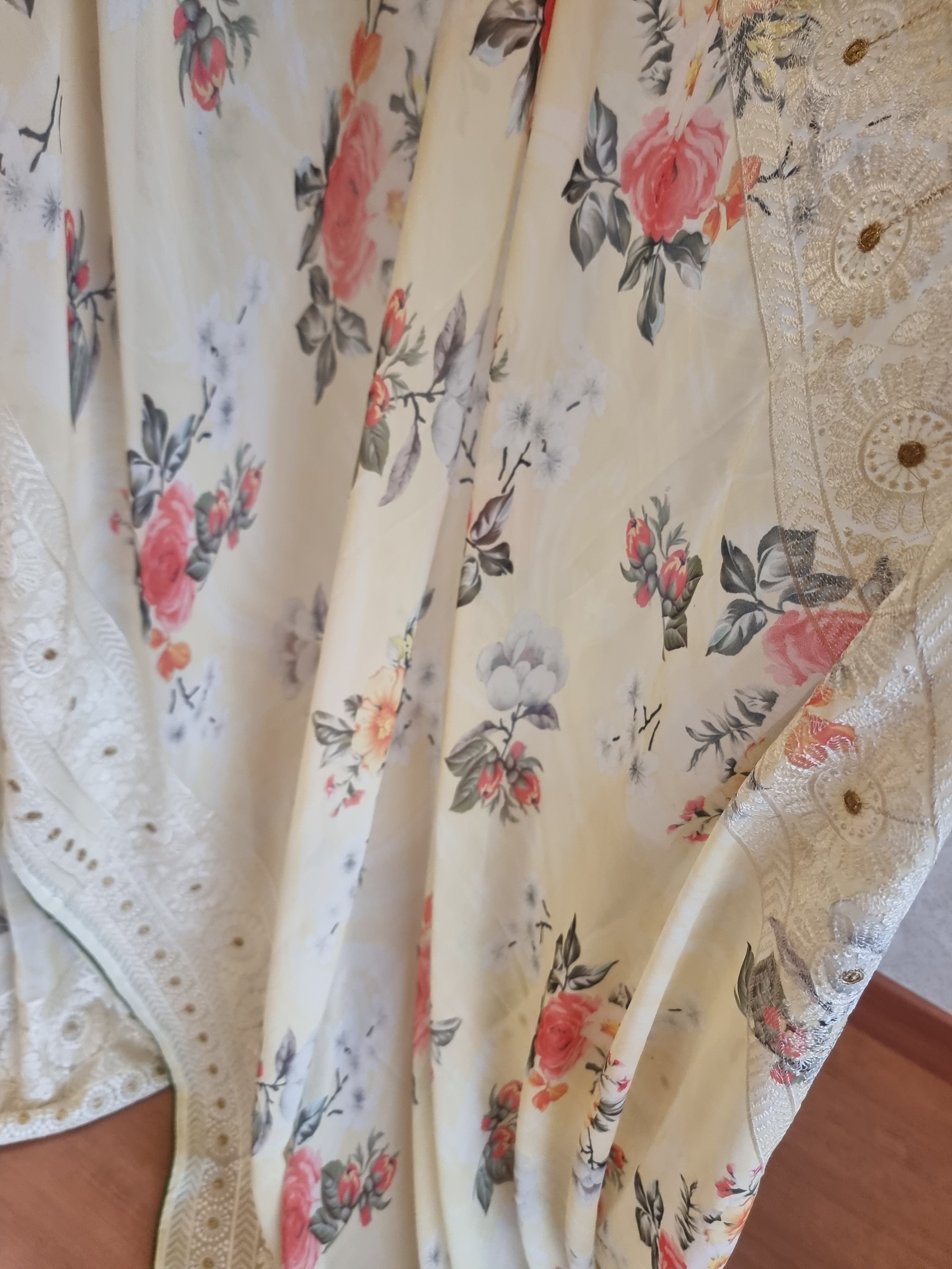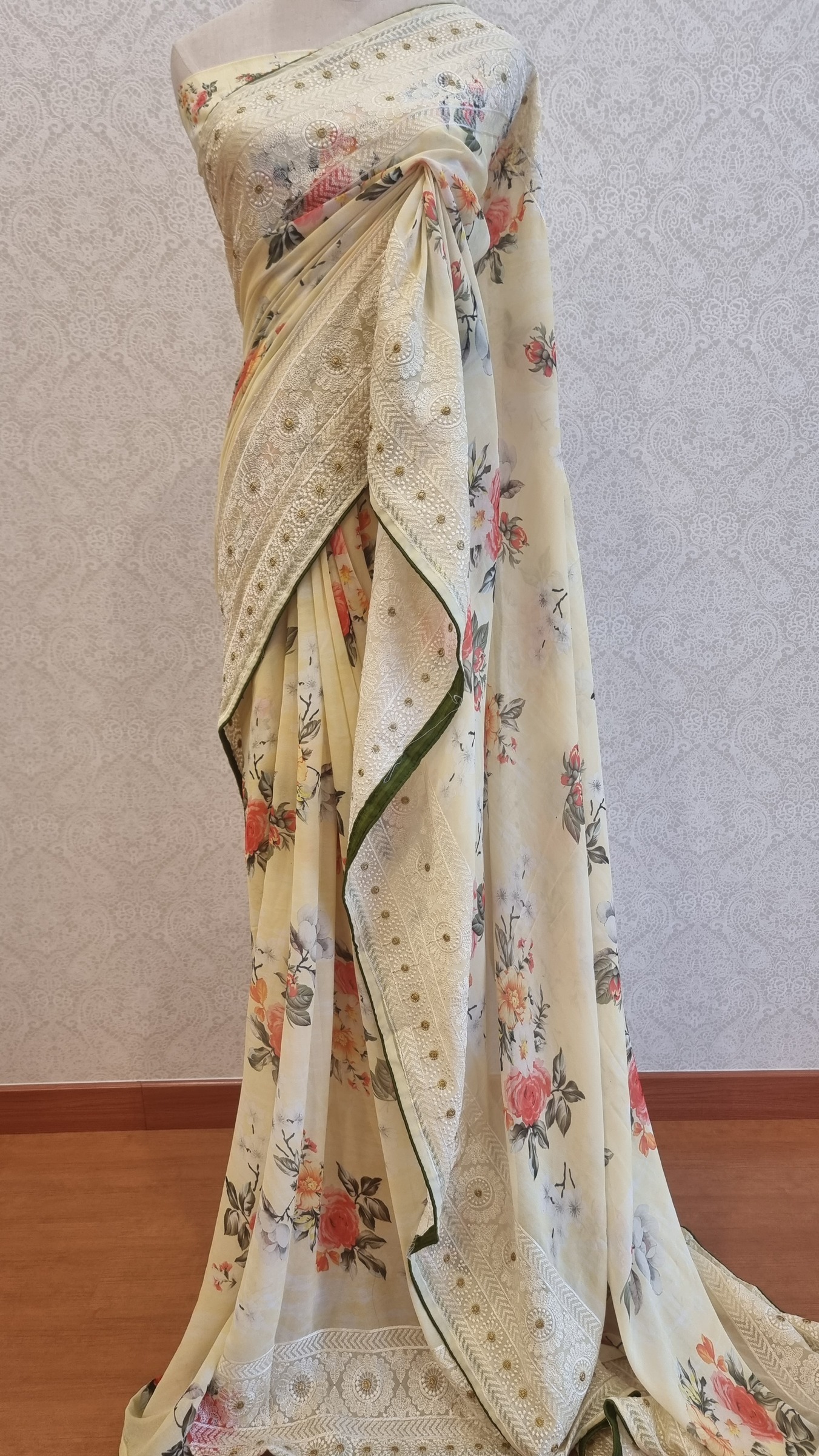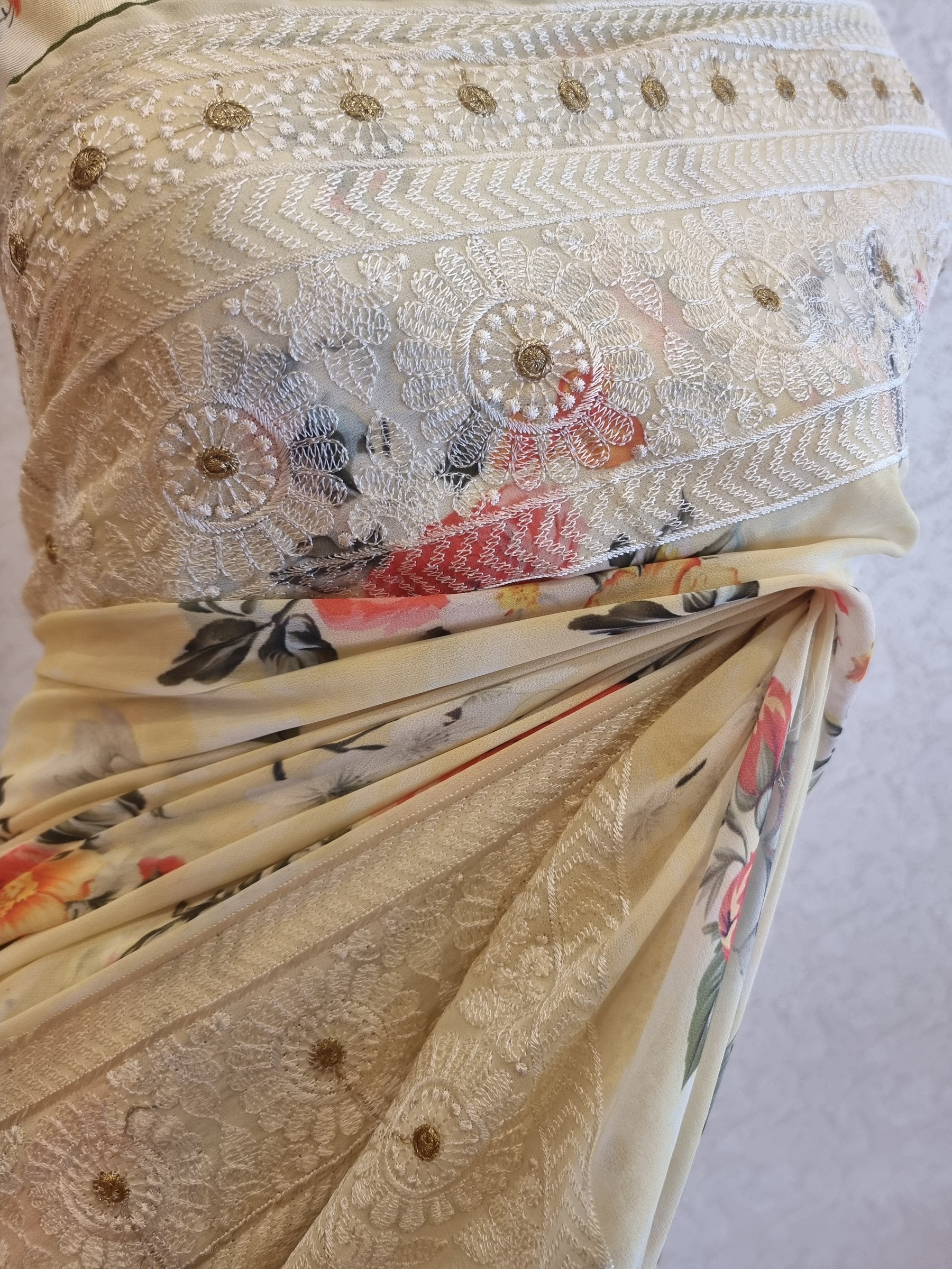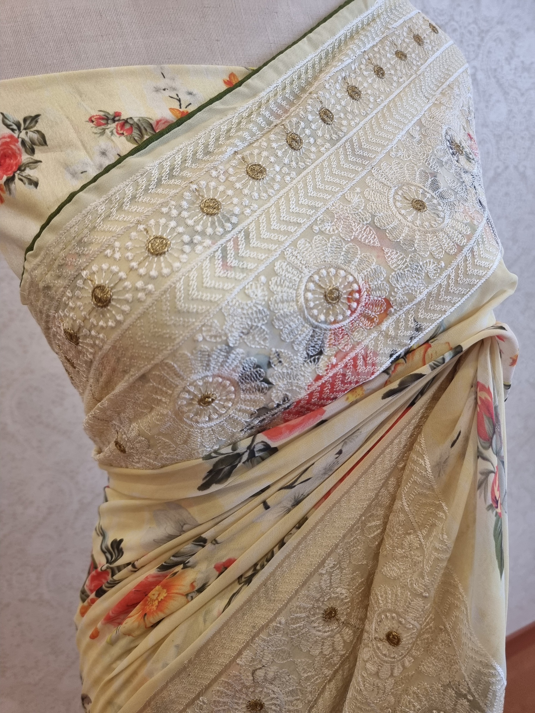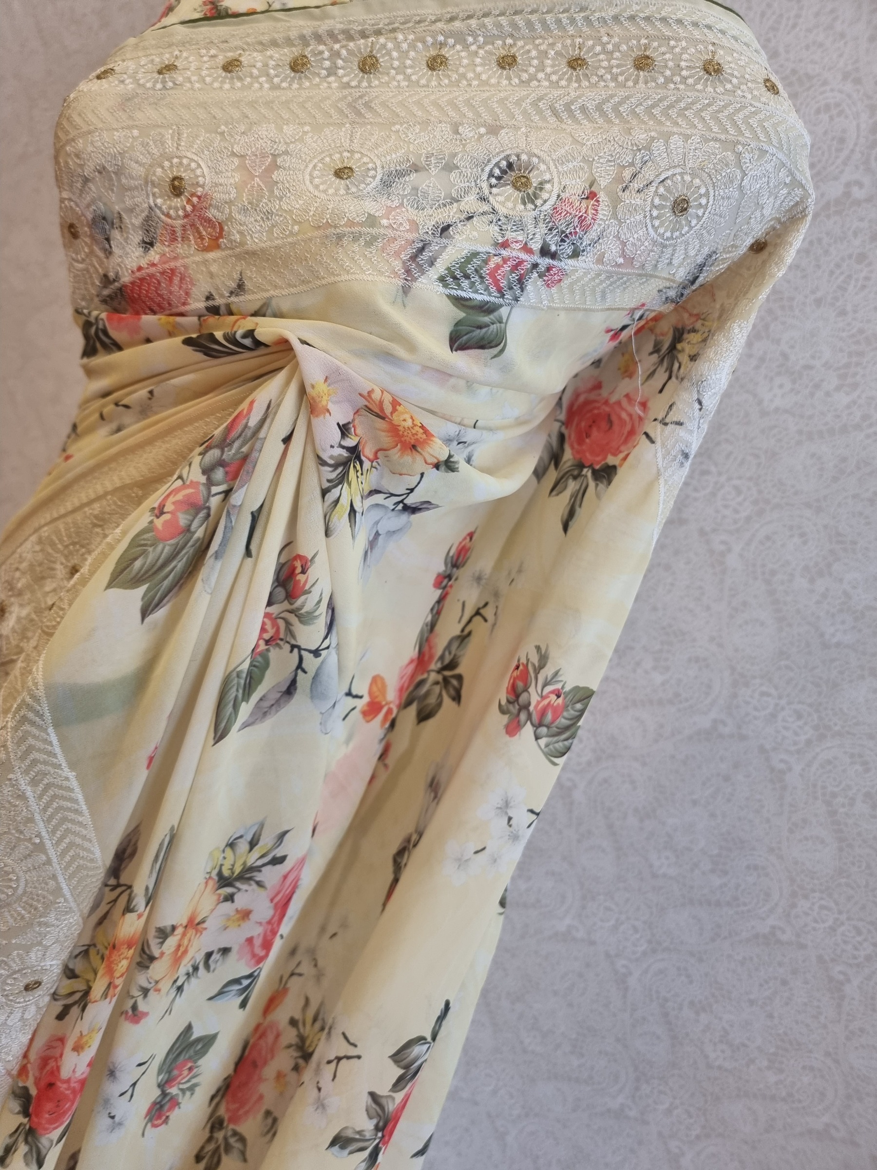 Pastel yellow lightweight and soft mixed chiffon saree with digital floral prints, grand embroidery border and attached floral design blouse material.