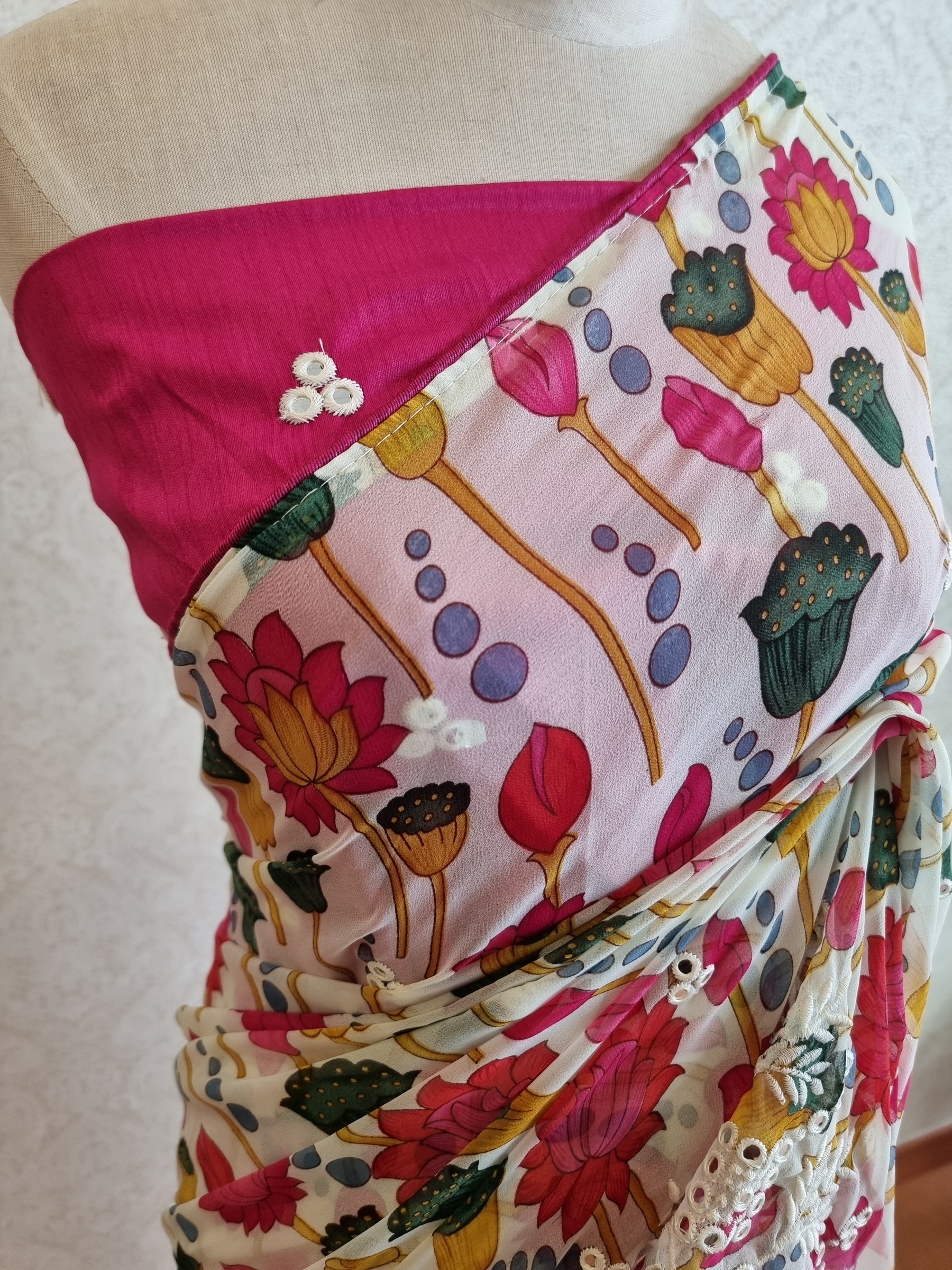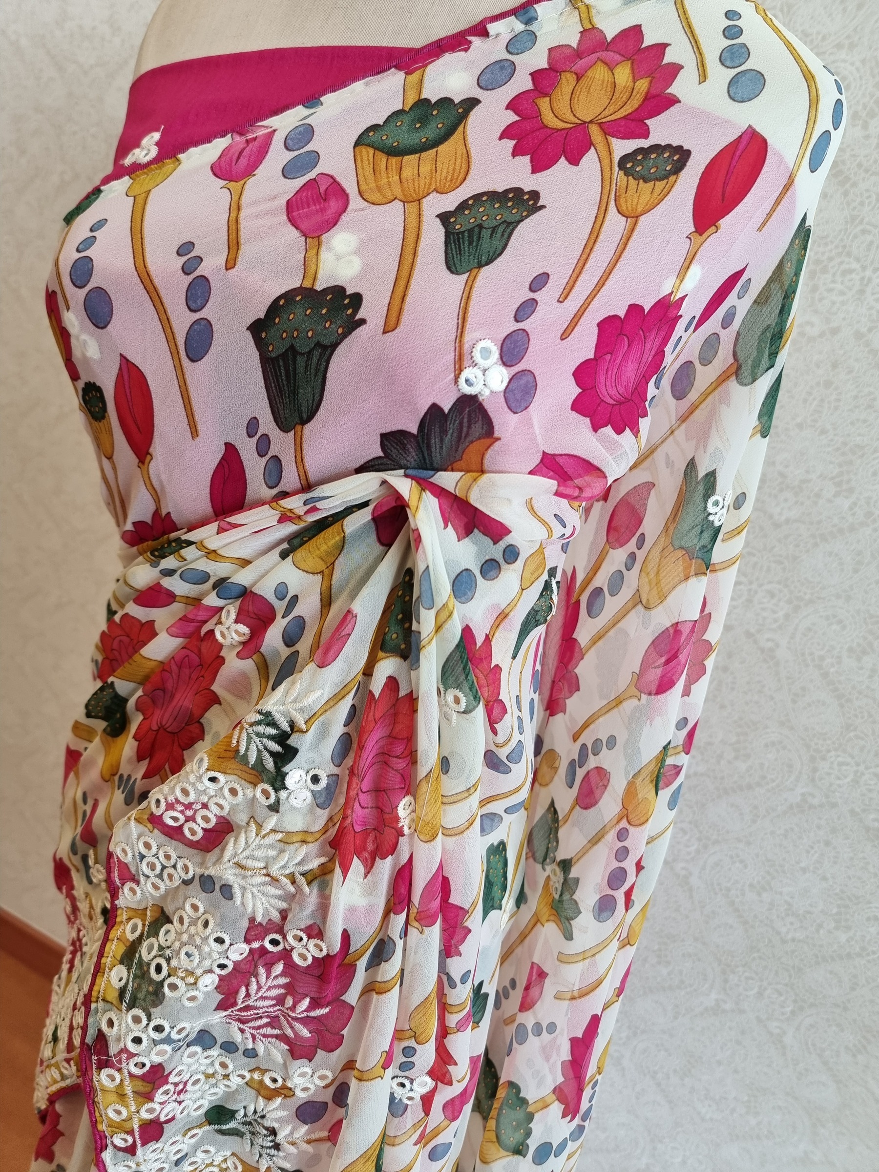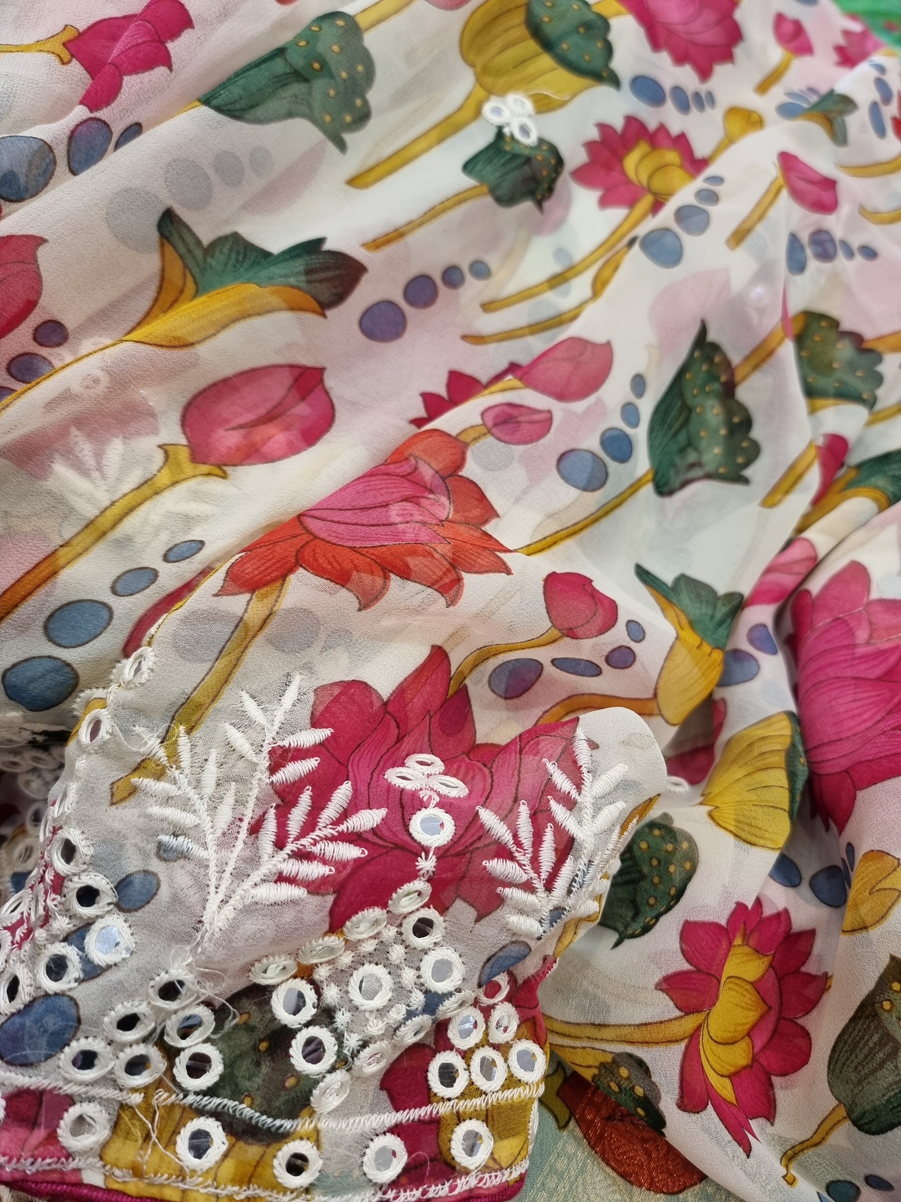 Lightweight and soft mixed lotus design chiffon saree with mirrorwork embroidery border and digital floral prints, thin border and attached plain contrast colour blouse material.