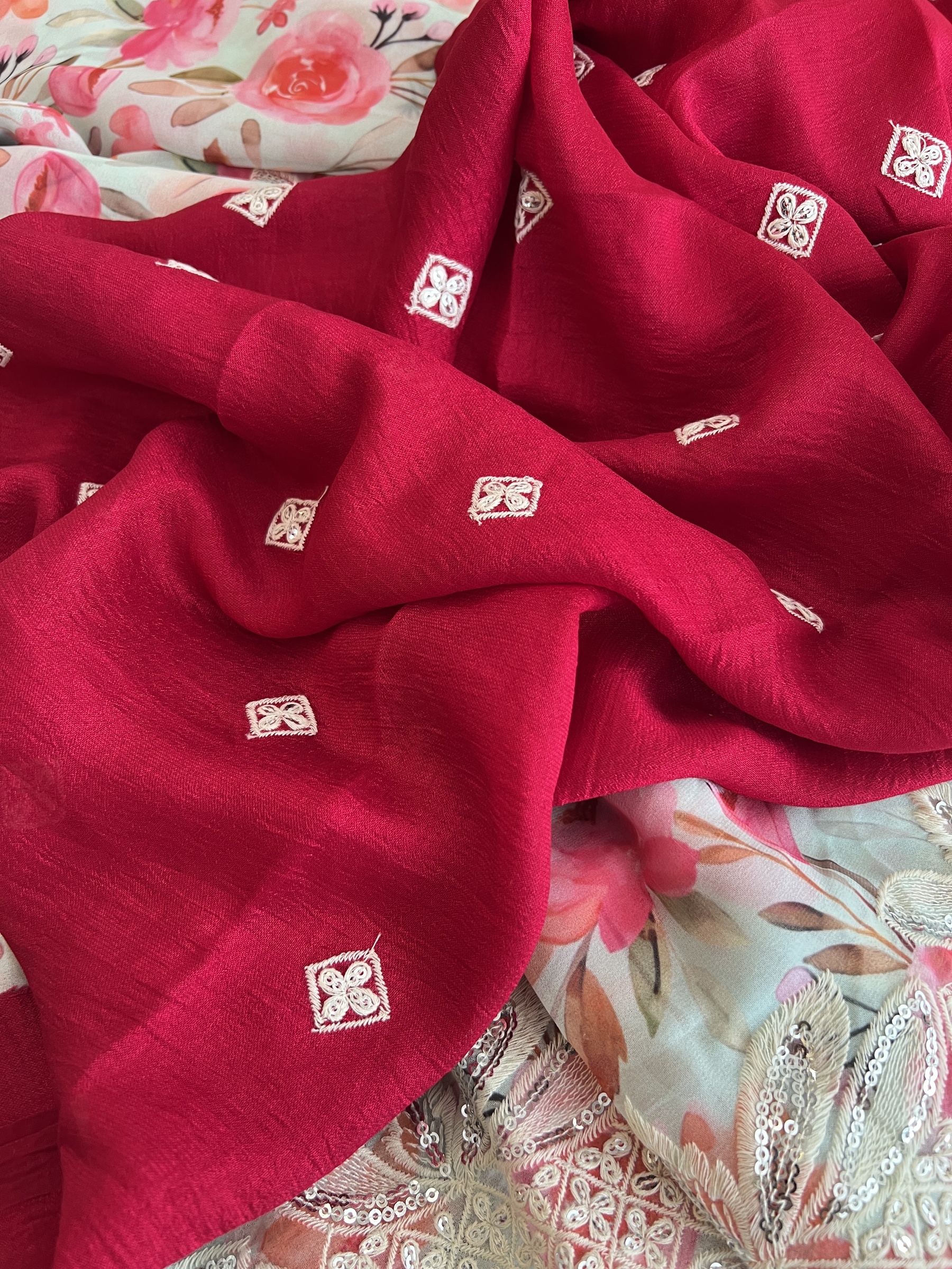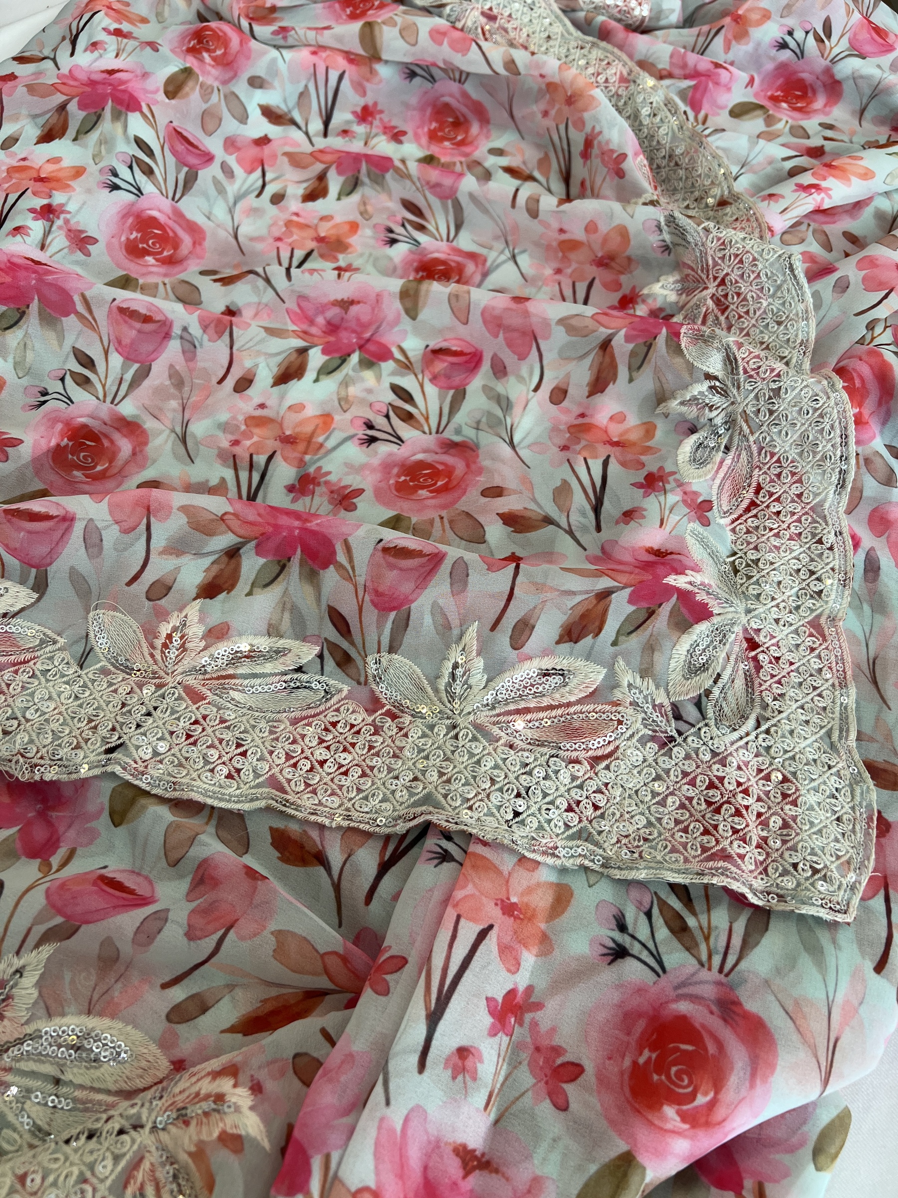Lightweight and soft chiffon saree with sequins work on border and attached grand contrast colour sequins work blouse material.