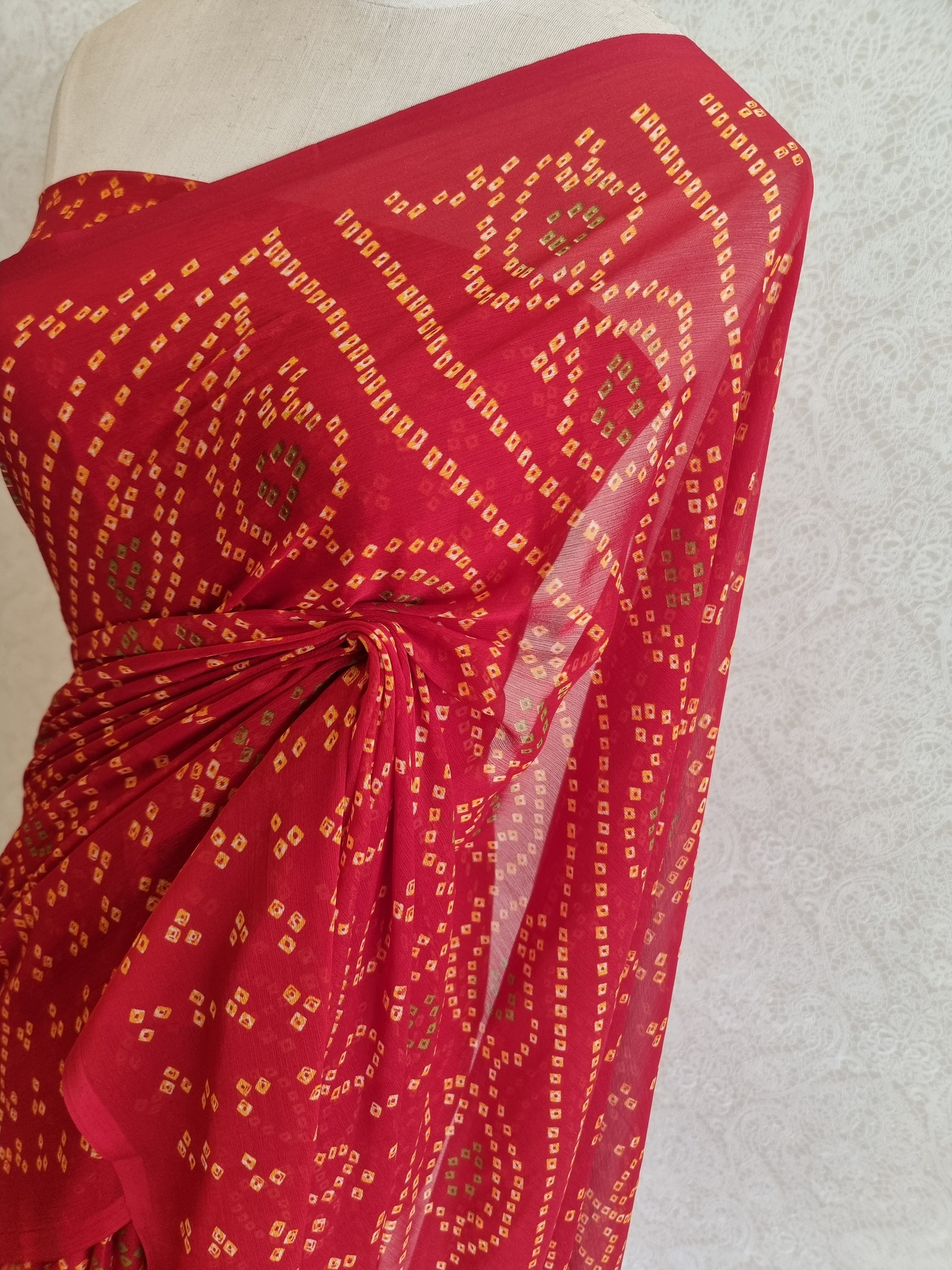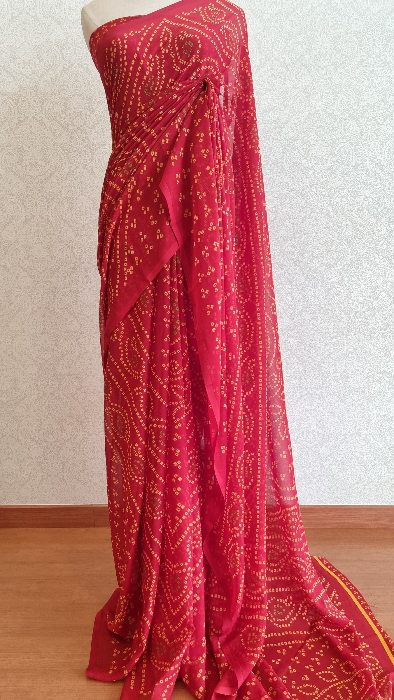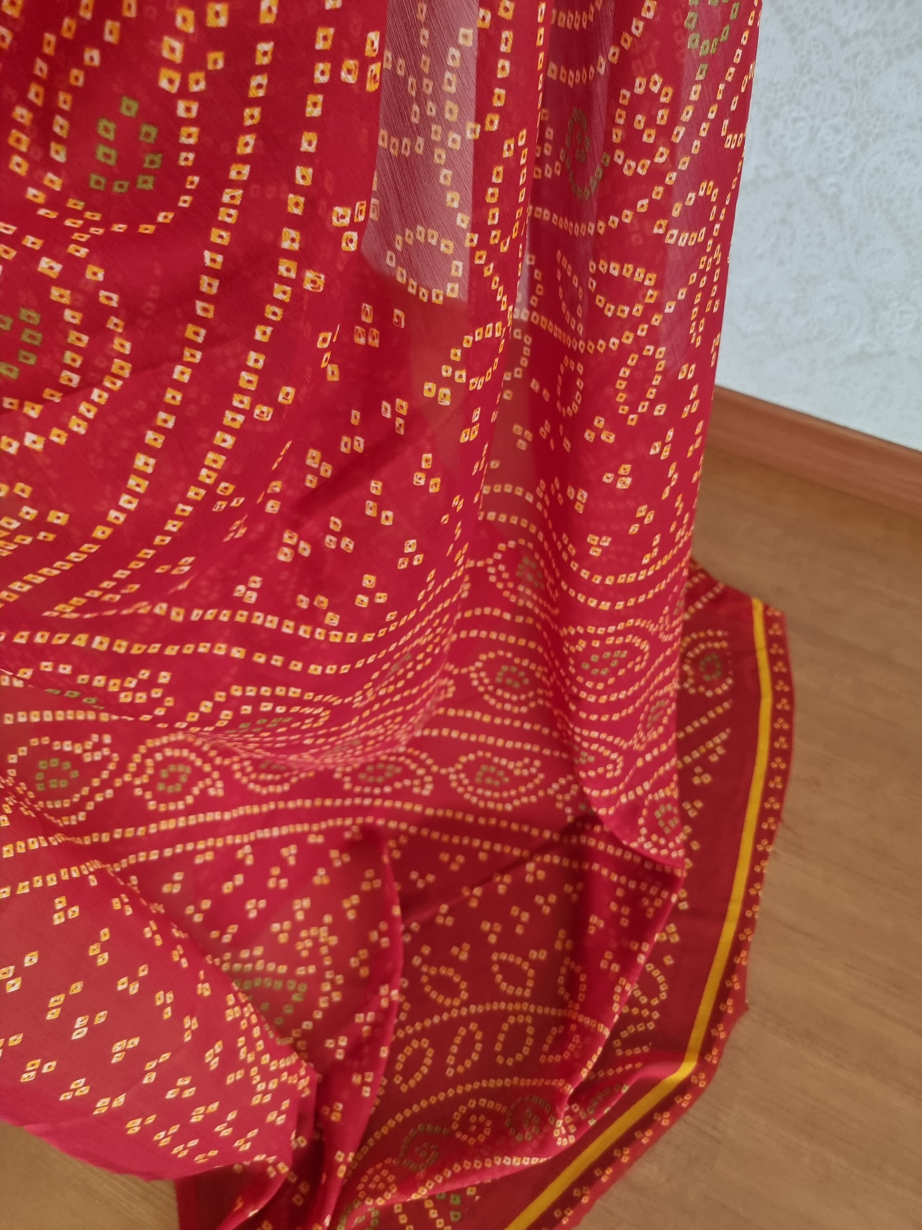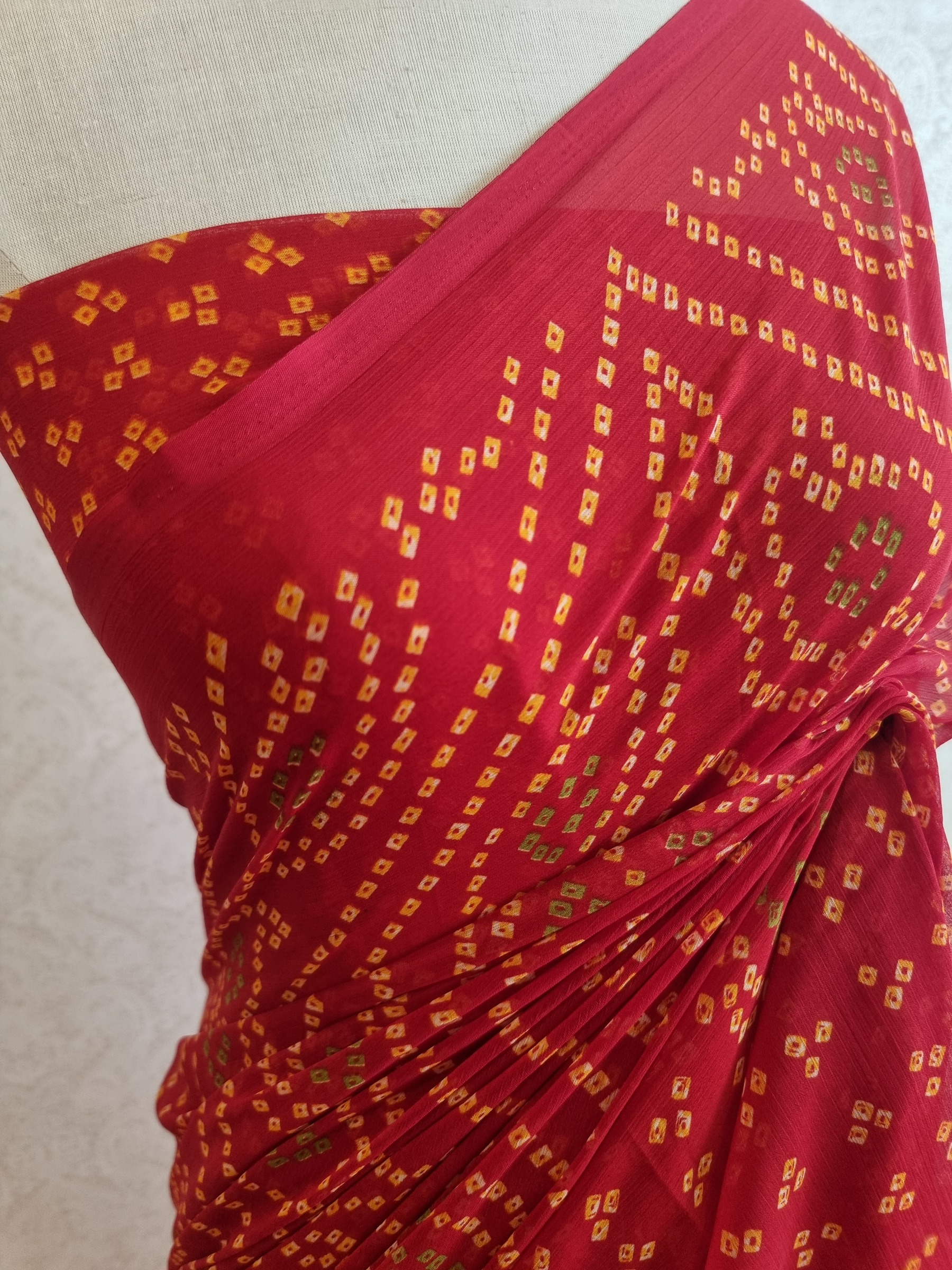 Lightweight and soft mixed chiffon saree in Bandhani design and attached contrast design blouse material.