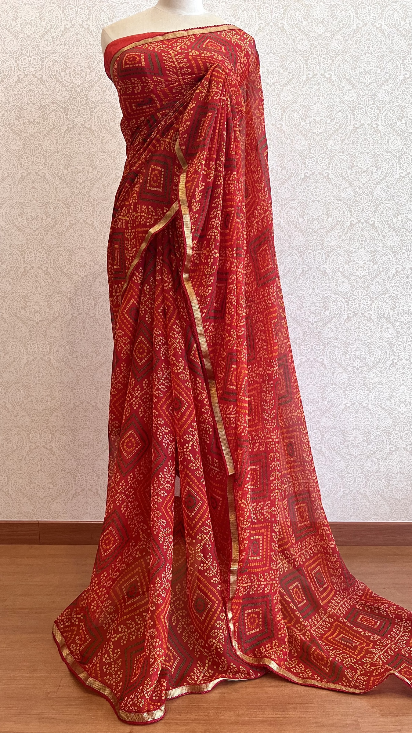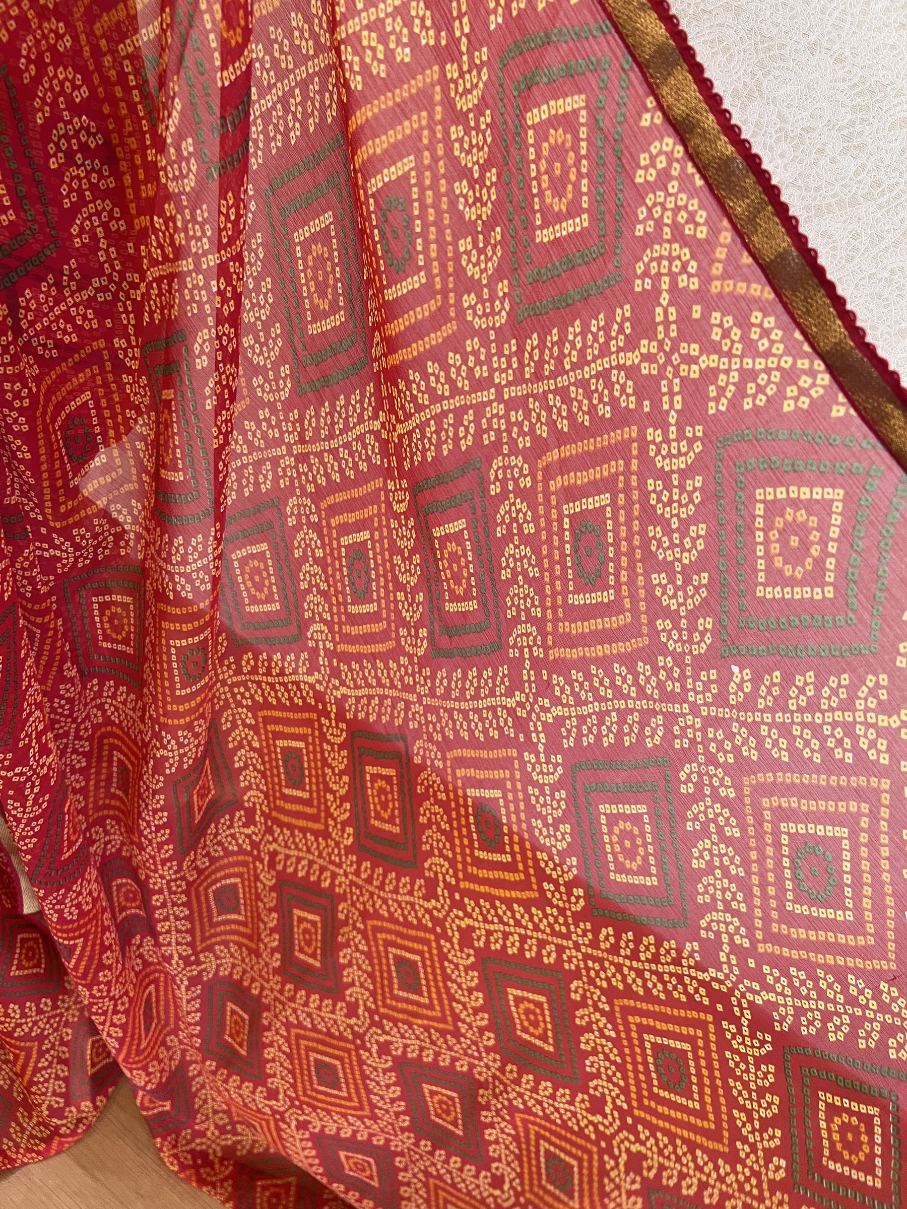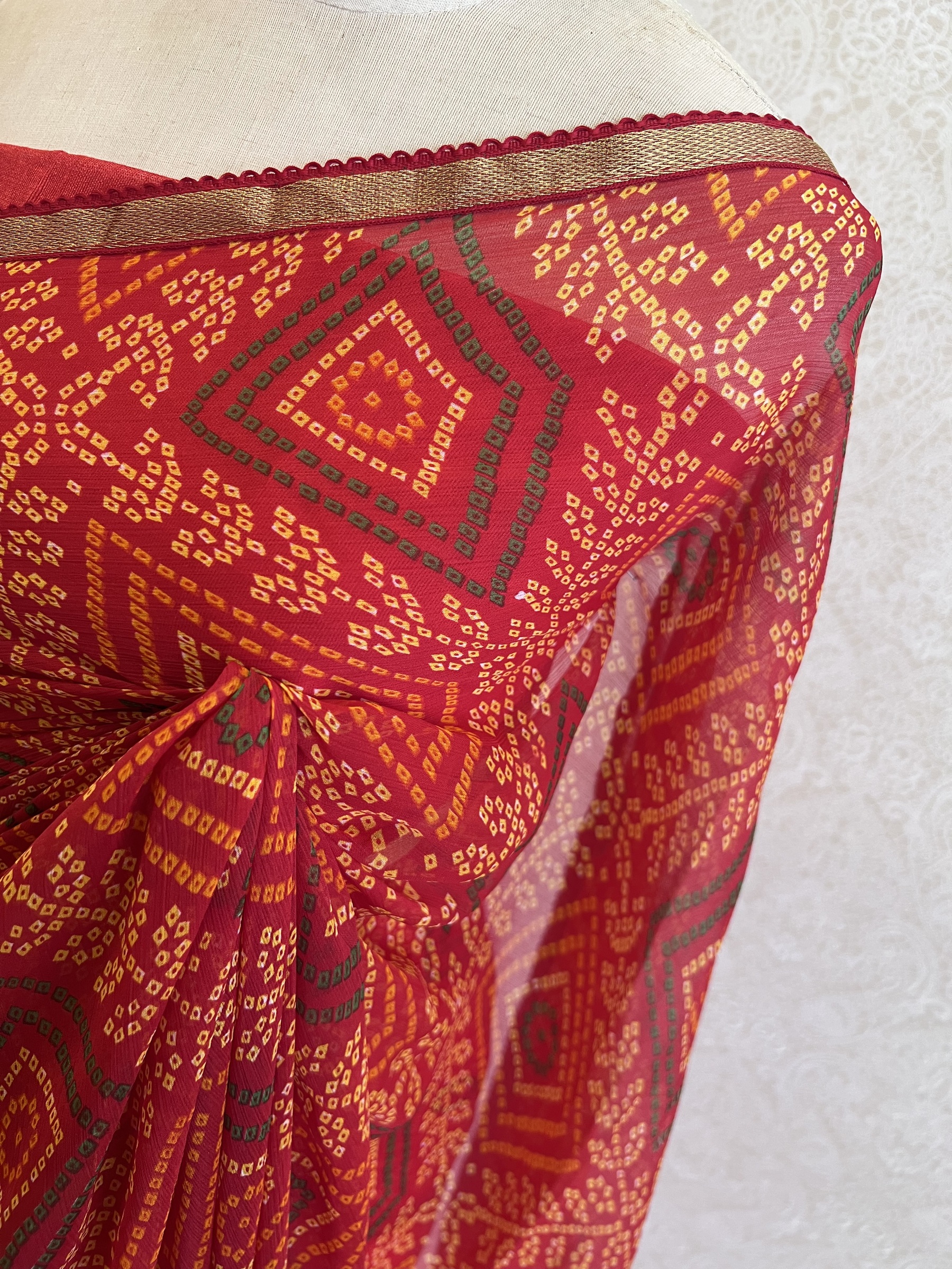 Lightweight and soft mixed chiffon saree in Bandhani design and attached running colour plain blouse material.