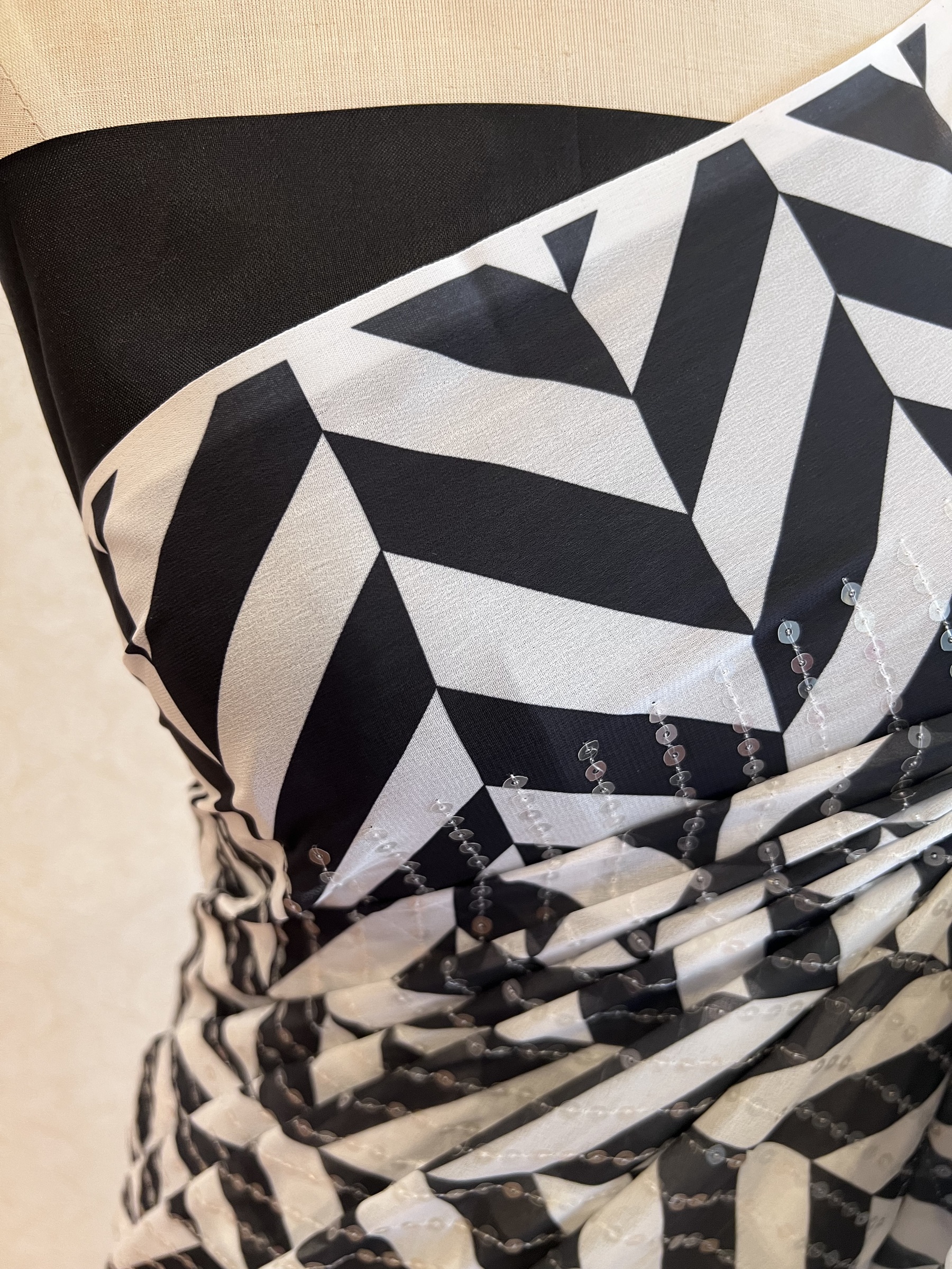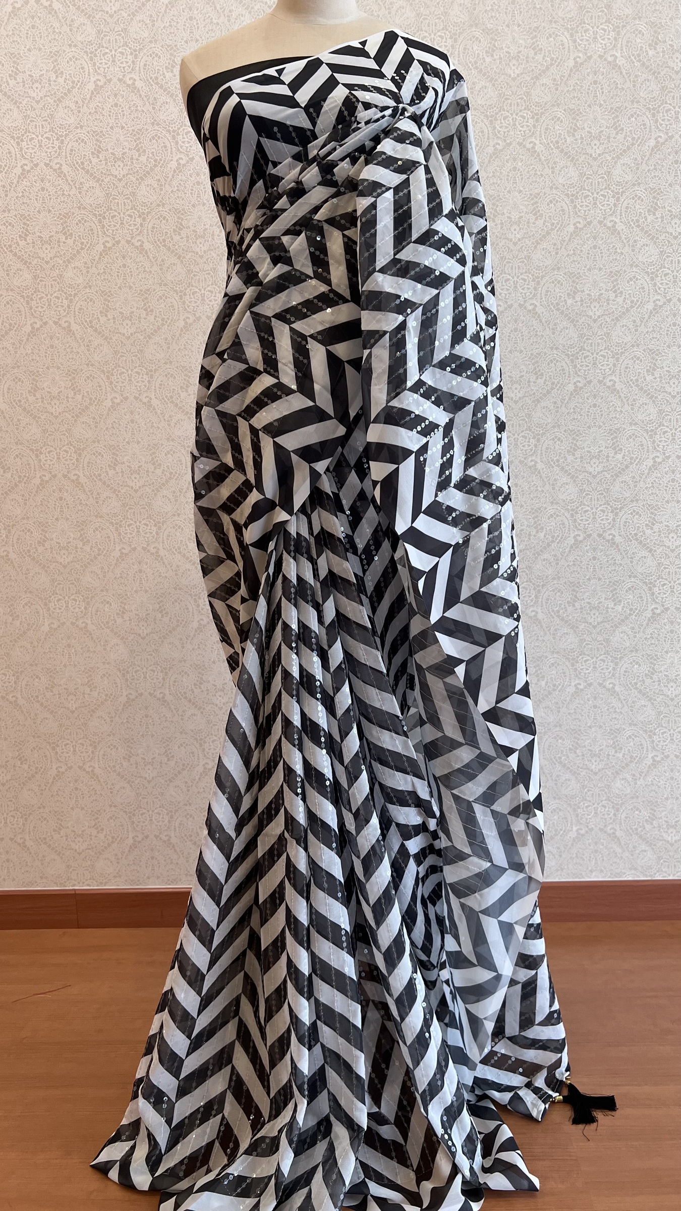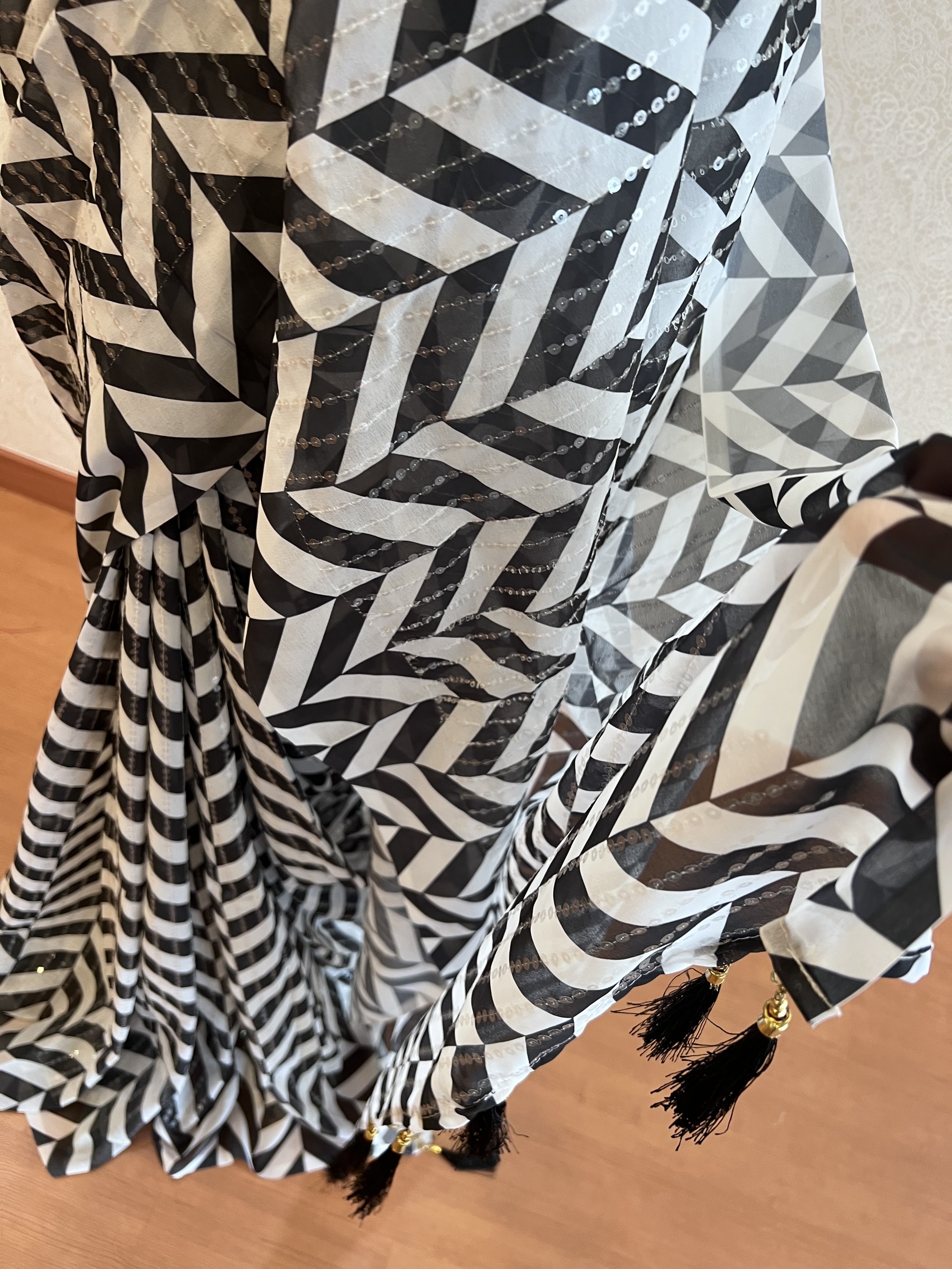 Lightweight and soft mixed chiffon saree with abstract design and full sequins on body and attached black colour blouse material.