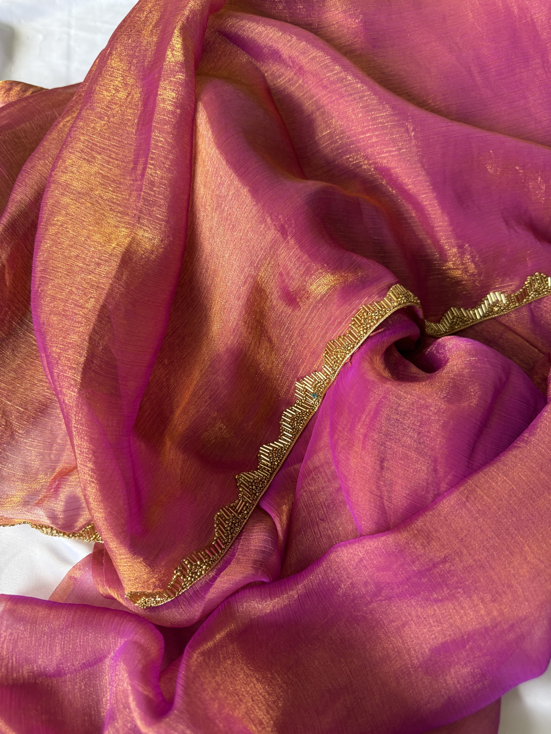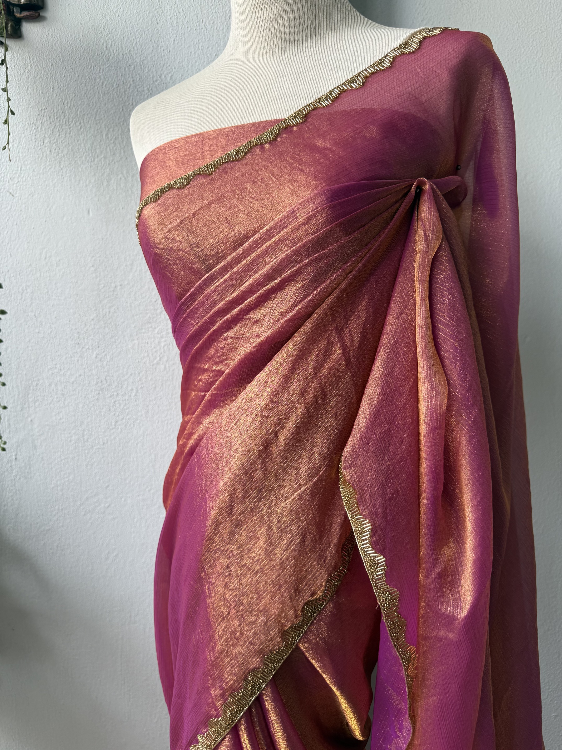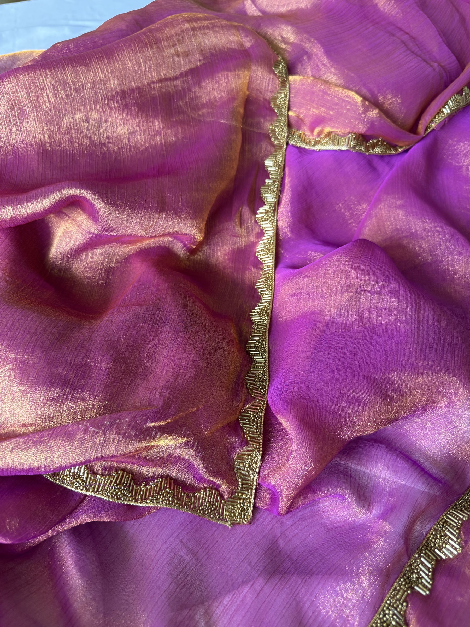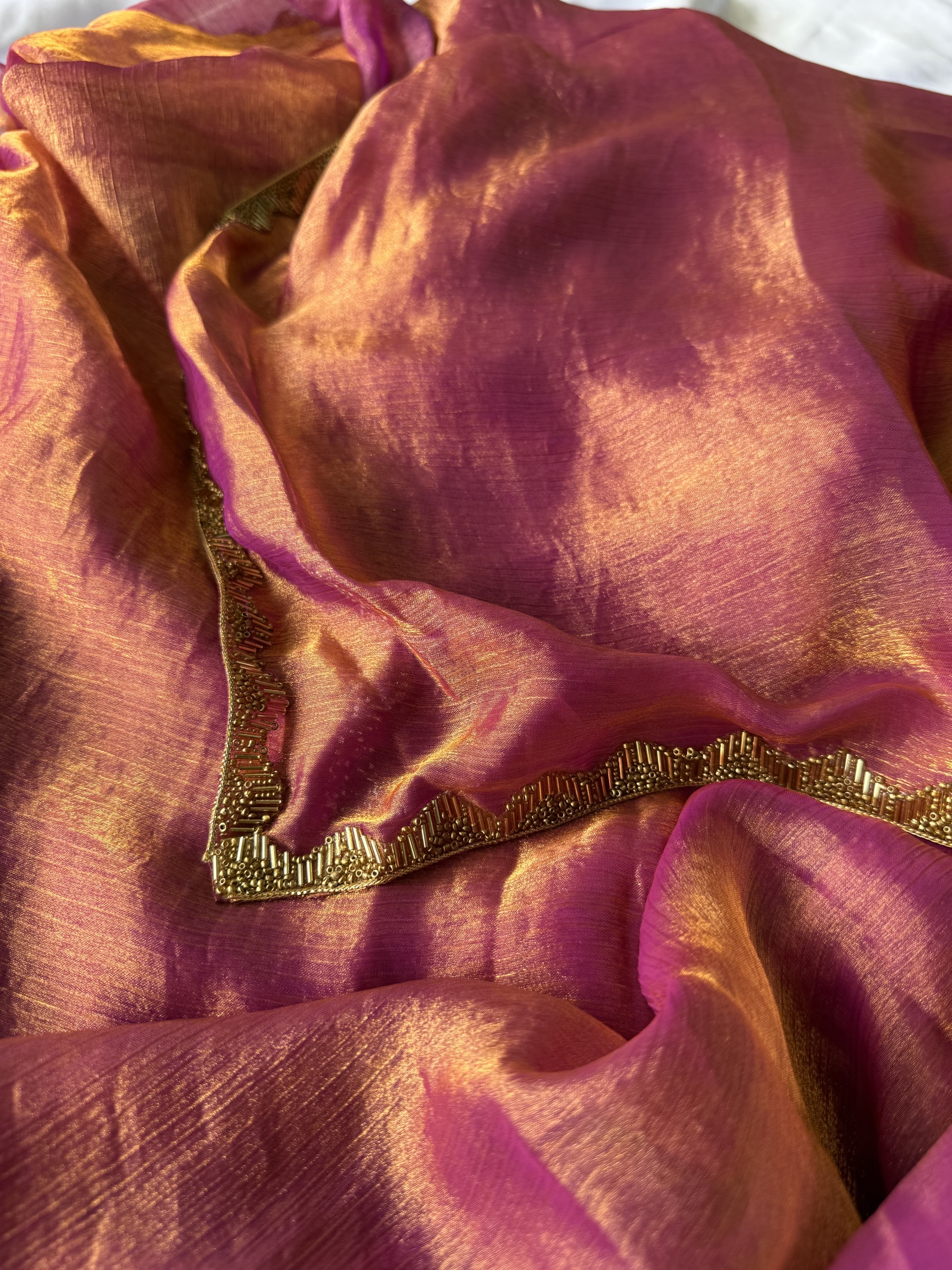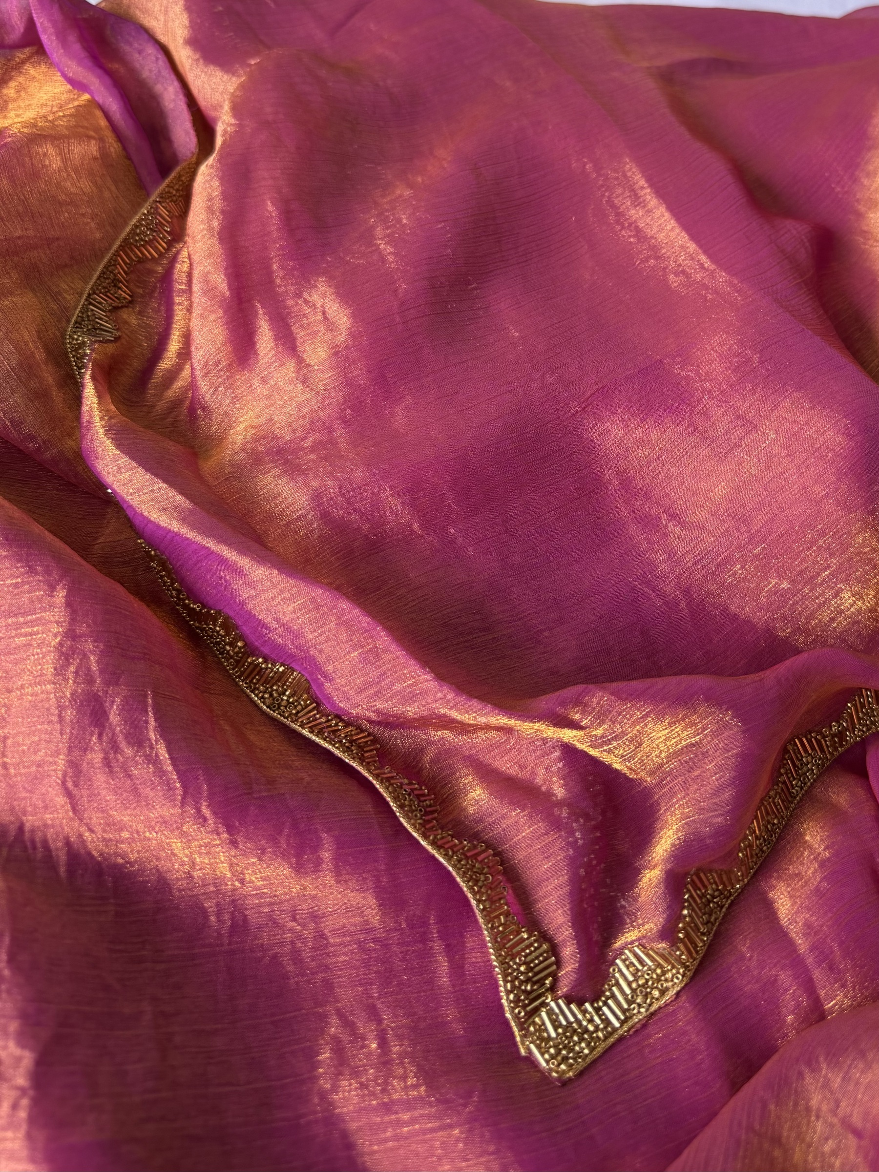 Lightweight and soft synthetic satin tissue mix saree with Aari work border and comes with attached running blouse material.