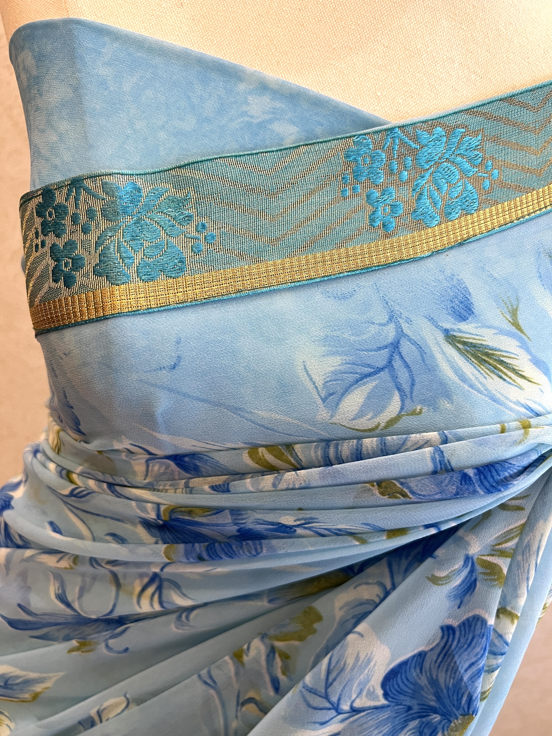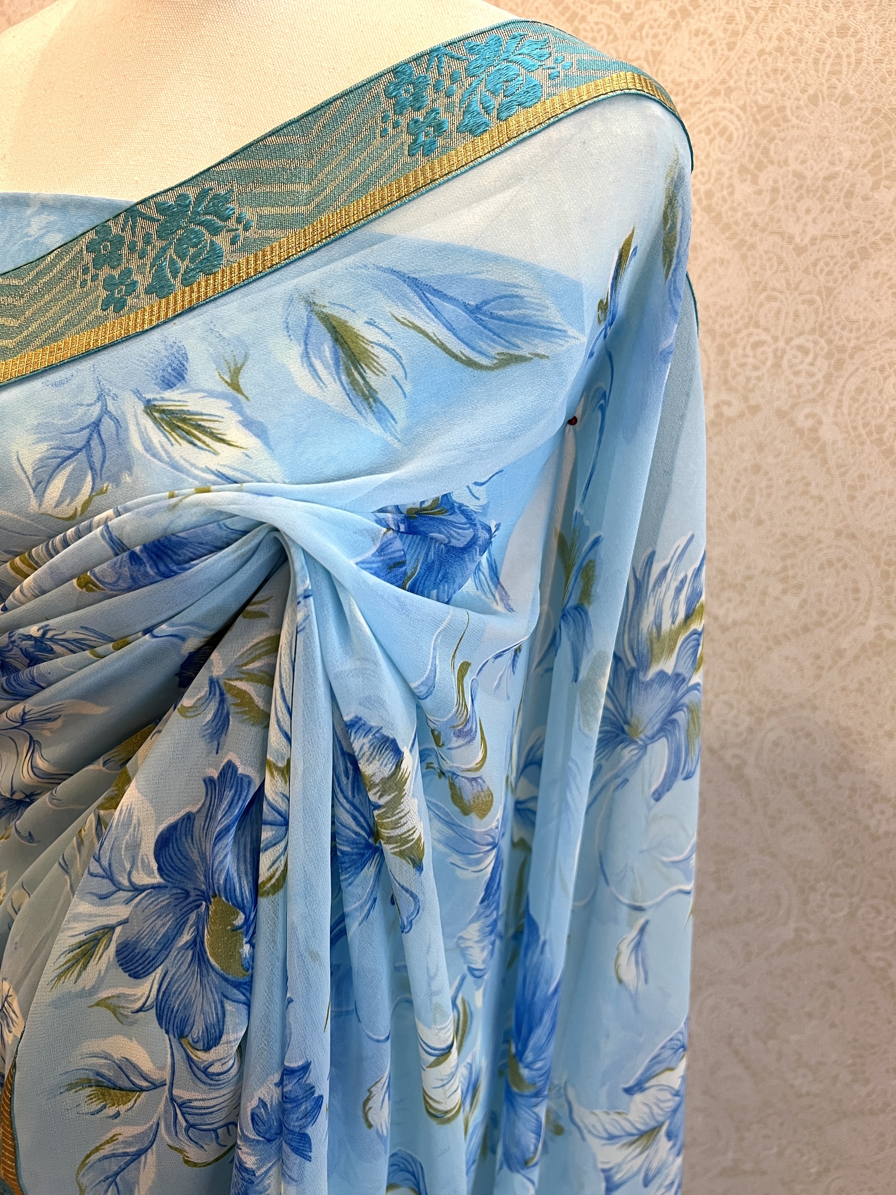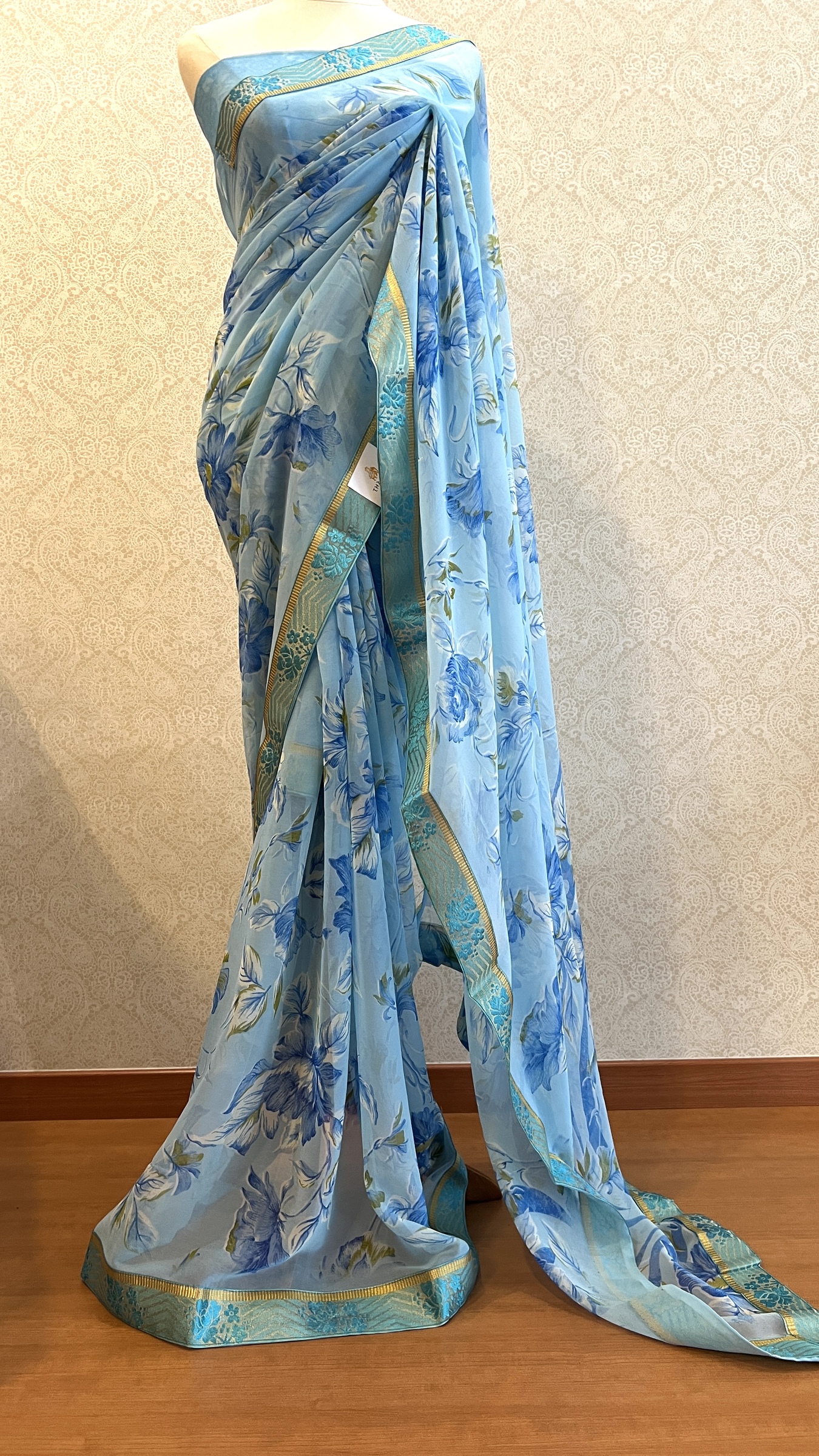 Lightweight and soft mixed chiffon saree with digital floral prints, thin zari border and attached contrast colour blouse material.