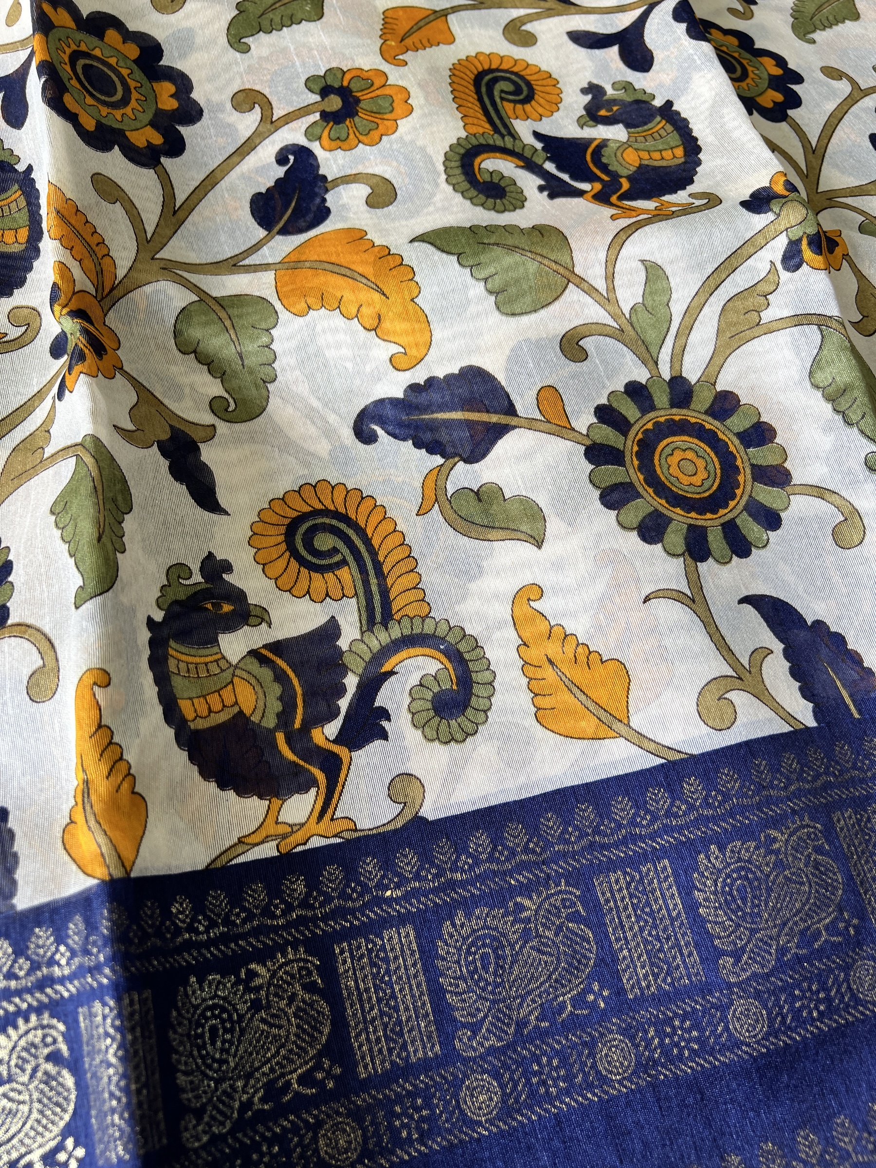 Lightweight synthetic Tussar Kalamkari design saree with comes with attached contrast design blouse material.