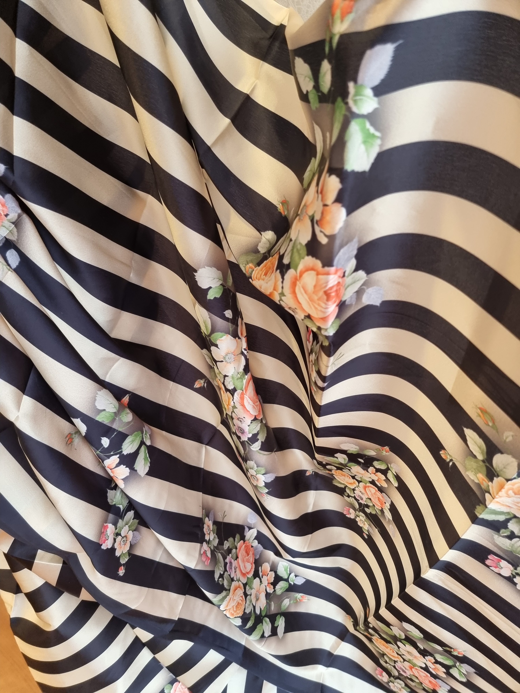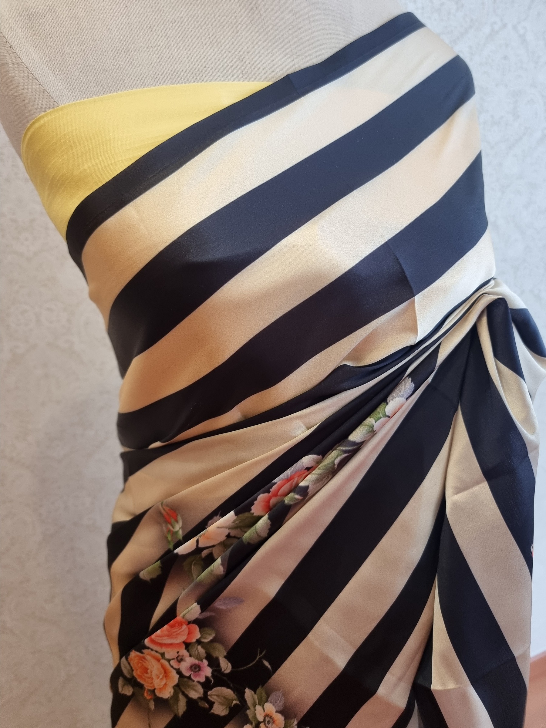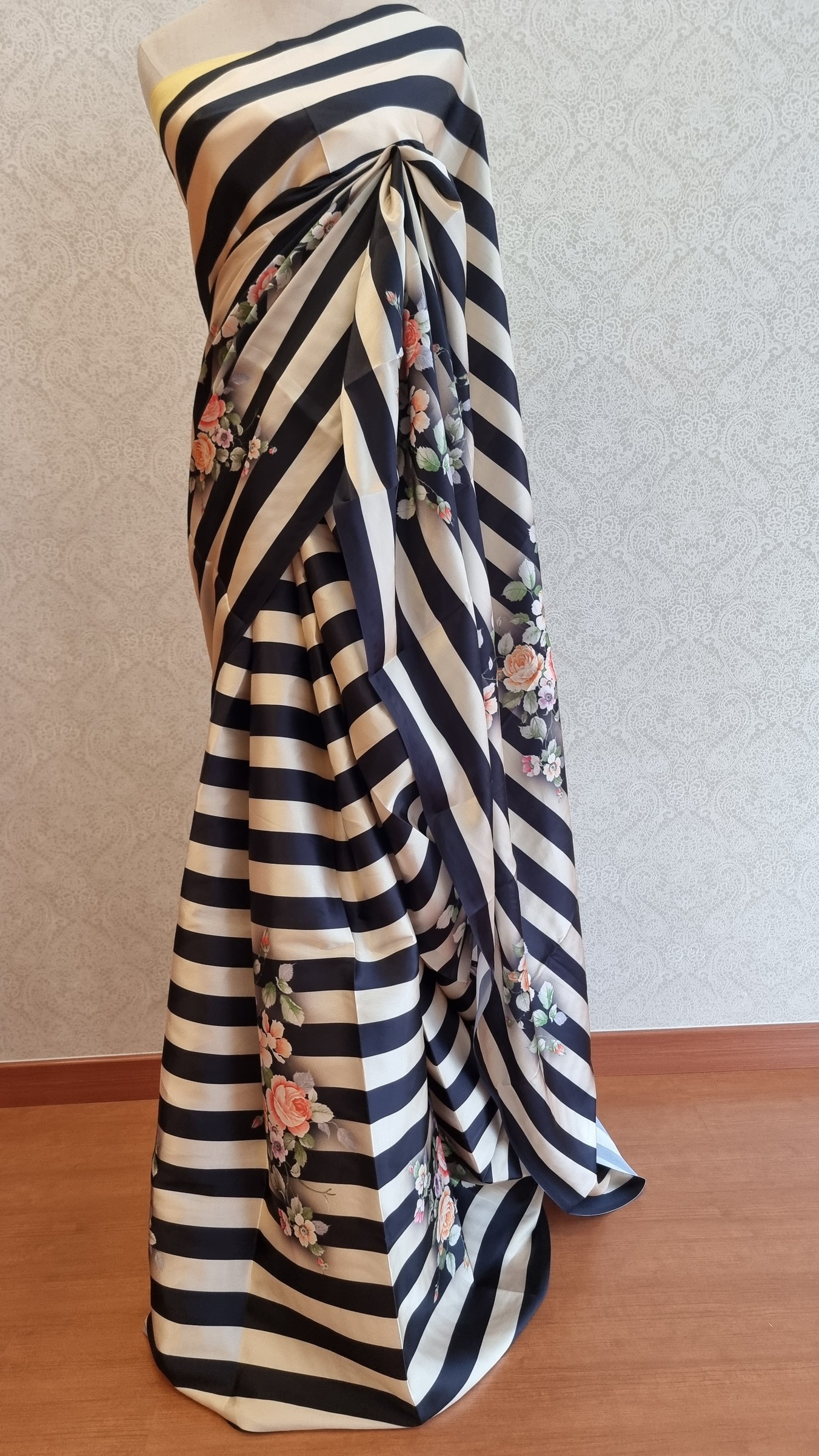 Synthetic satin floral saree with digital floral prints and attached contrast design blouse material.