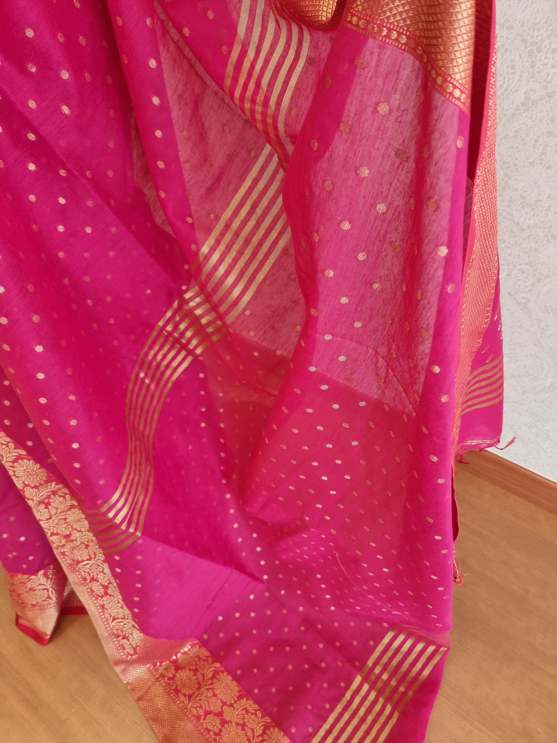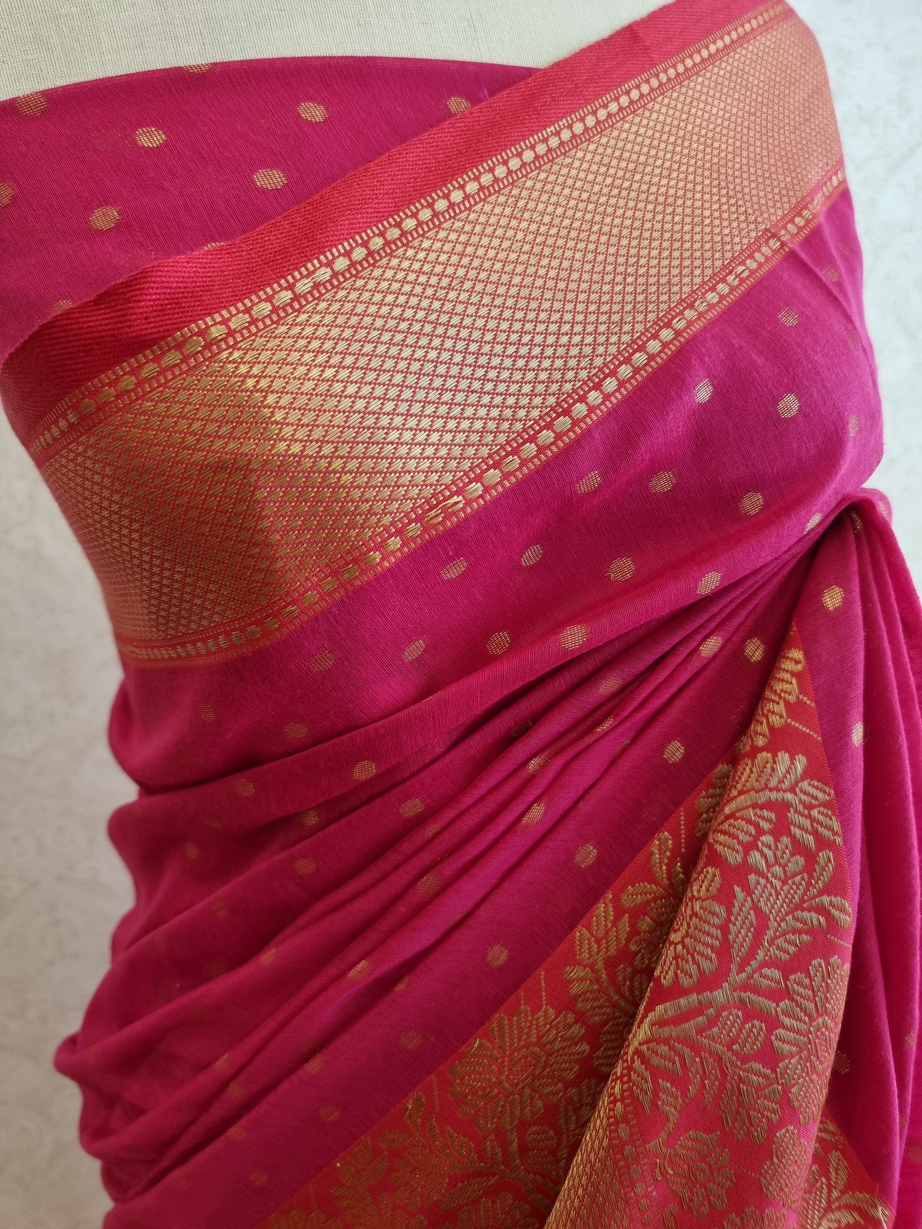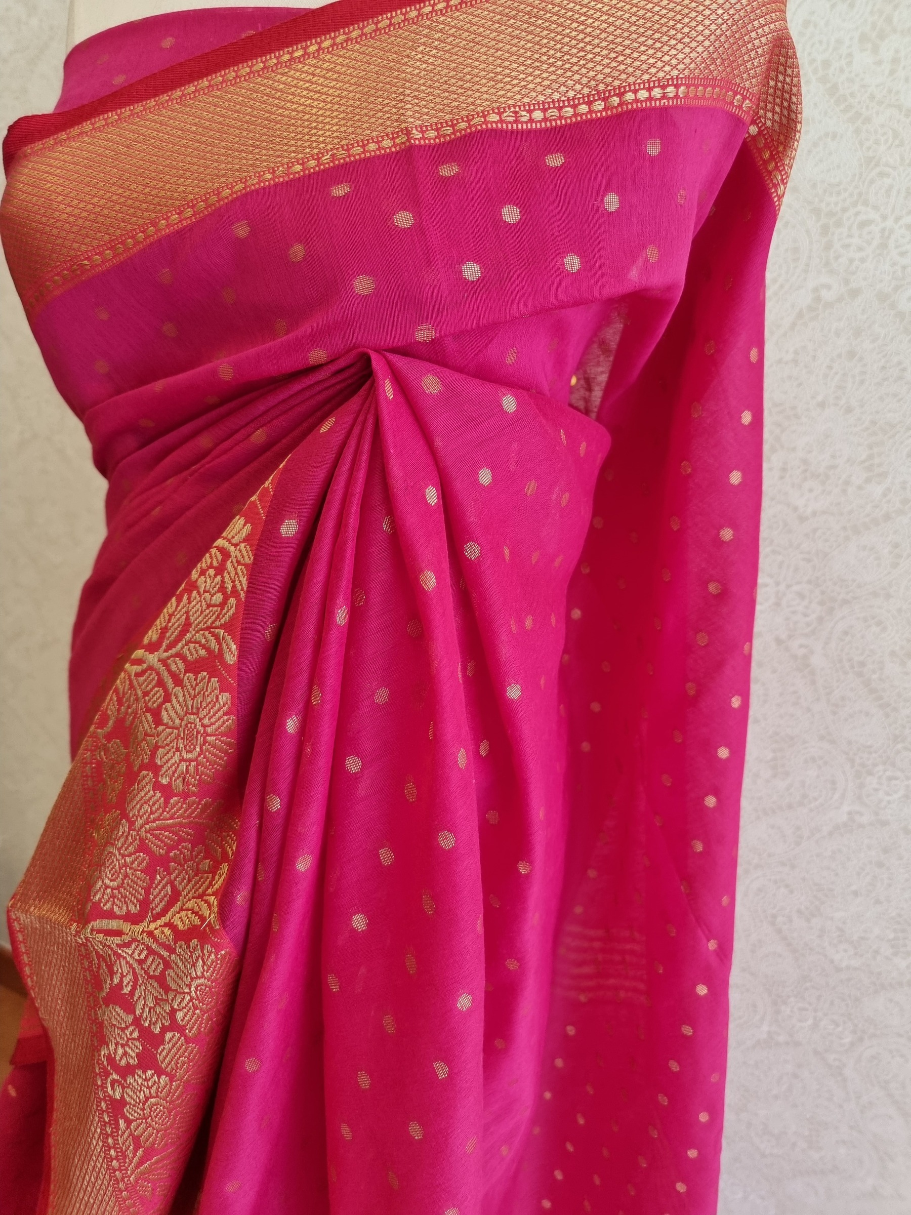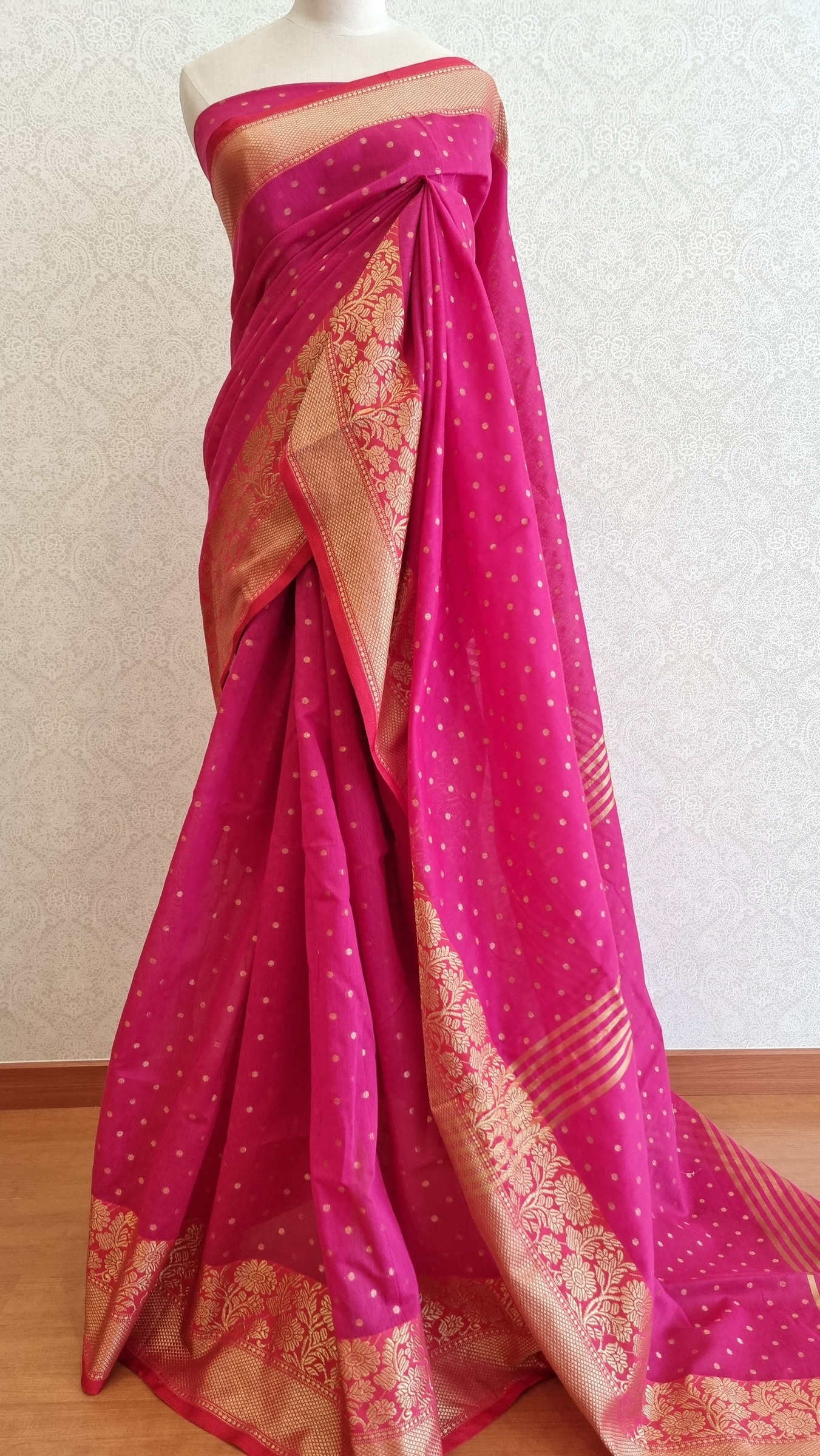 Benarasi inspired cotton saree with butta weaving design on body and comes with running colour blouse material.