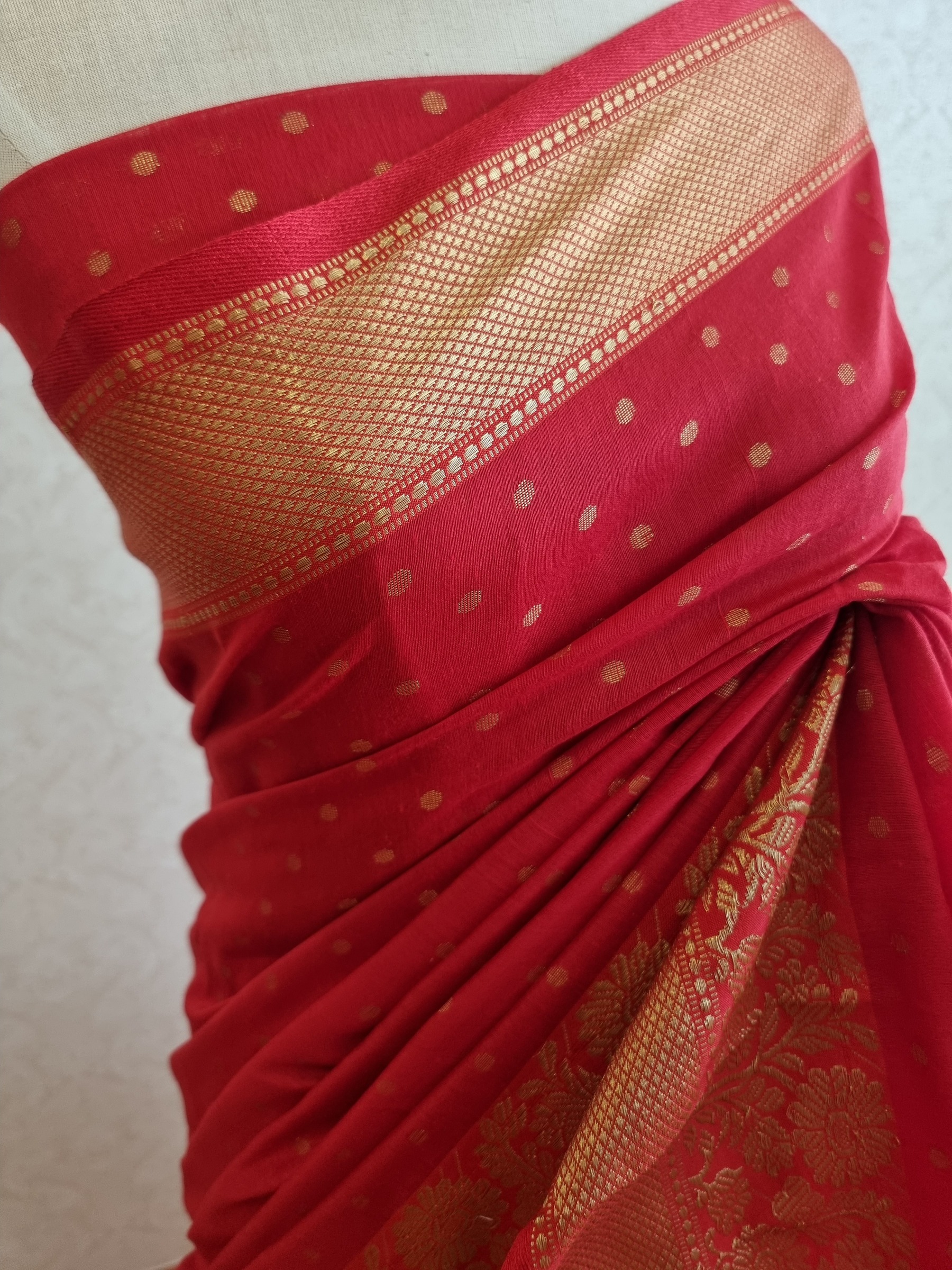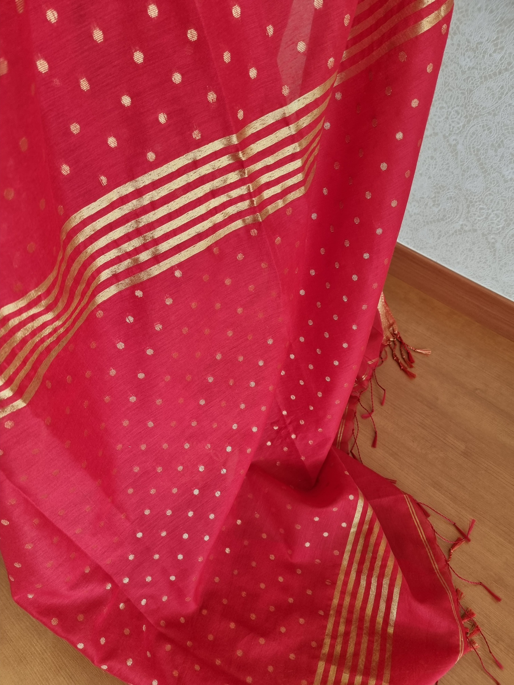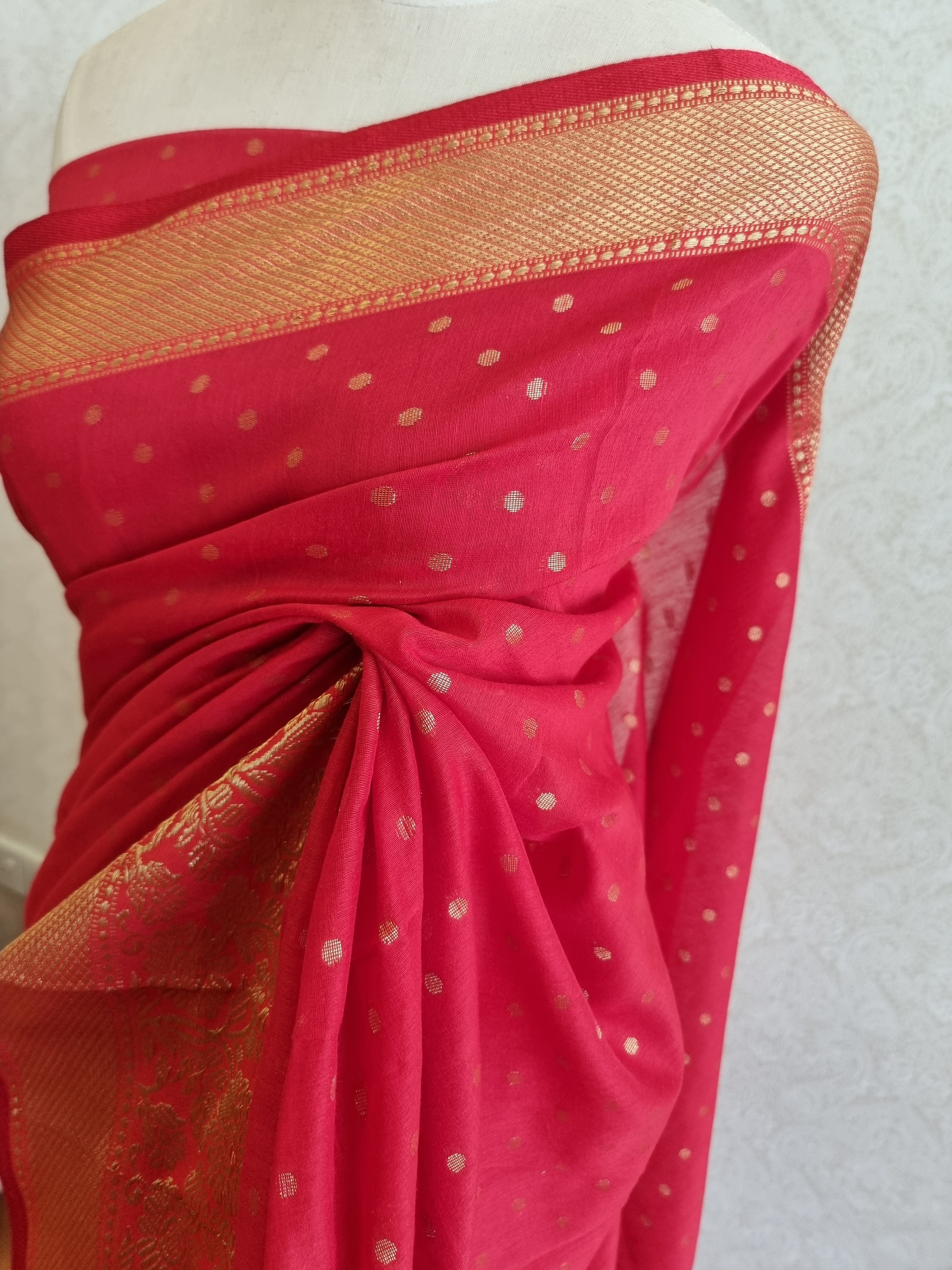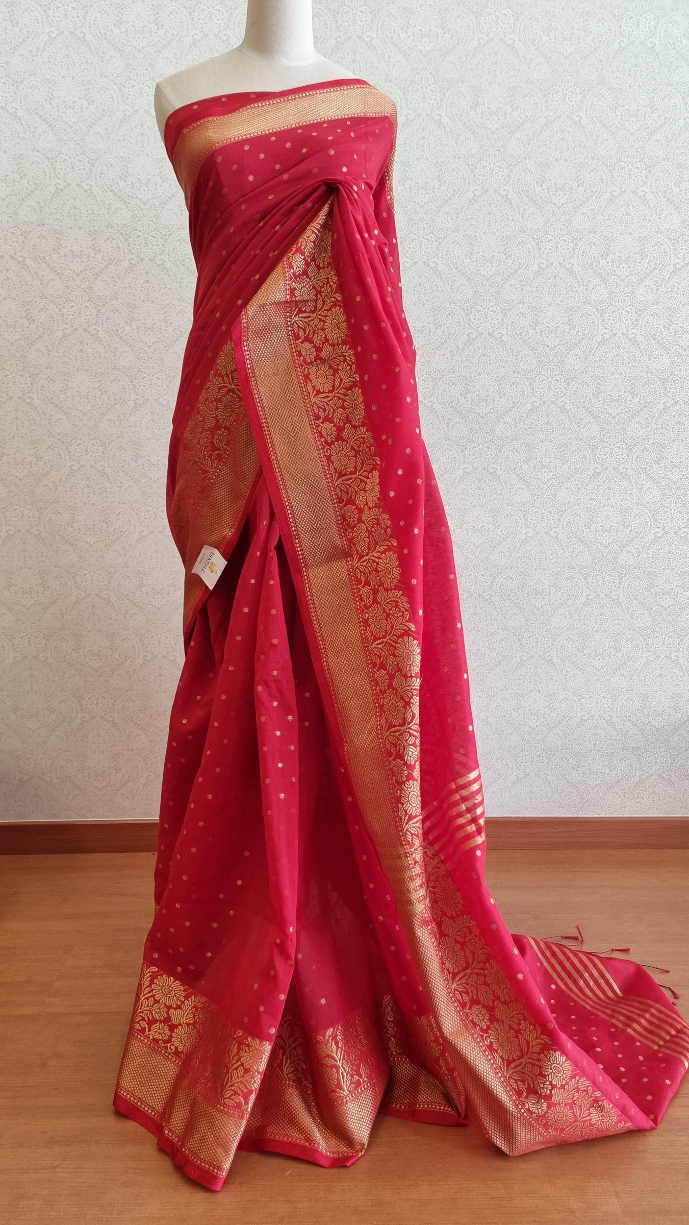 Benarasi inspired cotton saree with butta weaving design on body and comes with running colour blouse material.