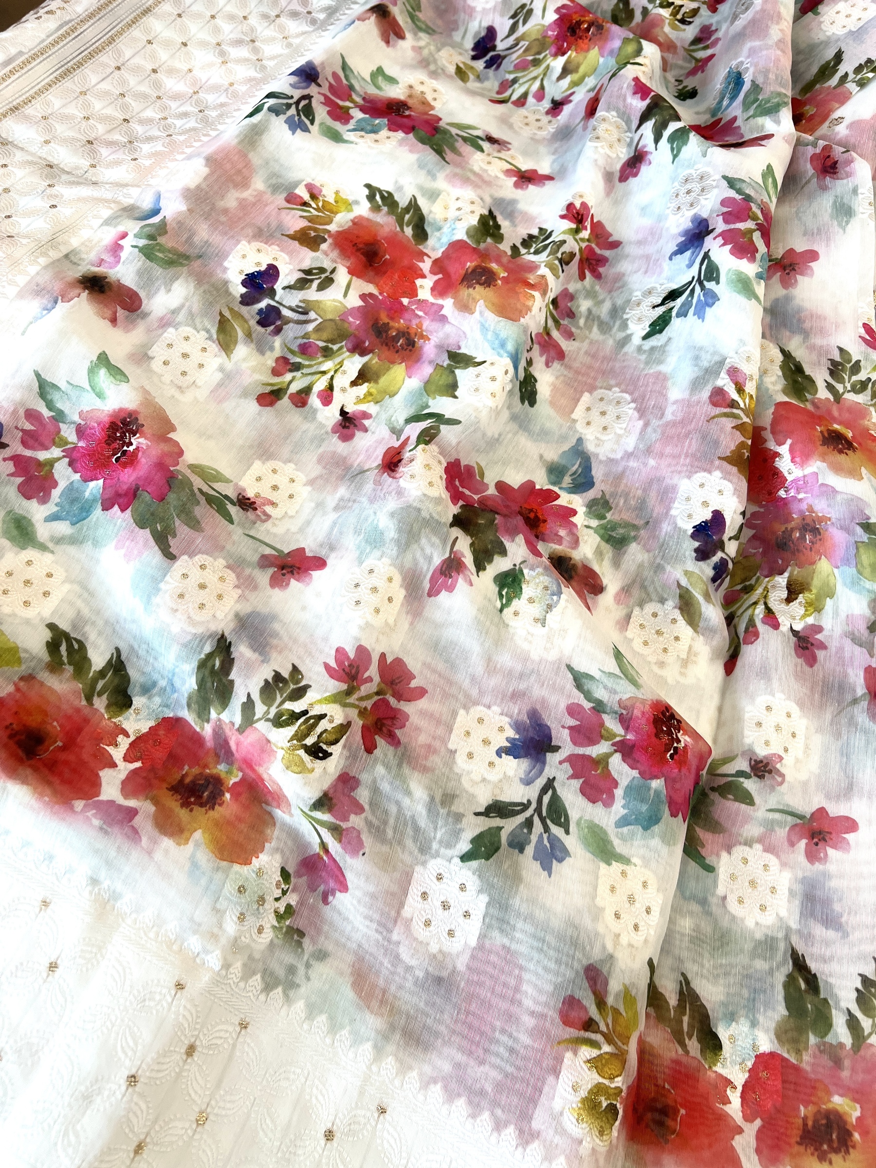 Mixed cotton saree with watercolour effect floral design on body and contrast white border and comes with attached contrast design blouse material.