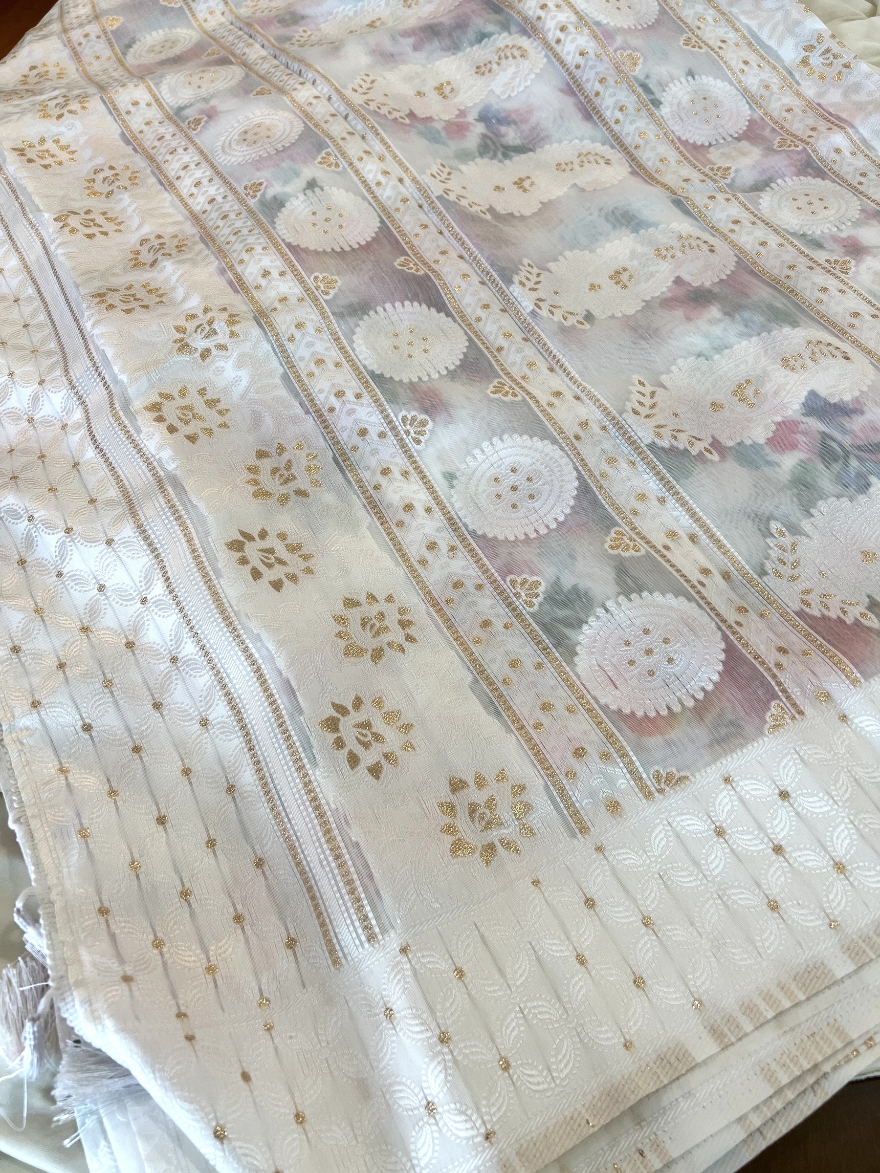 - This is a printed saree and it may have stains, smudges and misprints and they are not considered as damages.