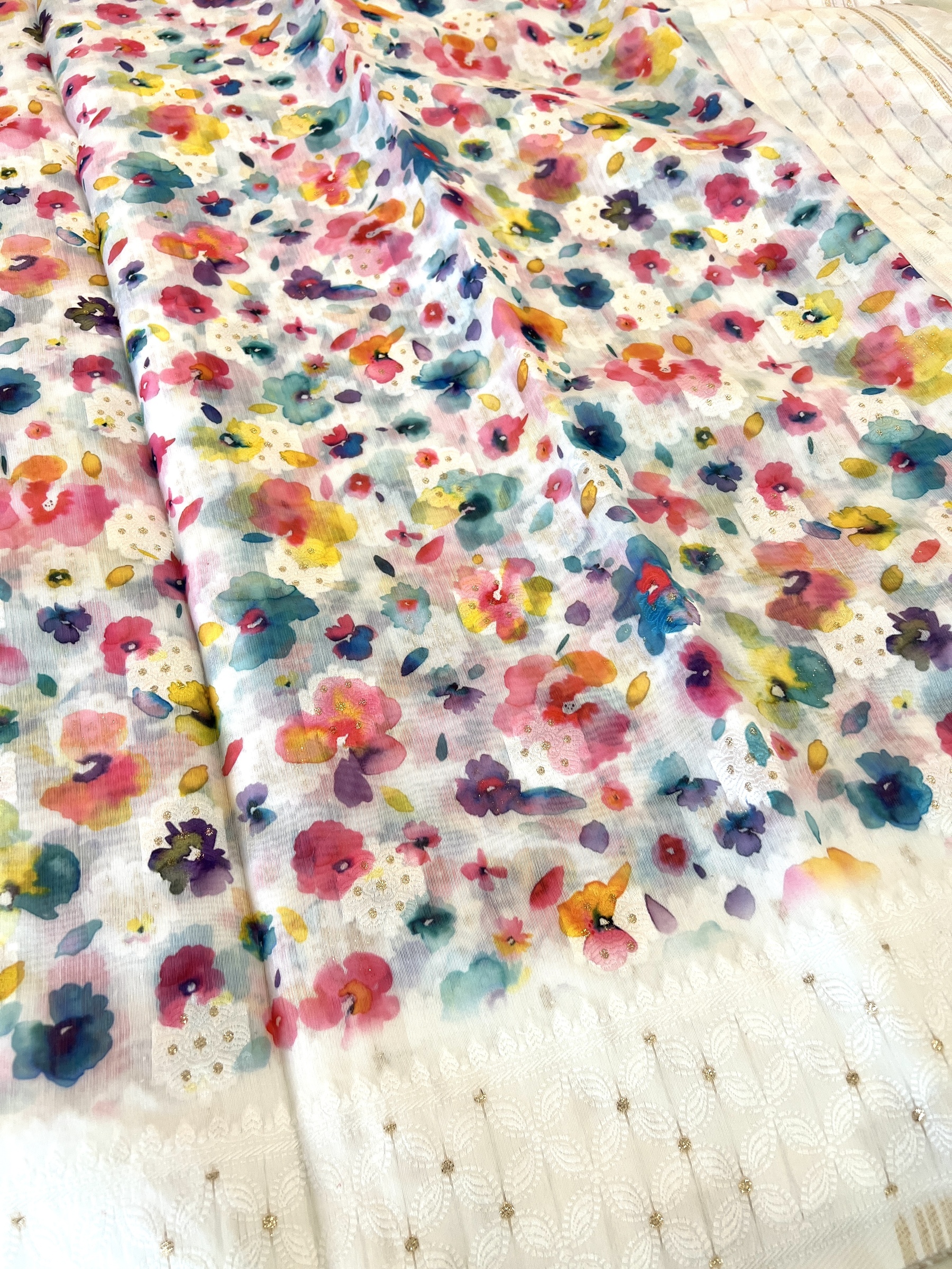 Mixed cotton saree with watercolour effect floral design on body and contrast white border and comes with attached contrast design blouse material.