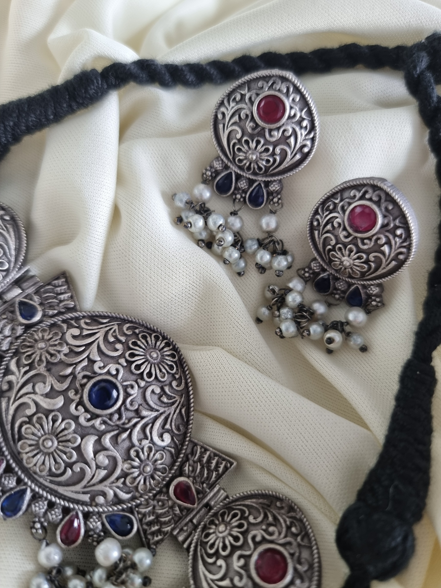 HIgh neck oxidized silver choker set embedded with artificial blue and ruby stones and adjustable string and matching earrings.
