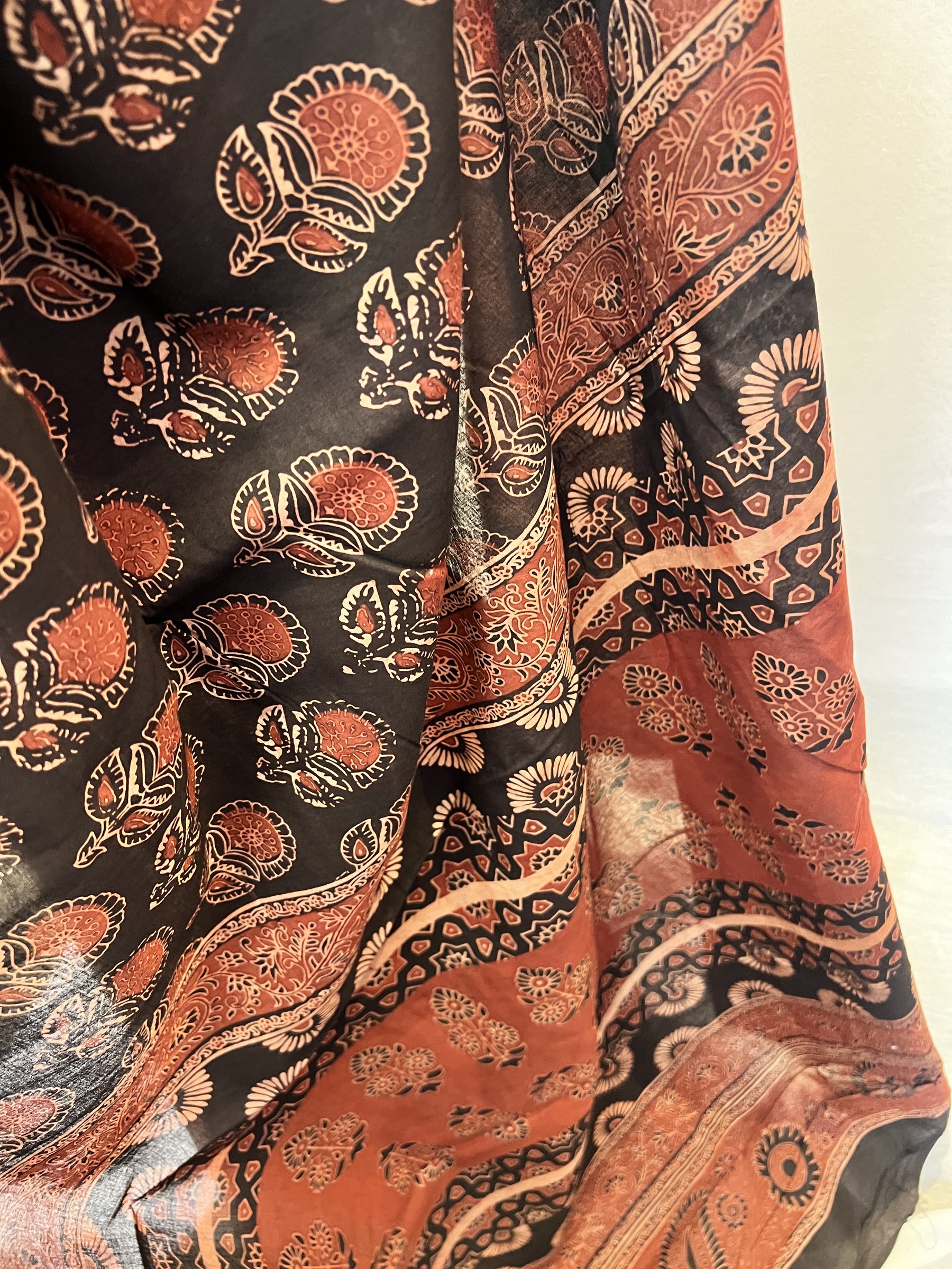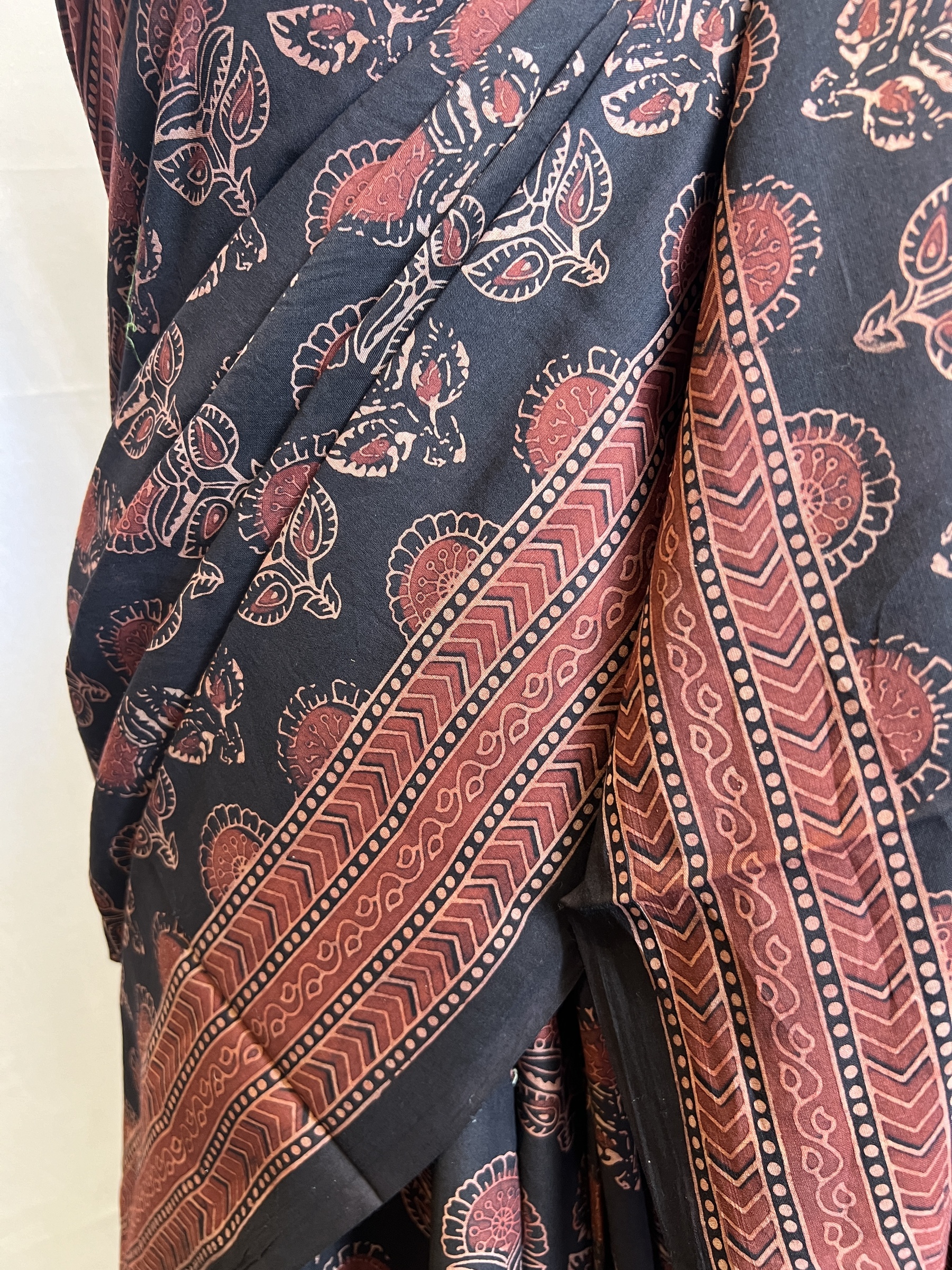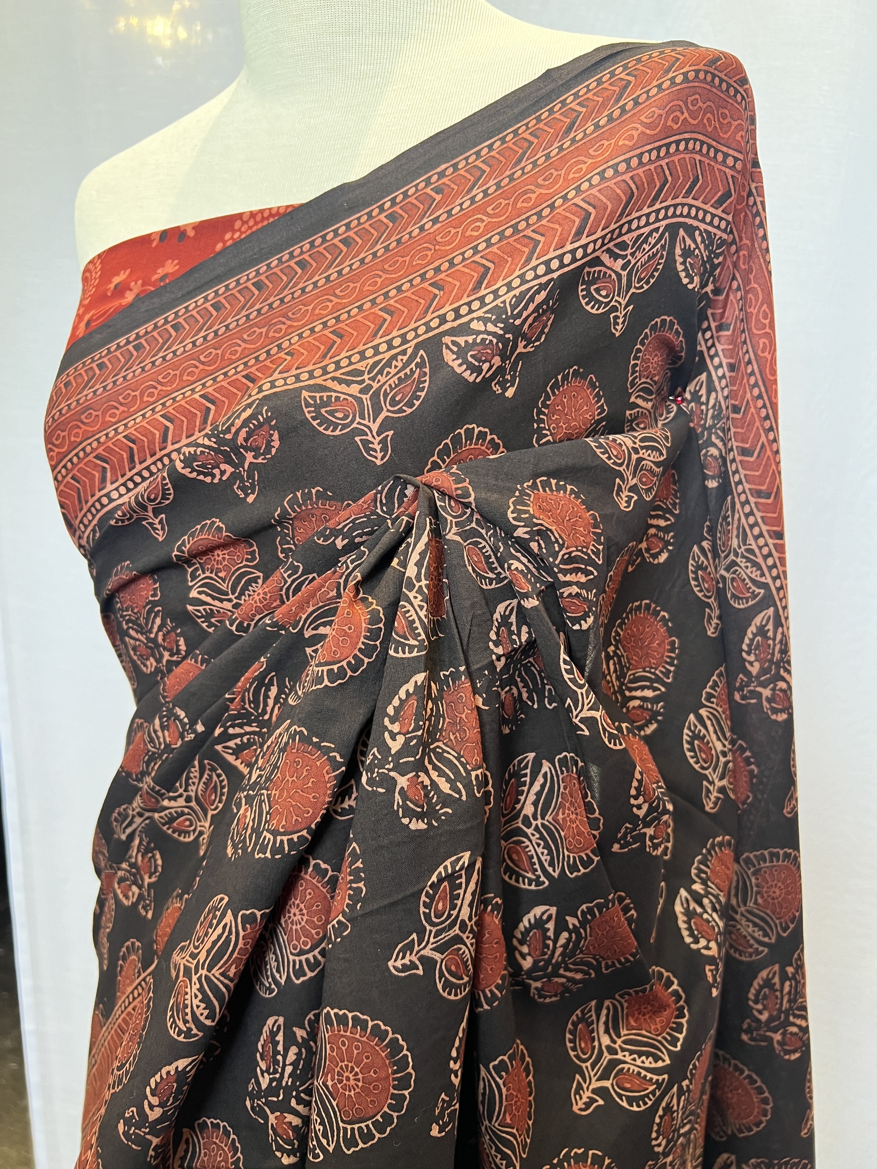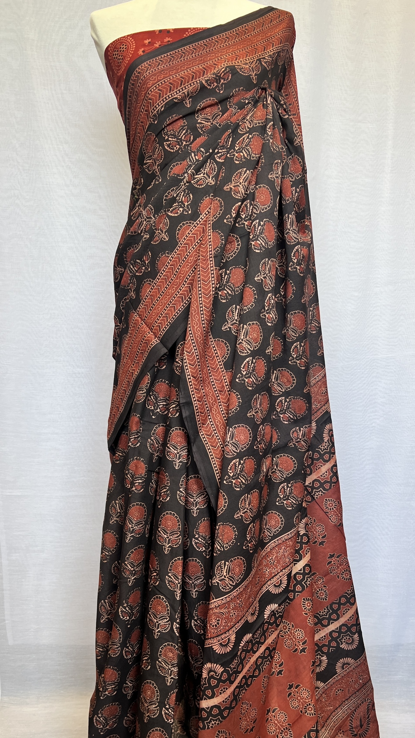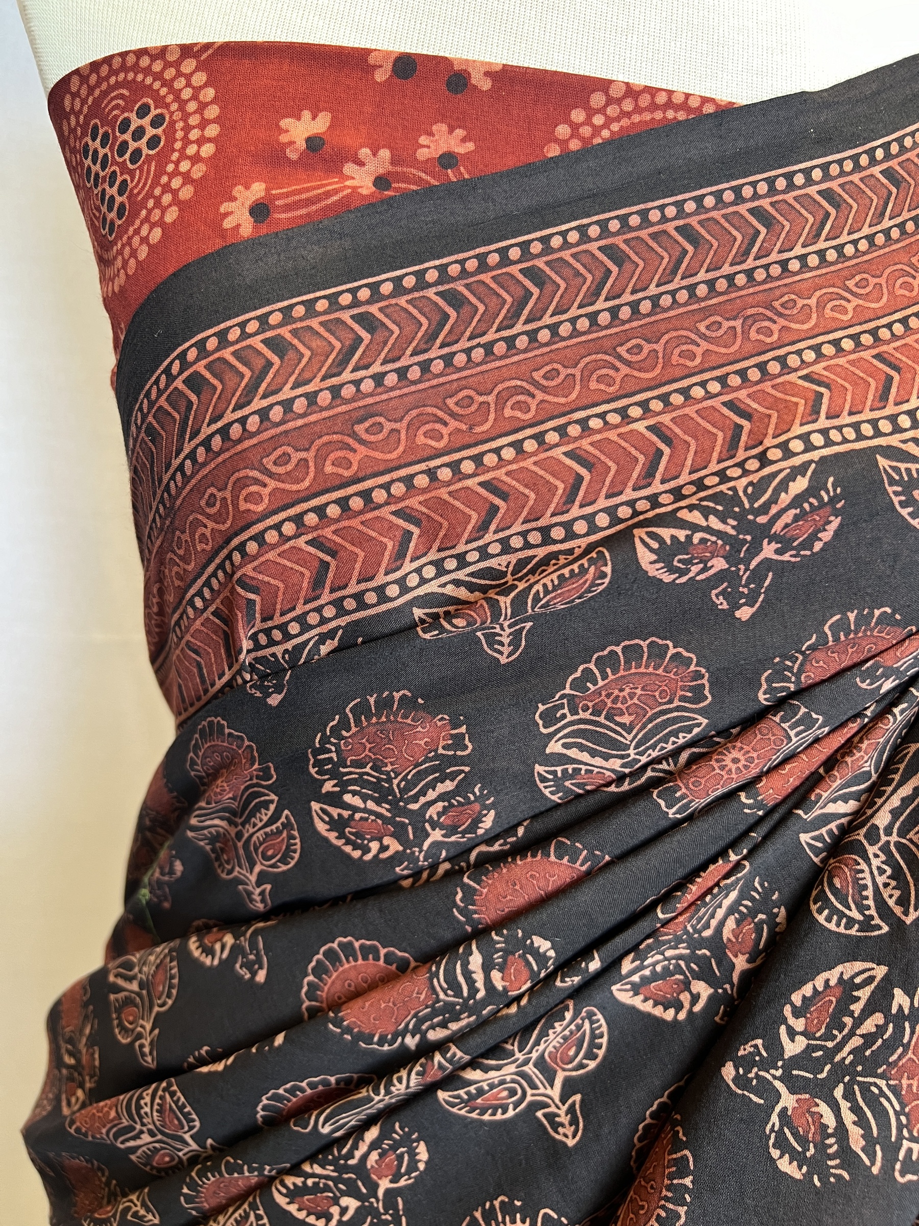 Ajrakh design inspired cotton saree with attached contrast design blouse material.