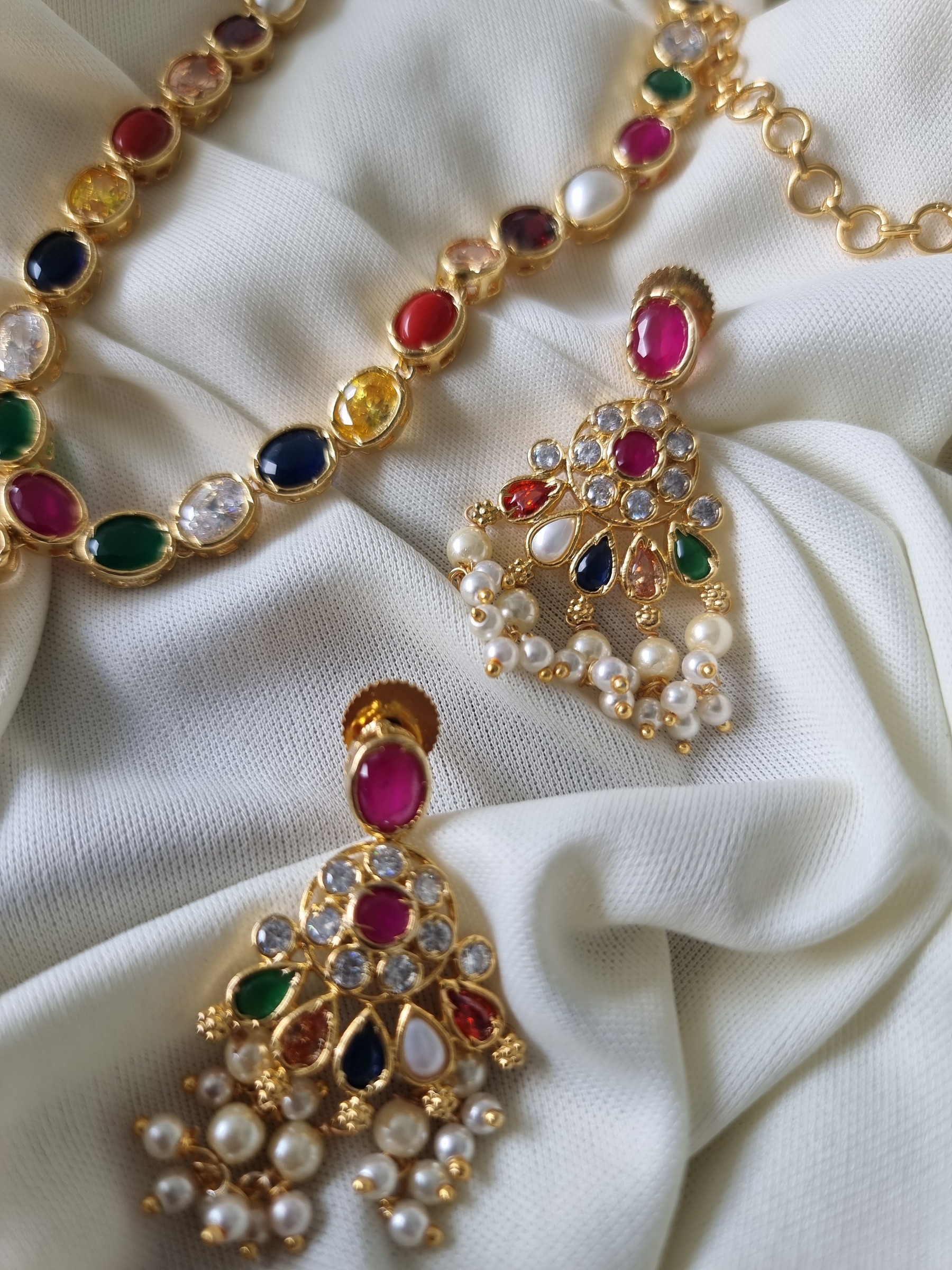 Premium quality necklace set trimmed with high quality stones and pearls and comes with matching earrings.