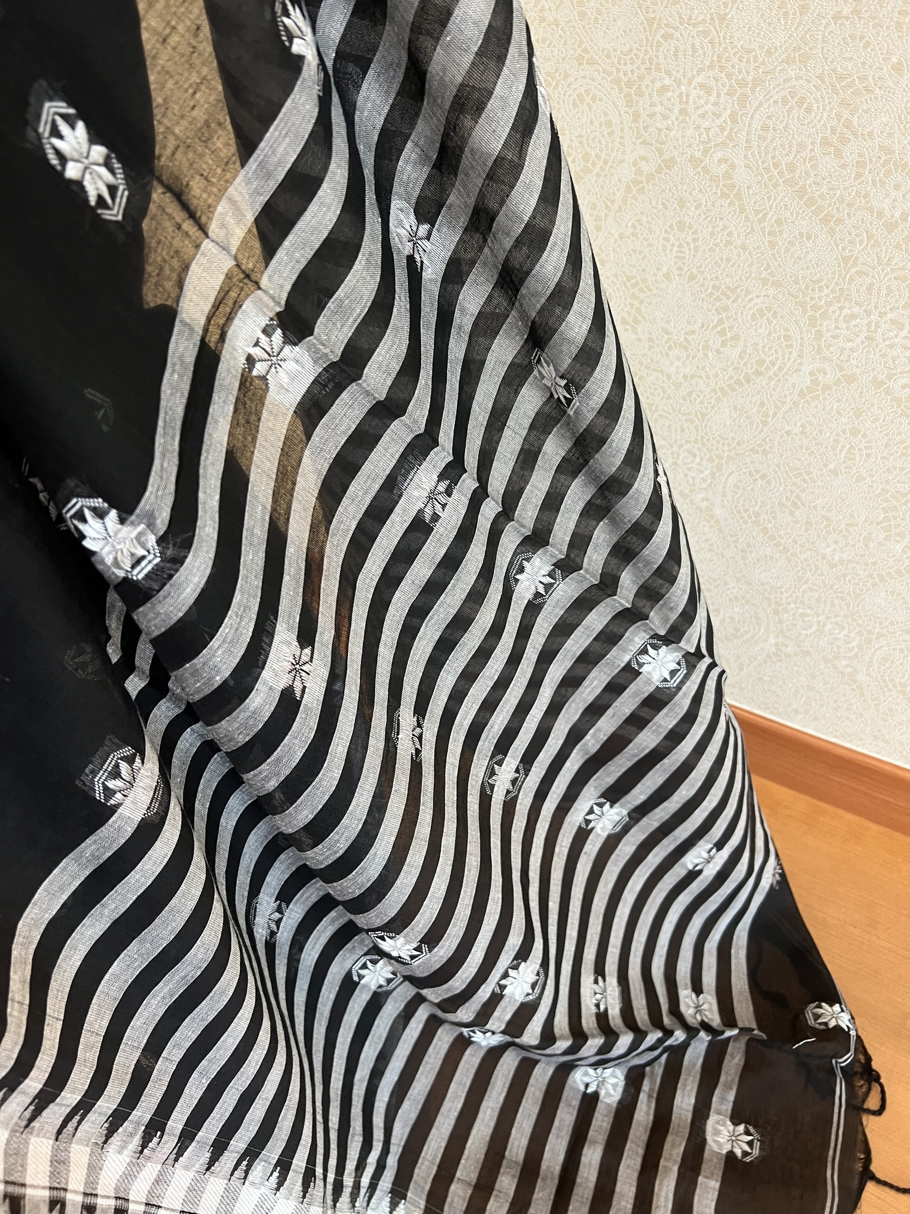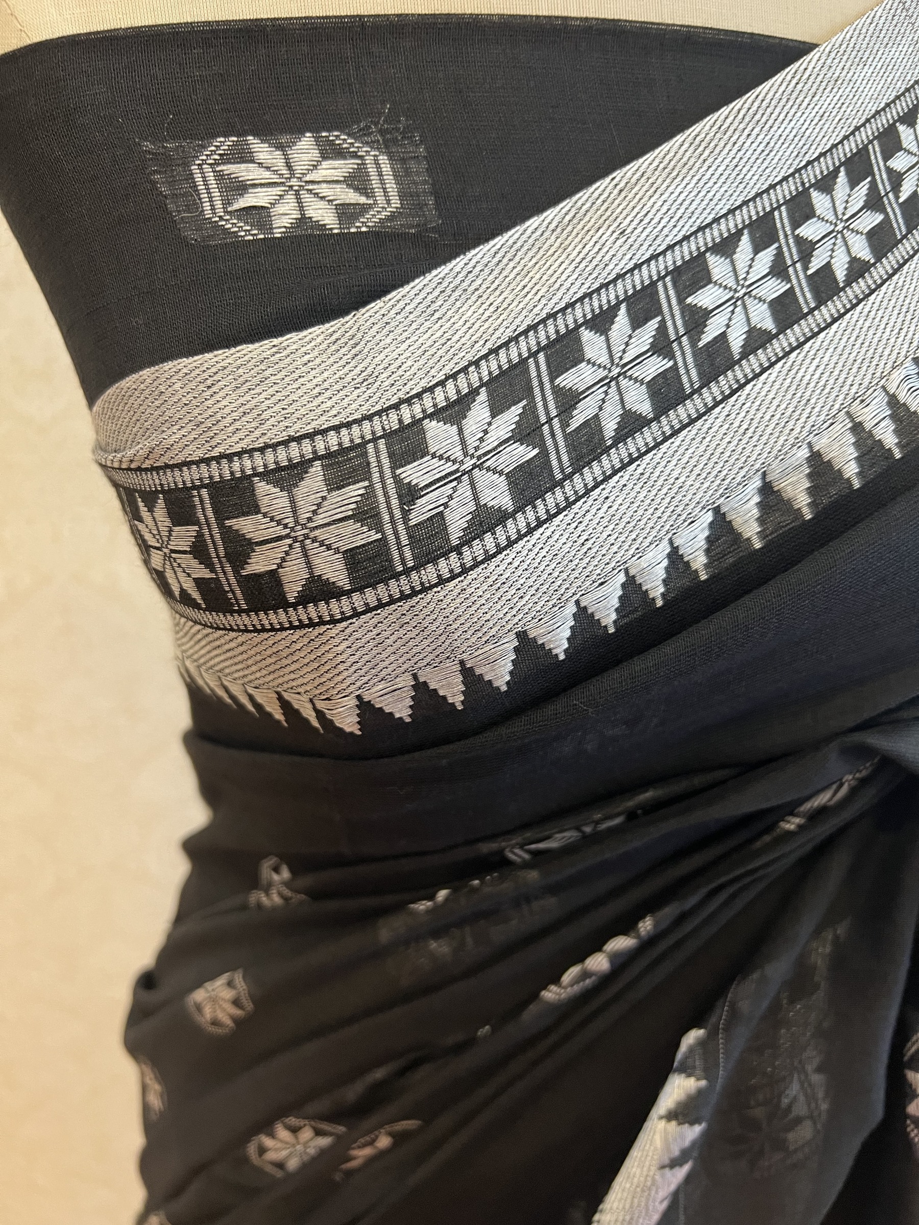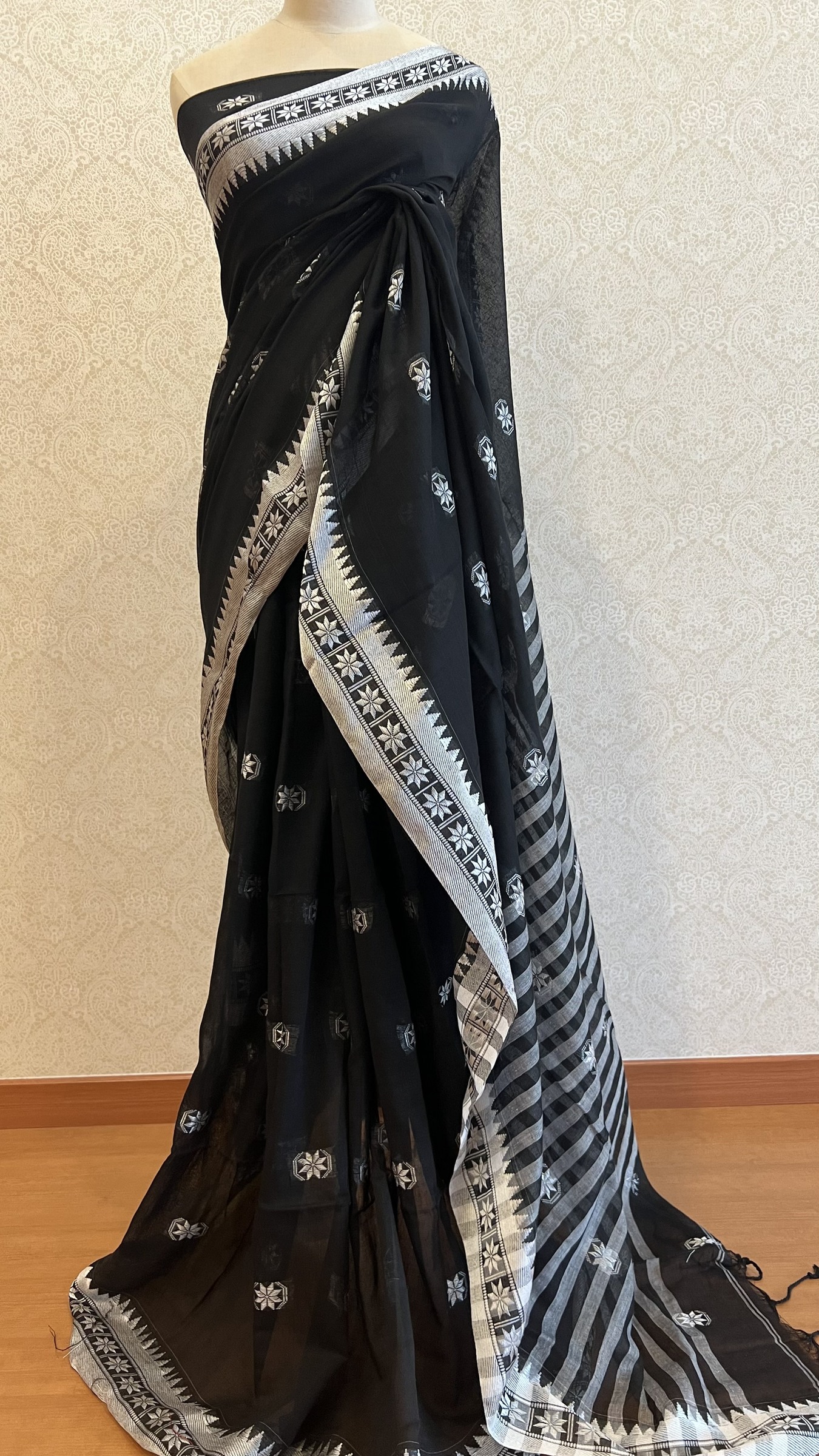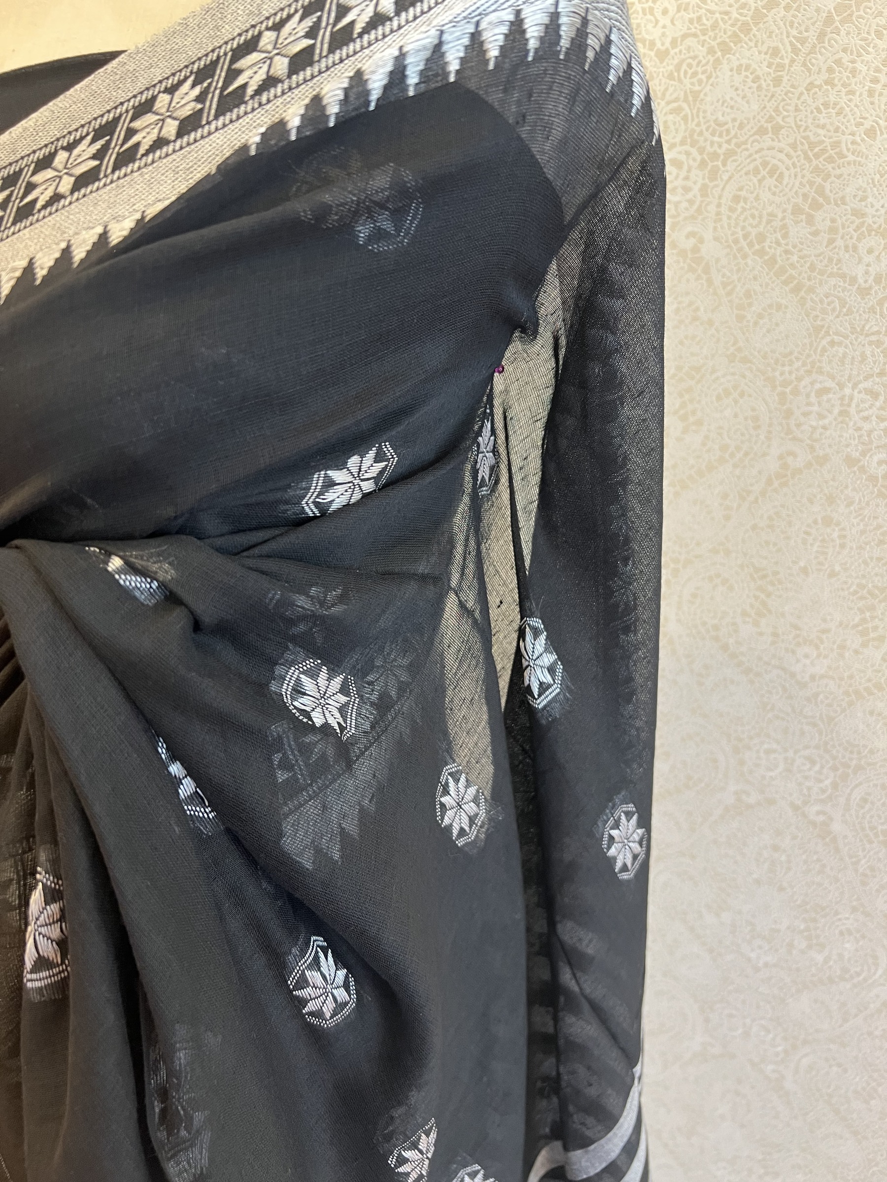 Soft cotton saree from Bengal with buttas design on body and attached running design colour blouse material.